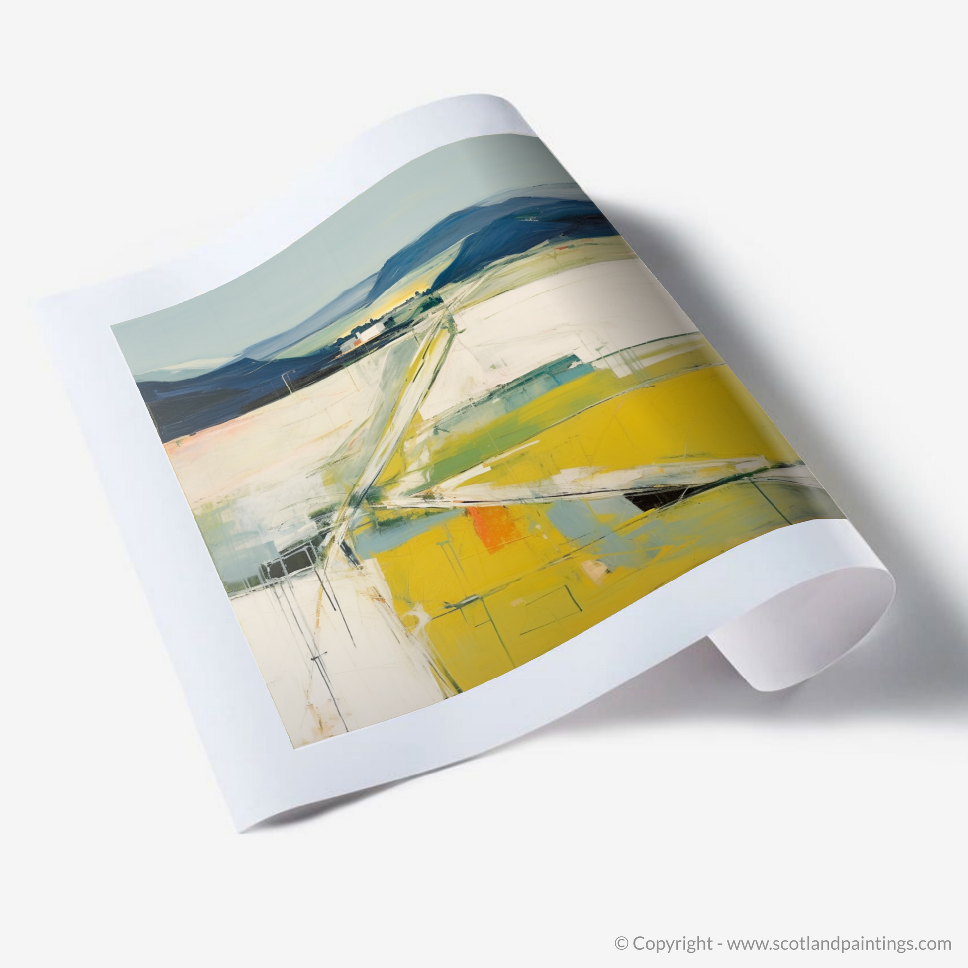The artwork is a vibrant tableau, balancing bold strokes and subtle nuances that transport the viewer to the vast, undulating terrain of the Highlands. Hues of soothing blues and deep purples suggest the distant, majestic peaks and the serene twilight that cloaks them. These cool tones are brilliantly contrasted with bursts of warm yellows and gentle oranges, reminiscent of the rare Scottish sun, bathing the moorlands in a cloak of light and warmth.