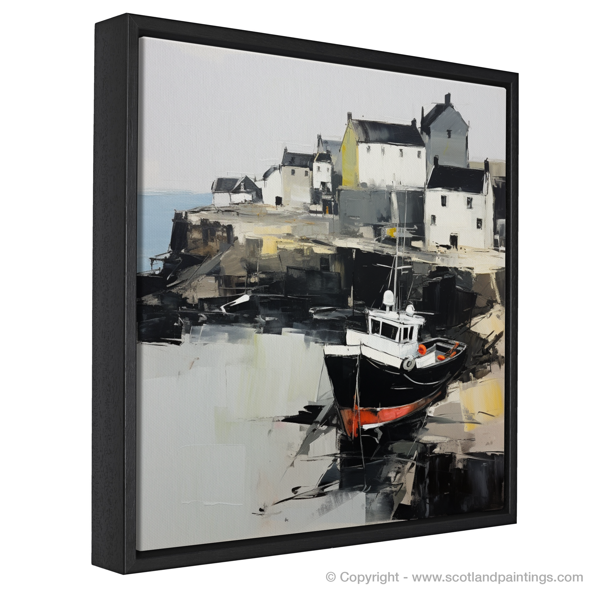 With a whimsical interplay of shadow and light, this captivating print invites you to explore the quaint essence of Portsoy Harbour through an abstract lens. Stark contrasts and bold brushstrokes define the composition, where the marriage of monochrome tones with splashes of sunlit yellow and the robust red of a solitary boat inject life and movement into the serene harbour scene.