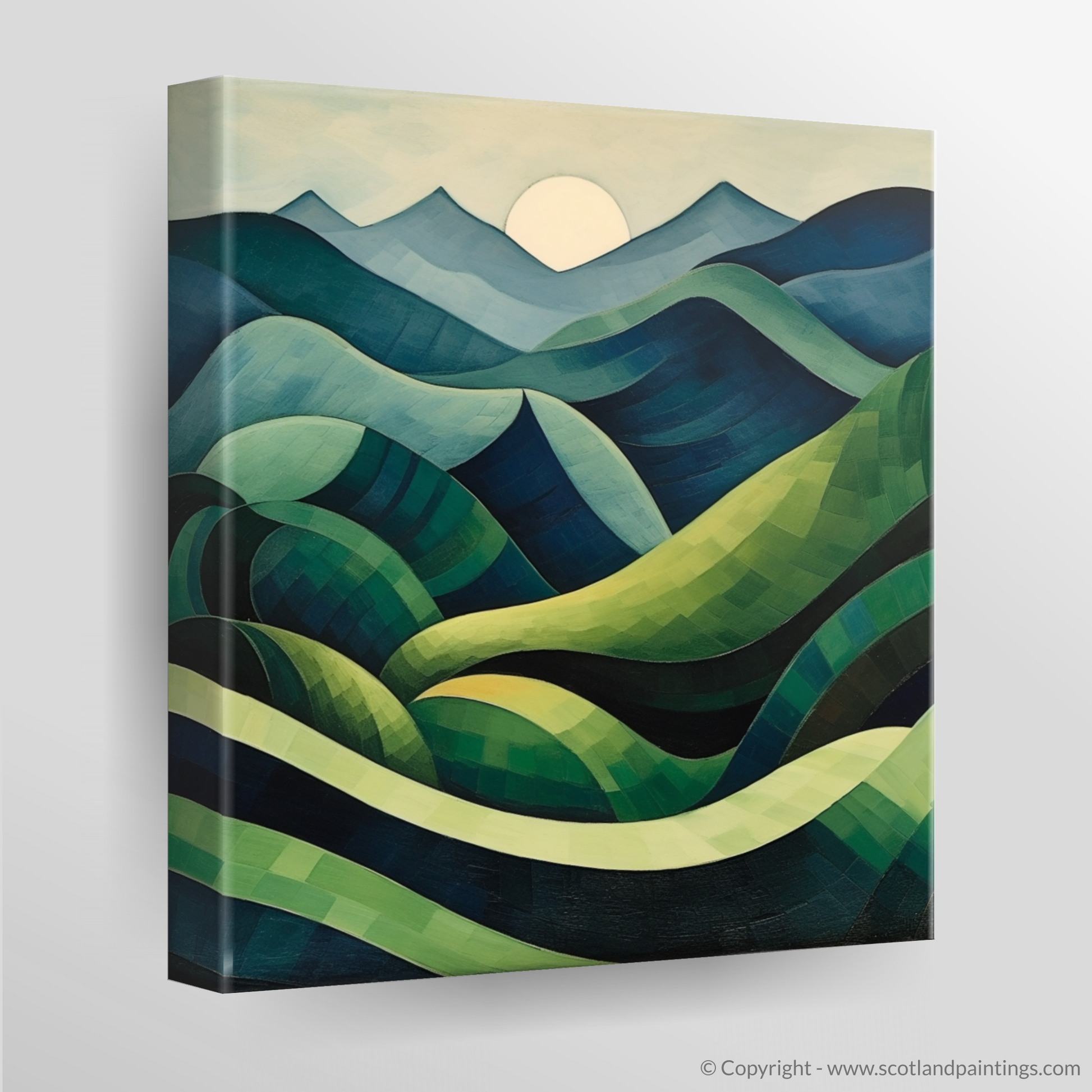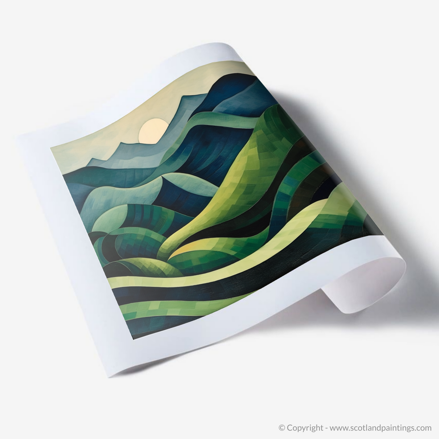 Draped in an abstract tapestry, this evocative print captures the undulating essence of Aonach Eagach, a stark ridge set amidst the wild beauty of the Scottish Highlands. The composition presents a harmonious blend of geometric contours and flowing lines, using a sophisticated palette to shape and elevate the rugged landscape into a lyrical topography. In the fore, rolling waves of verdant hues intersect, giving way to undulating shades of azure that mimic the majestic mountain forms.