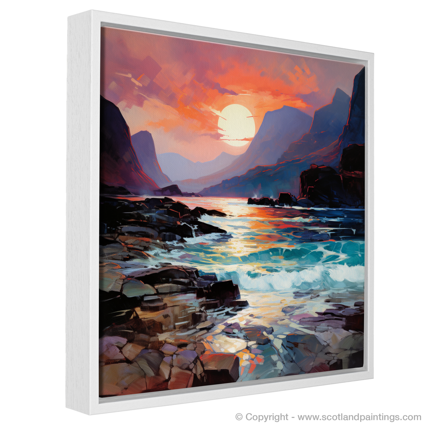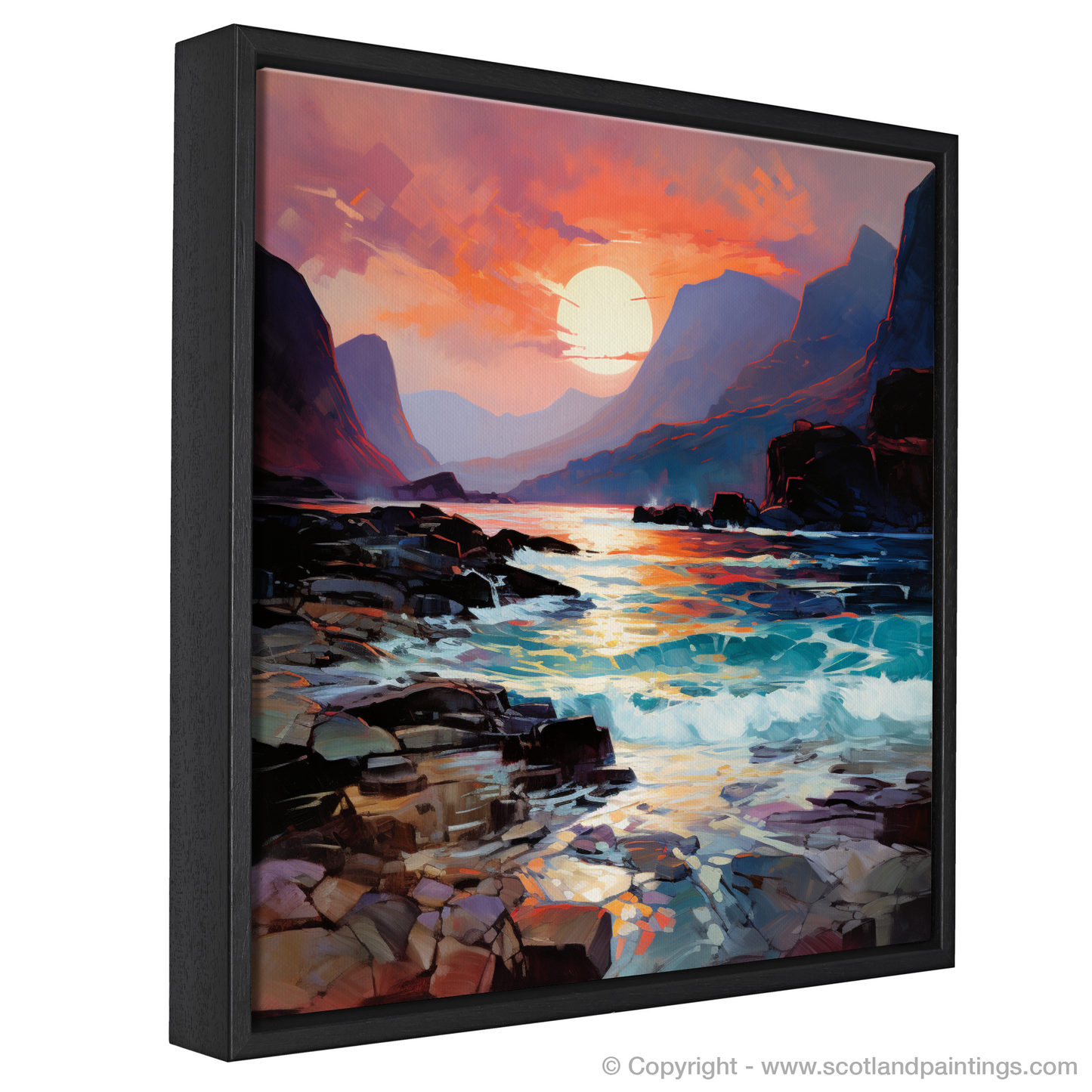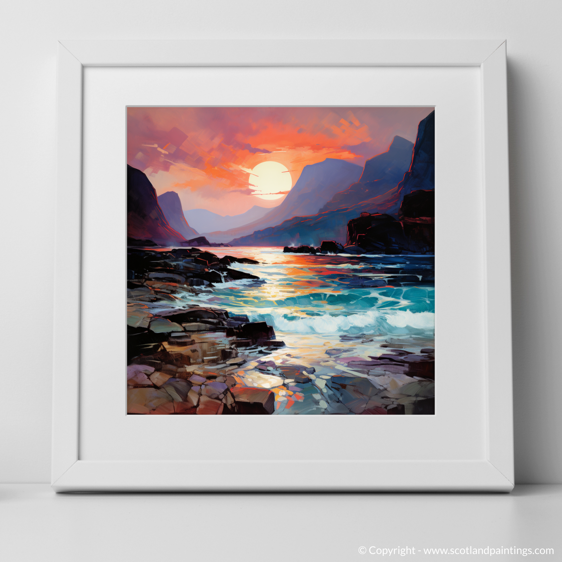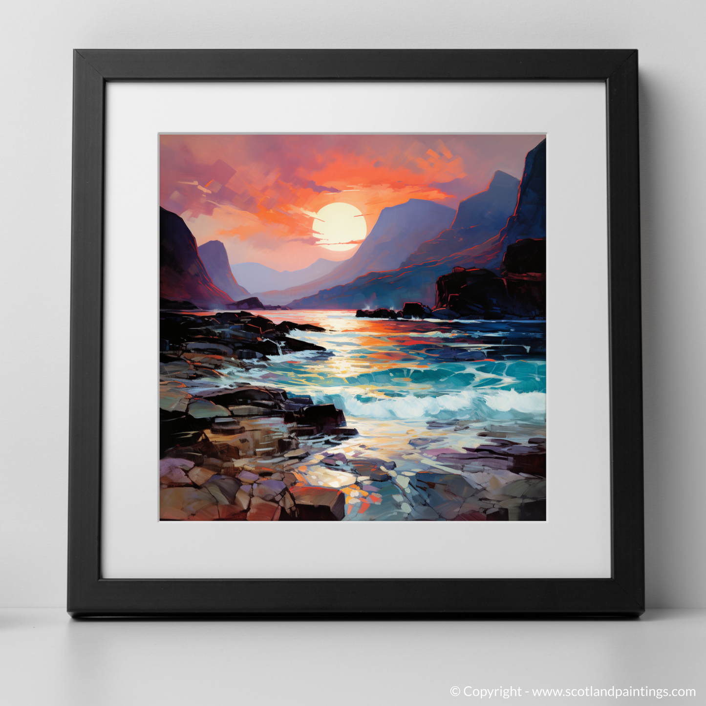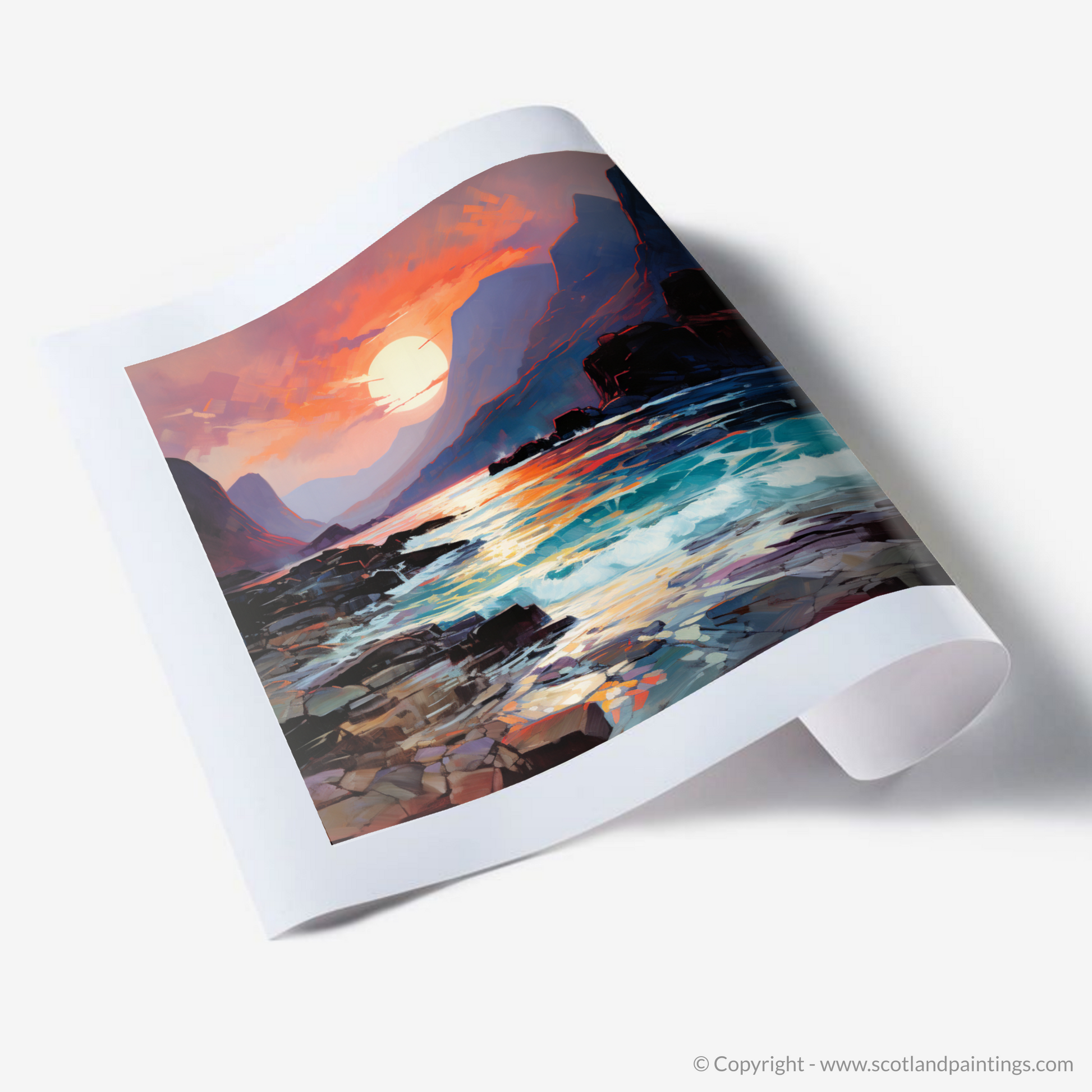 As the sun dips towards the horizon, its flaming orb sets the sky ablaze in a spectacle of vivid oranges, pinks, and purples. This breathtaking view of Elgol Bay at sunset, rendered in the delicate and expressive style of Impressionism, captures the essence of the Scottish cove with a poetic licence that dances across the canvas.