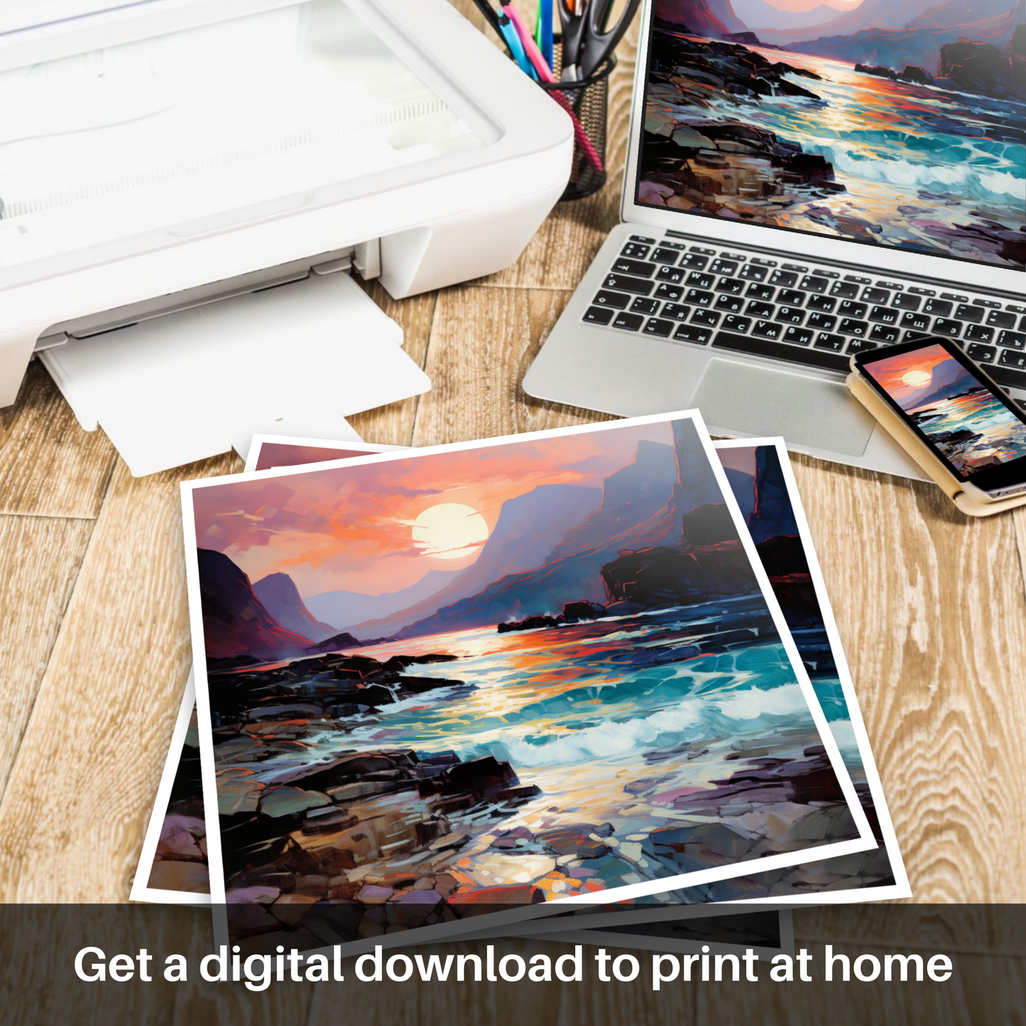 This captivating print from our 'Scottish Coves' collection is more than a depiction of a landscape; it is an invitation to feel the cool breeze on your face, to hear the lull of the waves, and to bask in the fleeting warmth of a Scottish sunset. It is an enduring piece that will bring the wild, untamed beauty of Scotland into any space it adorns.