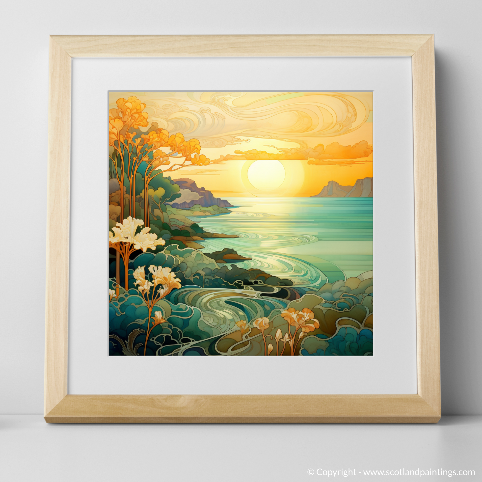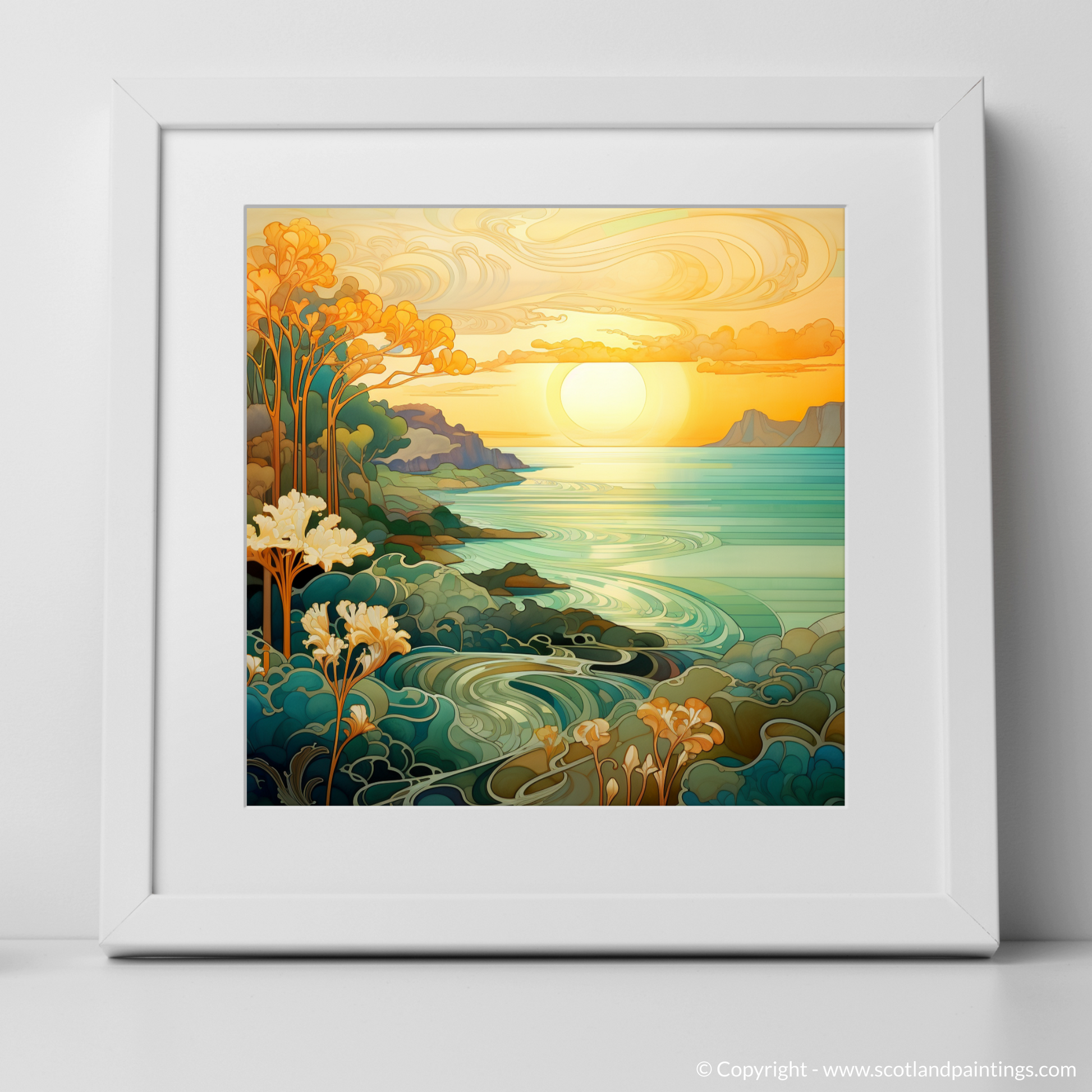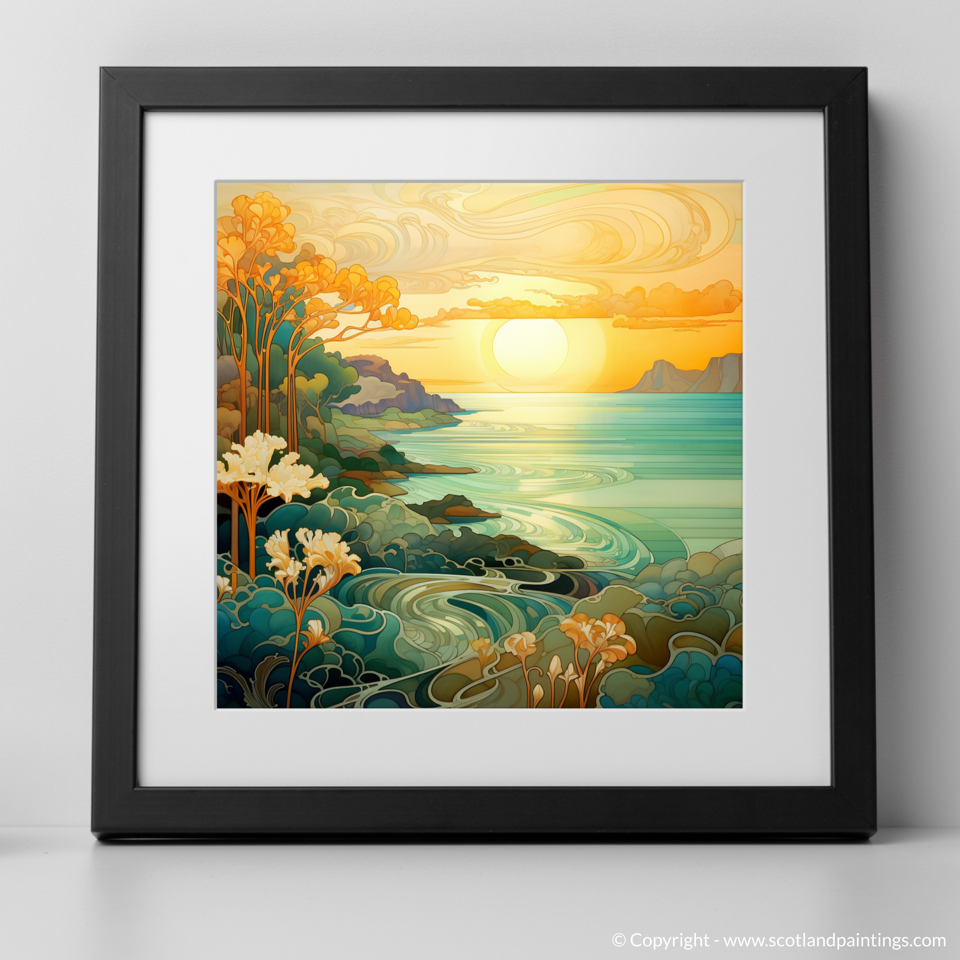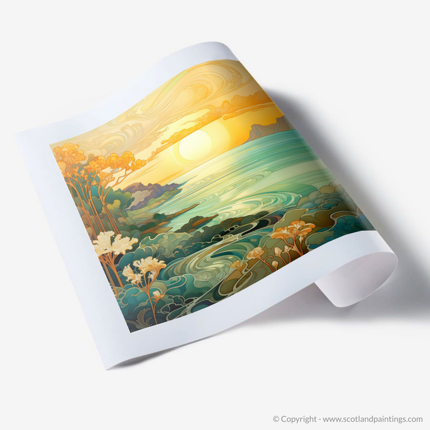Immerse your senses in the enchanting serenity of the Scottish coast with our inspiring print that captures the majestic beauty of Ardtun Bay at the most magical time of day. This exquisite piece elegantly blends the distinctive curves and natural motifs characteristic of Art Nouveau with the sublime tranquillity of a Scottish Cove bathed in the warm, glowing embrace of golden hour.
