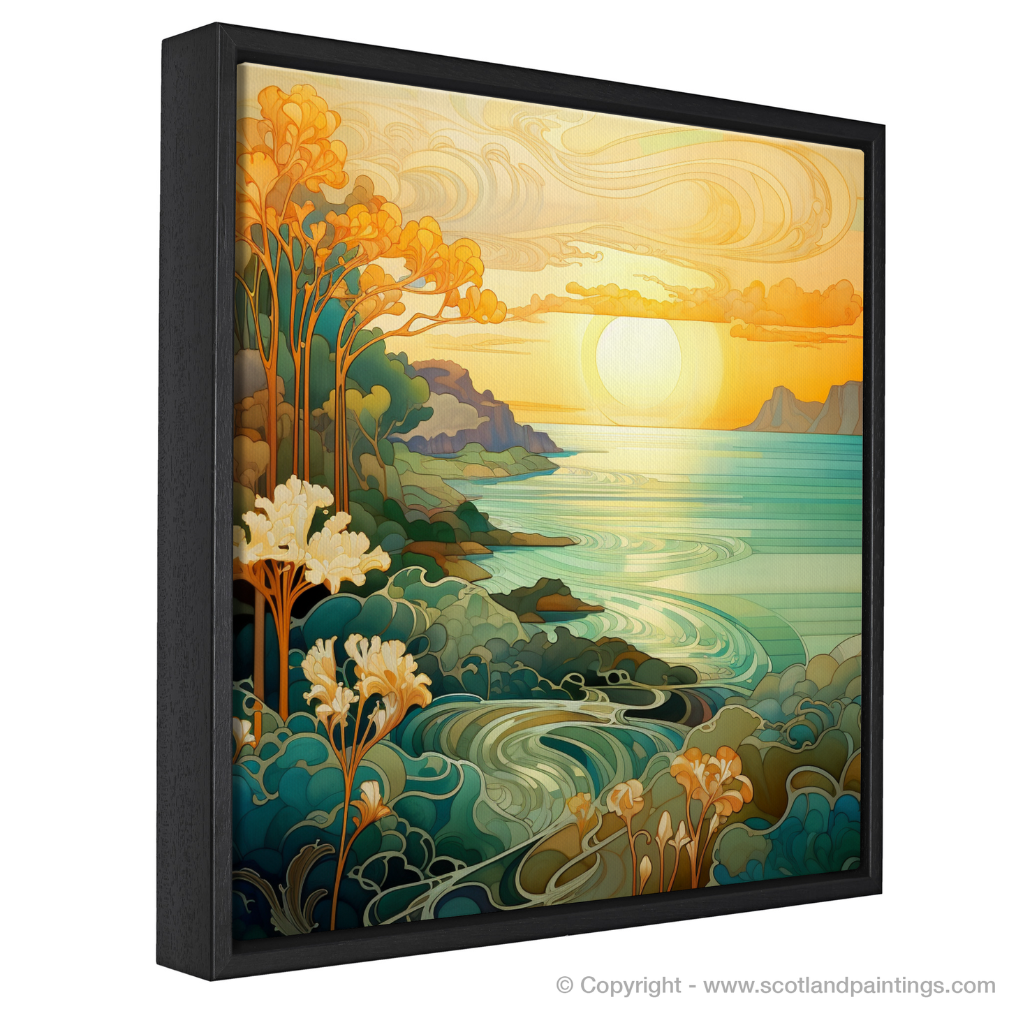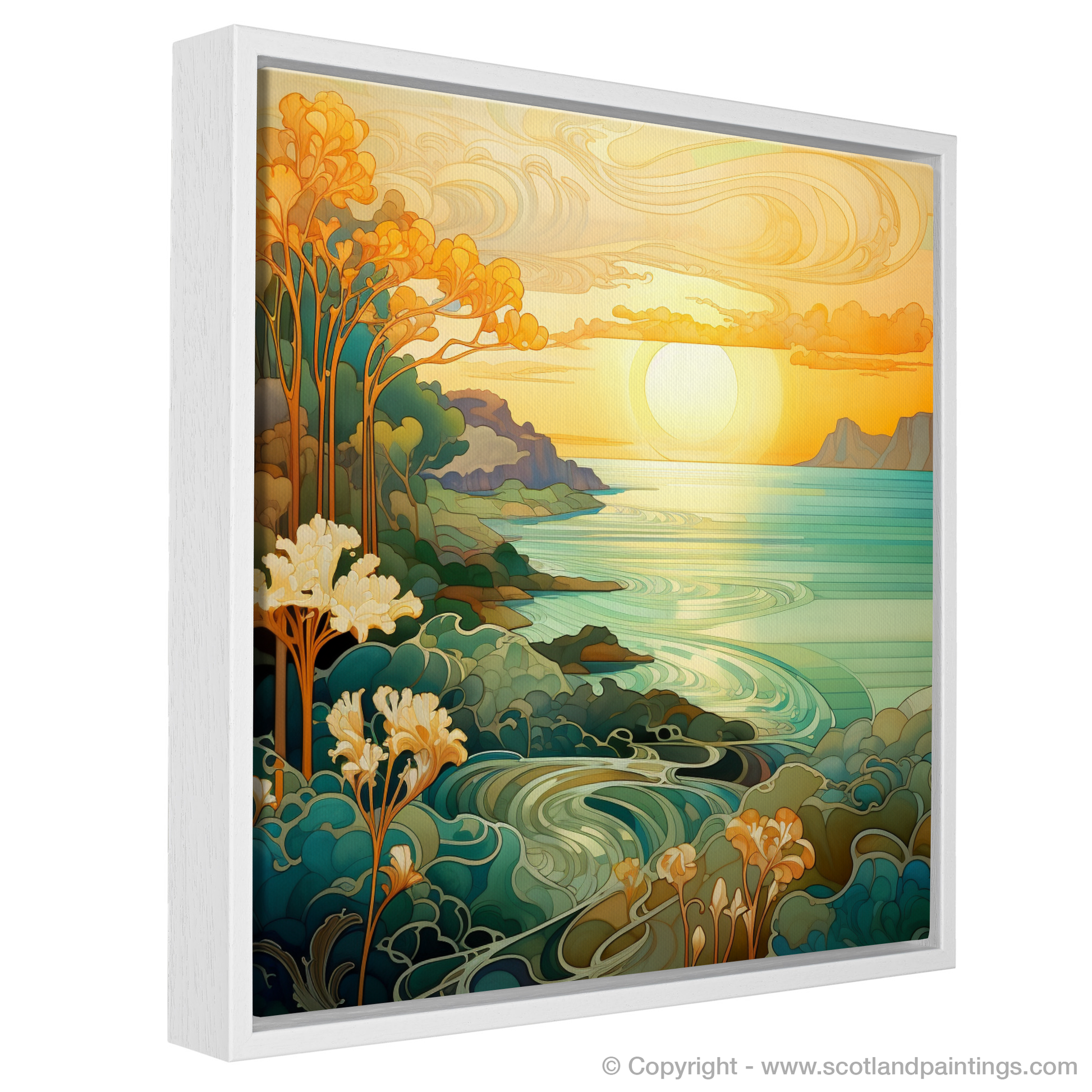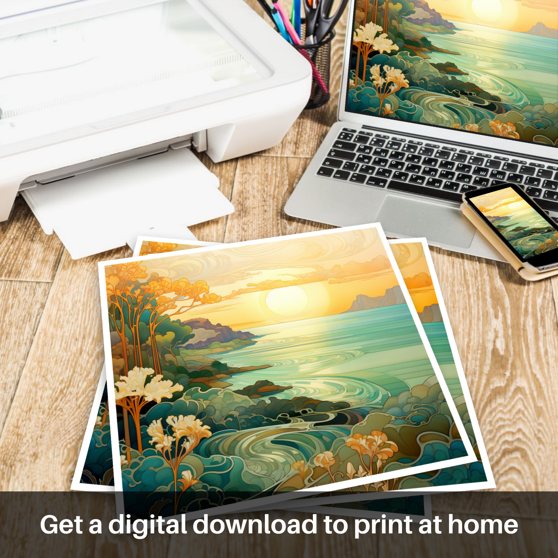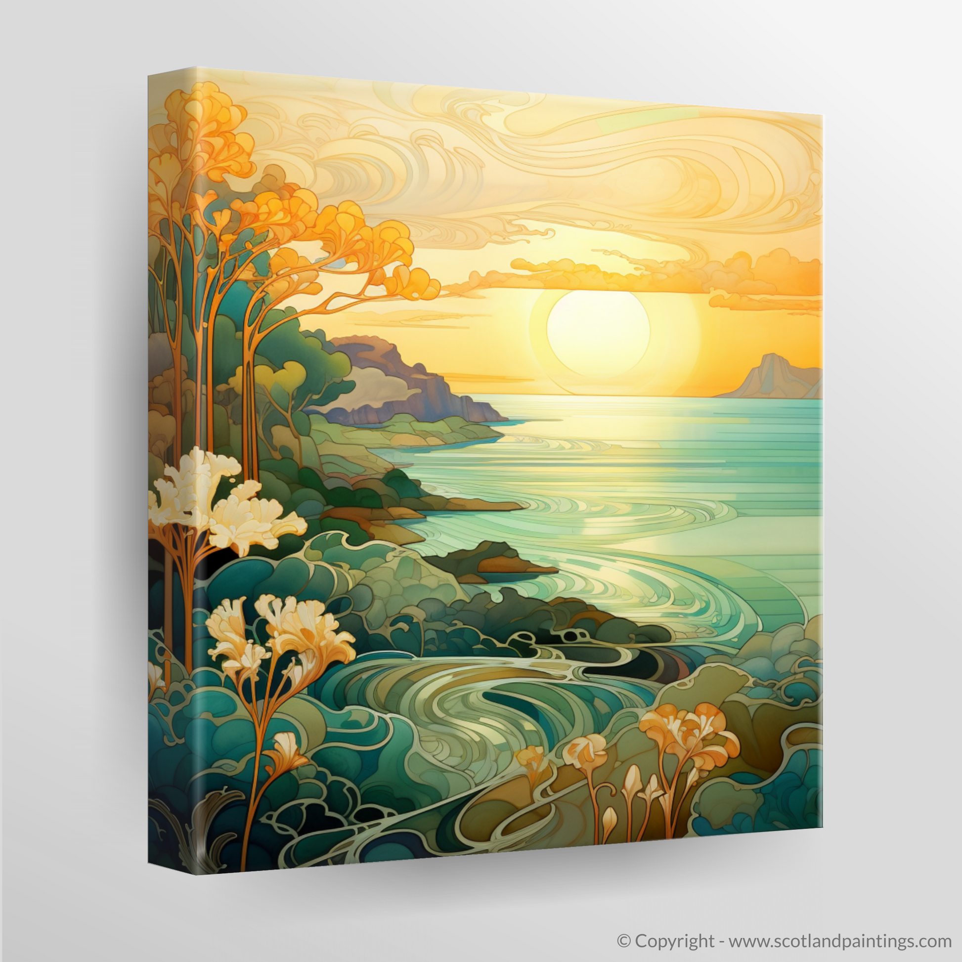 Immerse your senses in the enchanting serenity of the Scottish coast with our inspiring print that captures the majestic beauty of Ardtun Bay at the most magical time of day. This exquisite piece elegantly blends the distinctive curves and natural motifs characteristic of Art Nouveau with the sublime tranquillity of a Scottish Cove bathed in the warm, glowing embrace of golden hour.