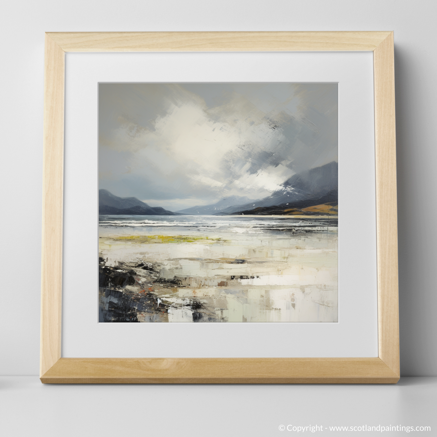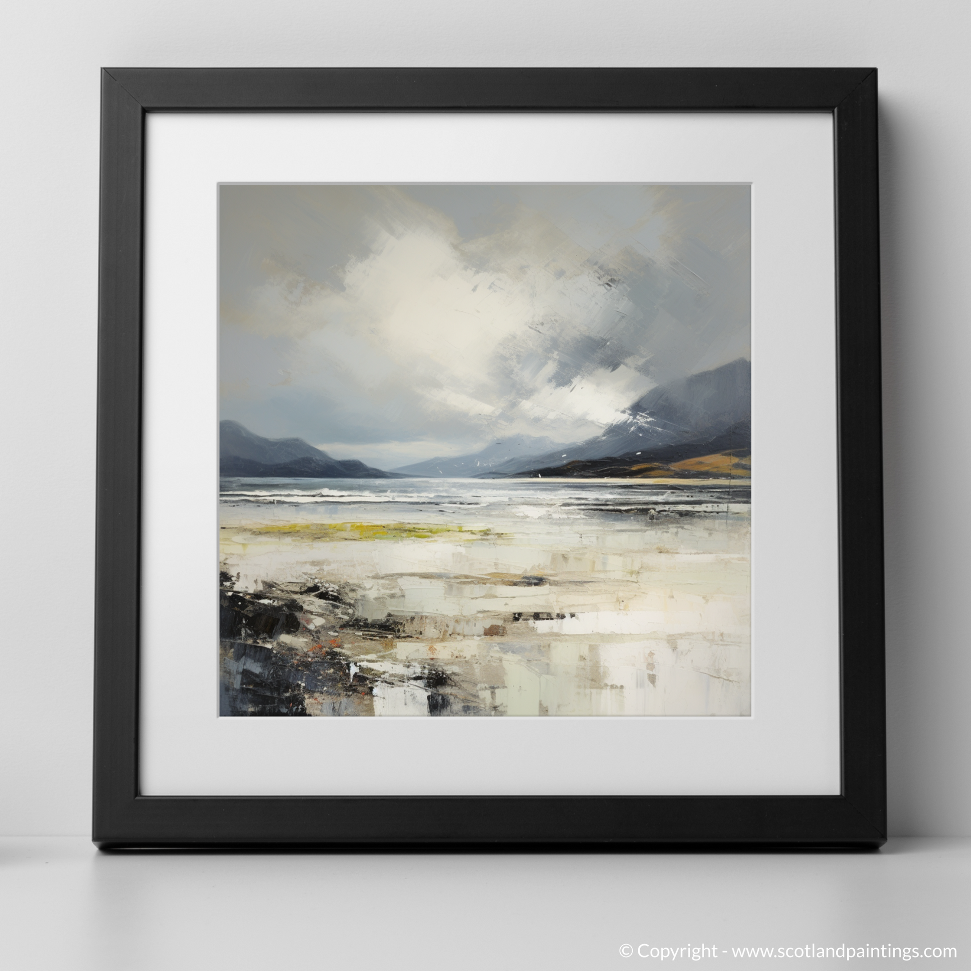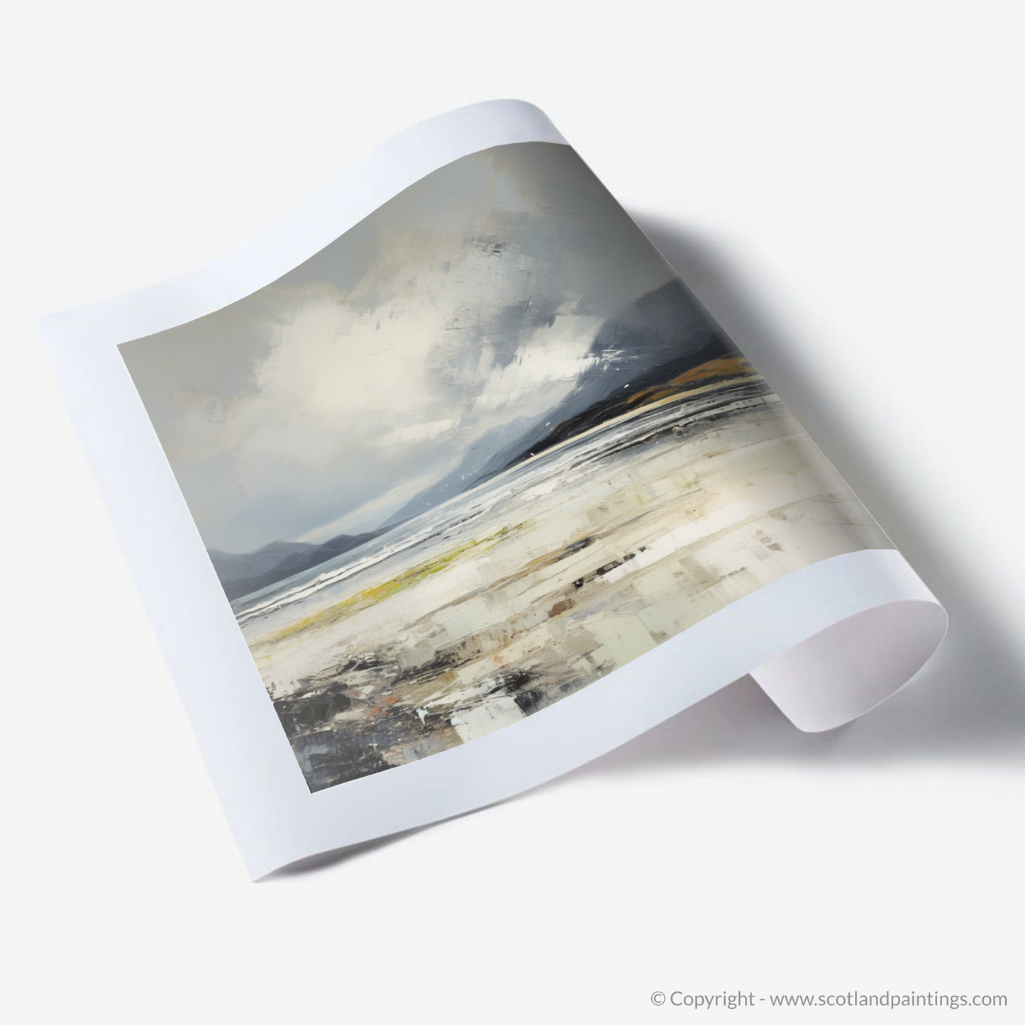 Experience the stark yet serene beauty of the Scottish coast with this evocative print capturing the essence of Camusdarach Beach under a tumultuous sky. The juxtaposition of calm and storm is captured through a minimalist lens, rendering the tumult of nature in a style that conveys both peace and power.
