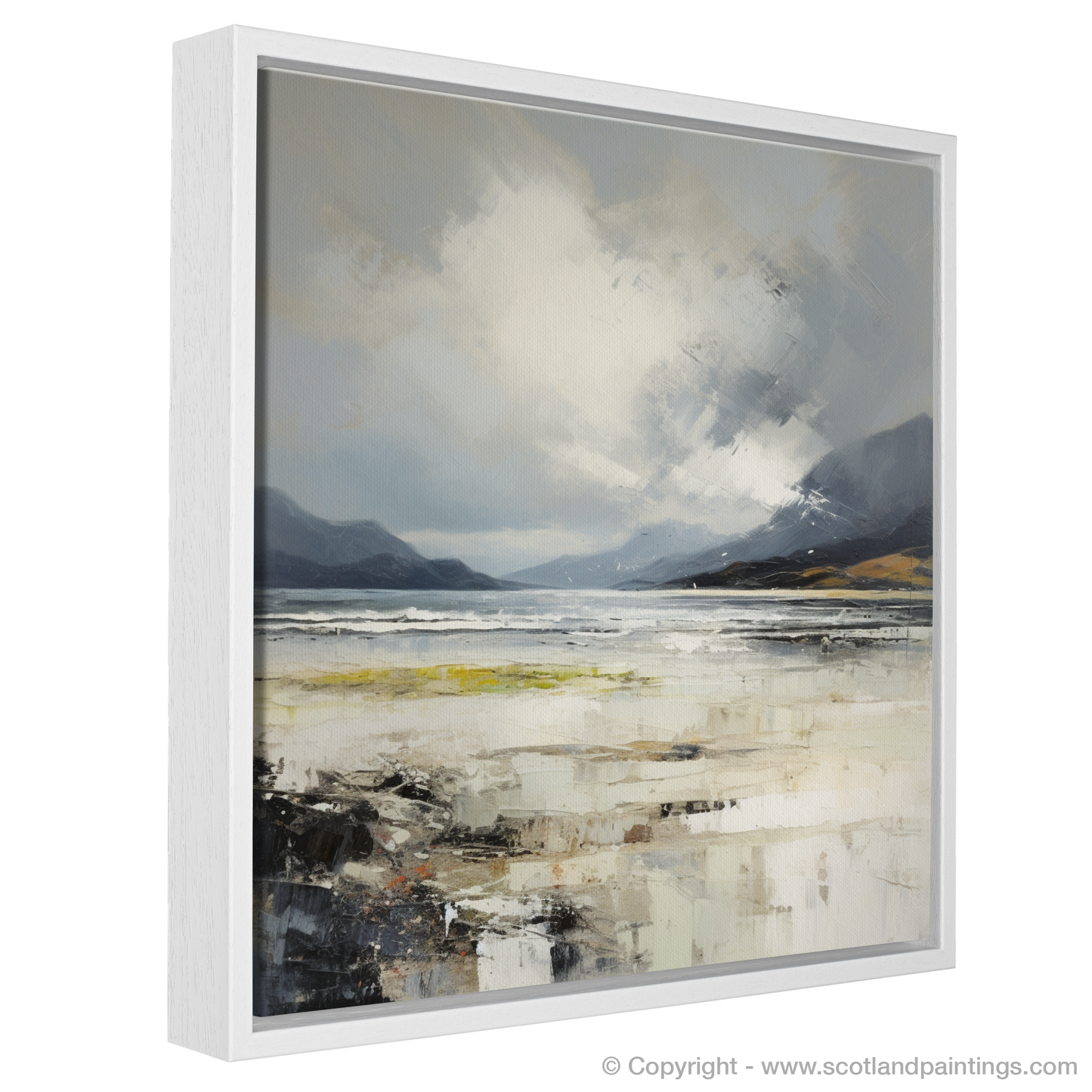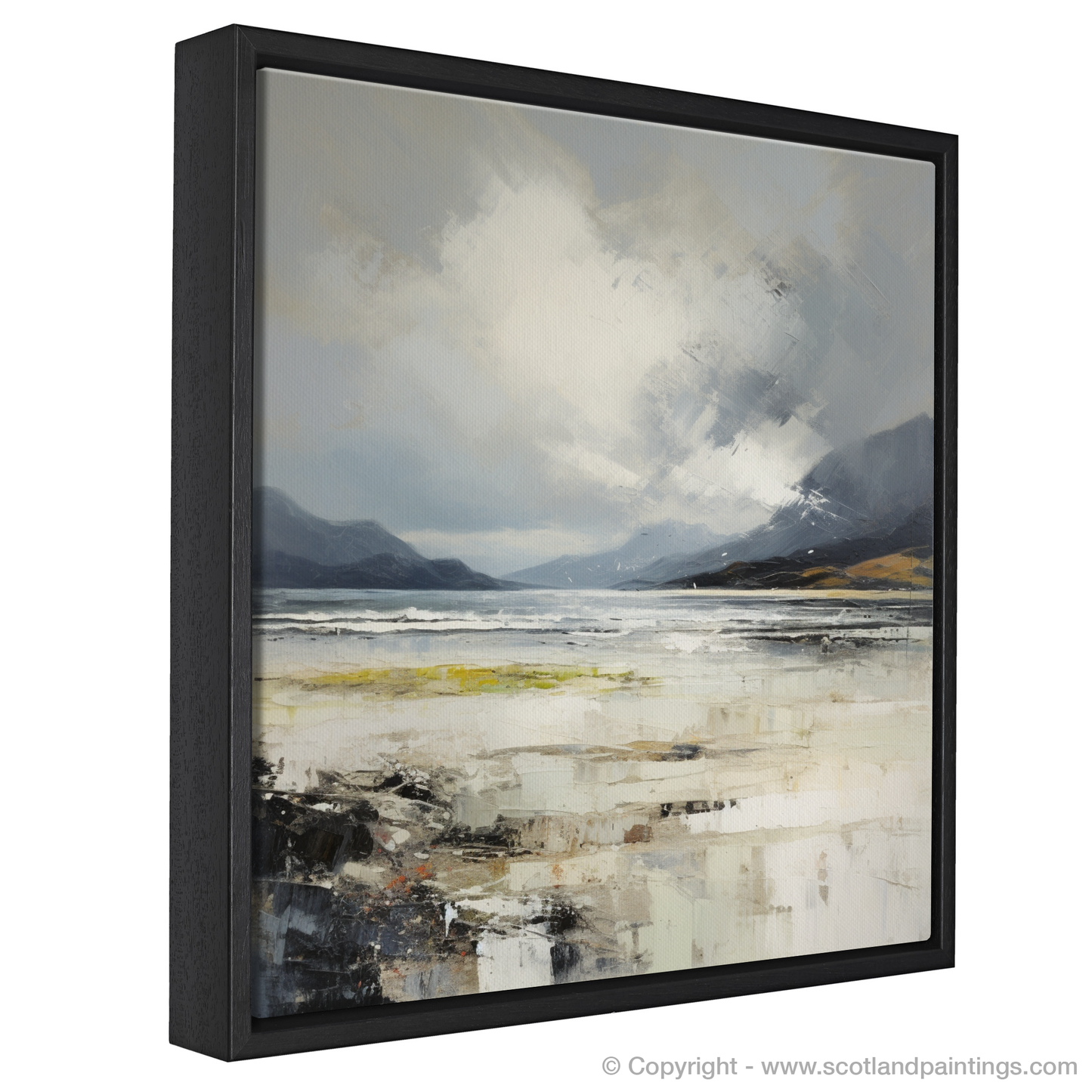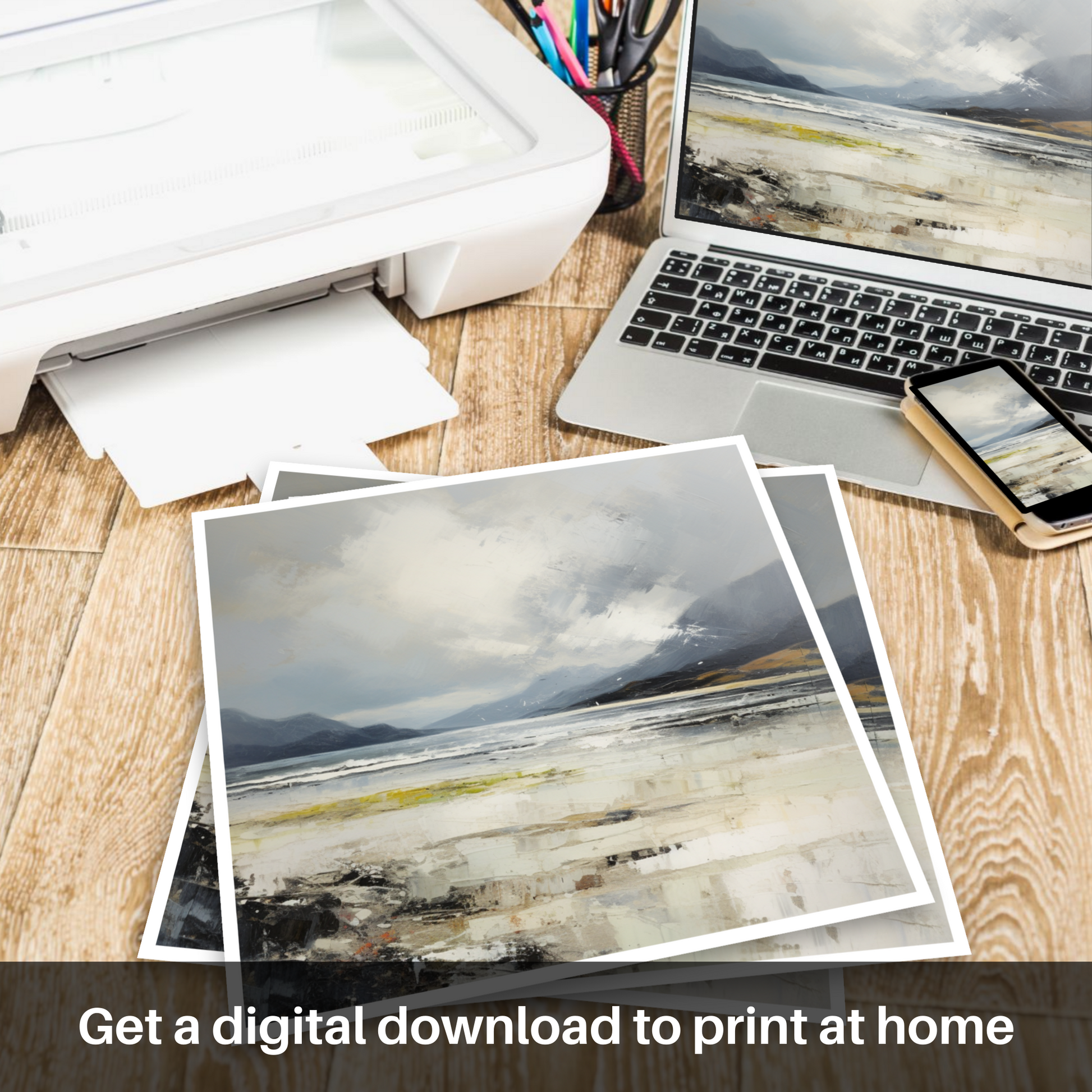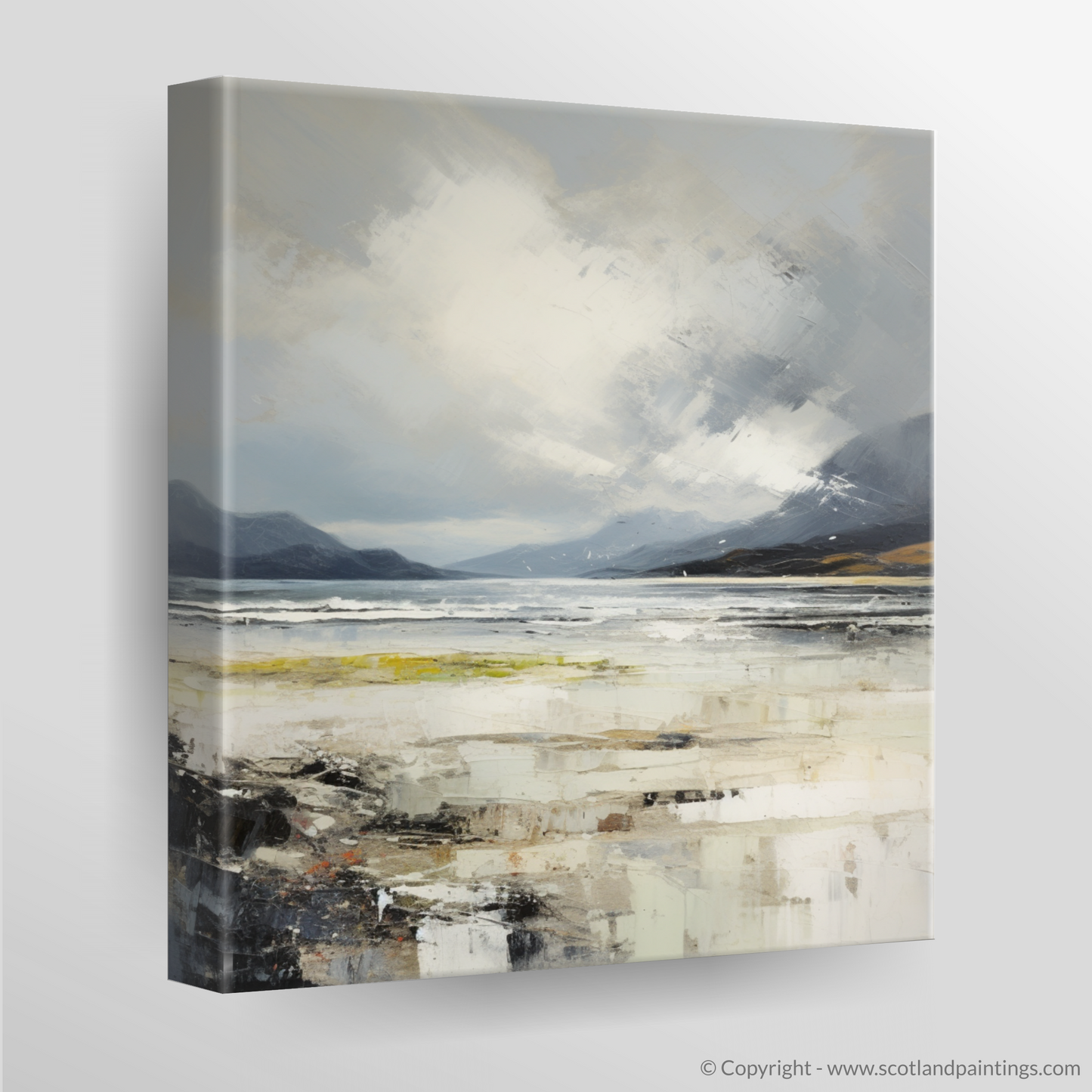 Experience the stark yet serene beauty of the Scottish coast with this evocative print capturing the essence of Camusdarach Beach under a tumultuous sky. The juxtaposition of calm and storm is captured through a minimalist lens, rendering the tumult of nature in a style that conveys both peace and power.