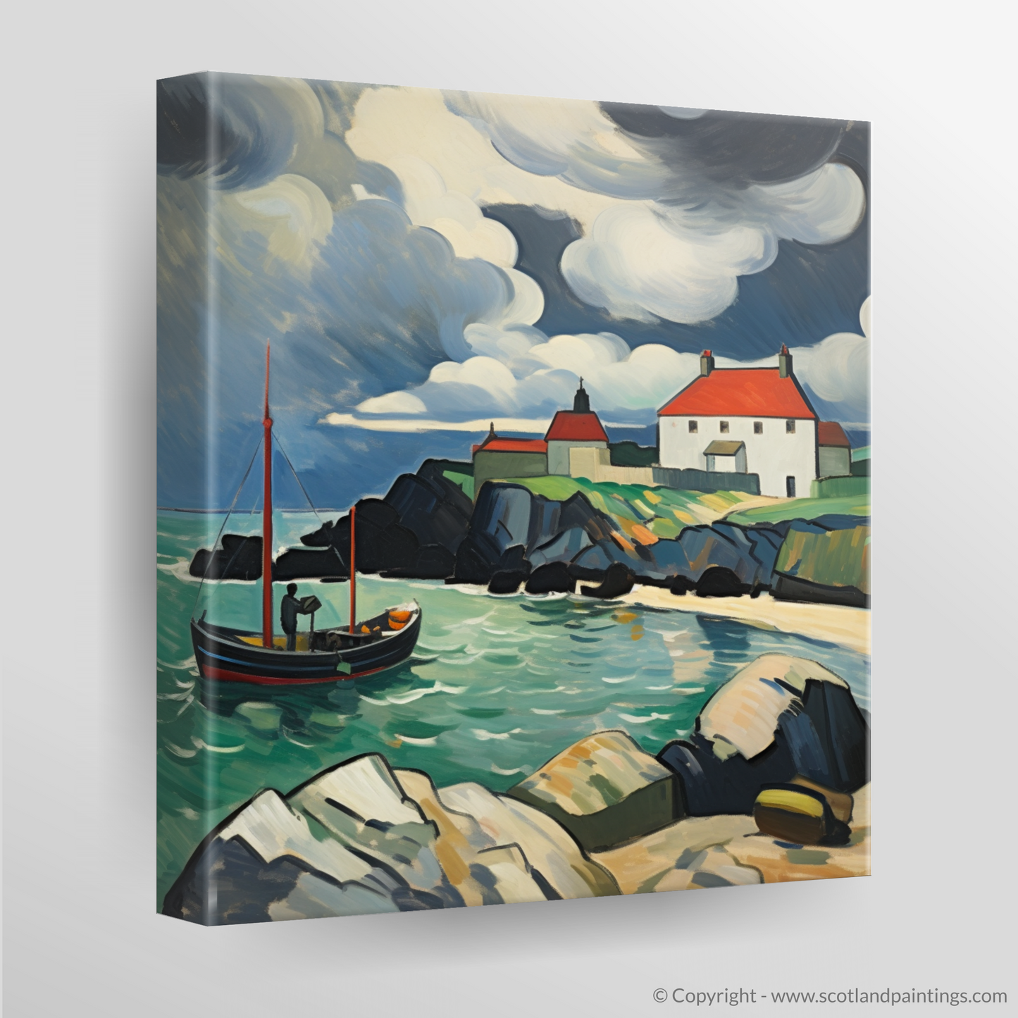 A visual symphony of colour and emotion captures the rugged essence of Lybster Harbour in this vivid portrayal, inspired by the raw beauty of Scotland's coastal scenery. The tumultuous energy of the stormy sky, composed of swirling clouds in shades of grey and white, sets a dramatic backdrop to the serene harbour below. Bold brushstrokes and the distinct use of fauvist style lend this scene its powerful and emotive character, with non-naturalistic colours dominating the palette.