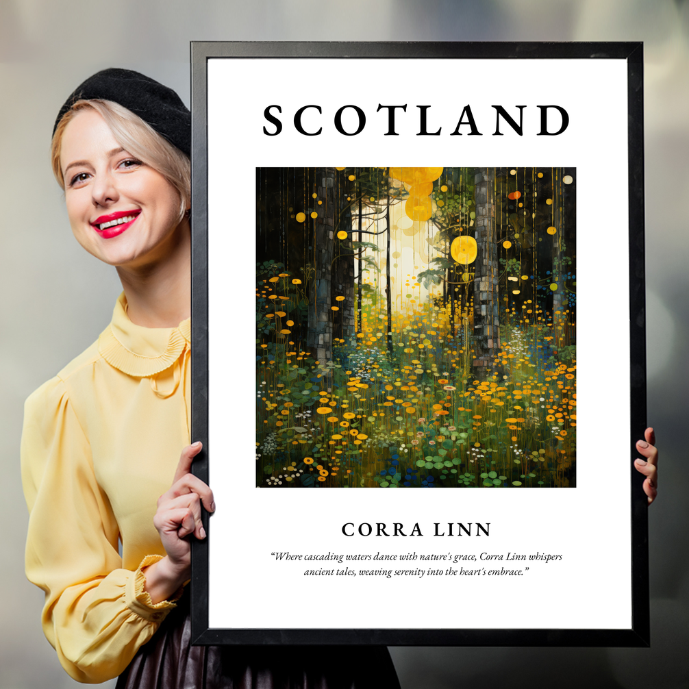 This captivating poster features "SCOTLAND" prominently in bold lettering, leading the eye to a breath-taking depiction of Corra Linn. Rendered in the timeless Art Nouveau style, the painting is a symphony of flowing lines and harmonious colours, capturing the essence of the waterfalls and the surrounding lush flora. Below this visual feast, the words “Where cascading waters dance with nature's grace, Corra Linn whispers ancient tales, weaving serenity into the heart's embrace” add a poetic touch, inviting reflection and connection to the natural world.
