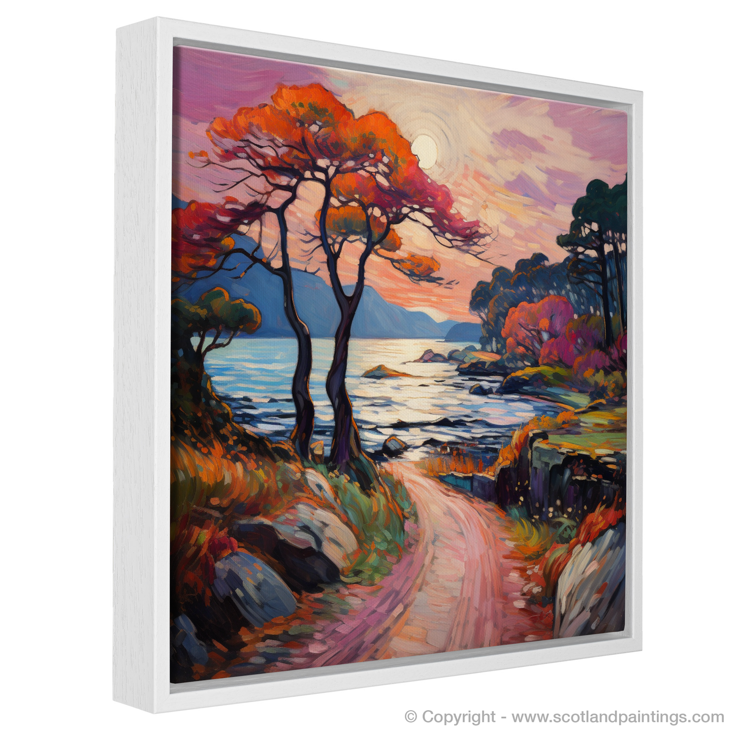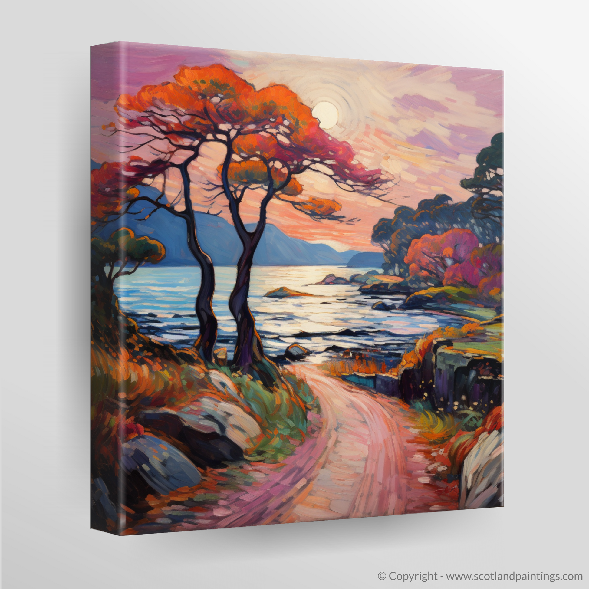 The composition beckons you down a winding path, flush with warm pinks and oranges that mimic the inherent radiance of a highland sunset. The path, bordered by rustic stone walls, leads the eye towards the heart of the painting – a serene loch cradled by distant hills that whisper of adventure and natural beauty.