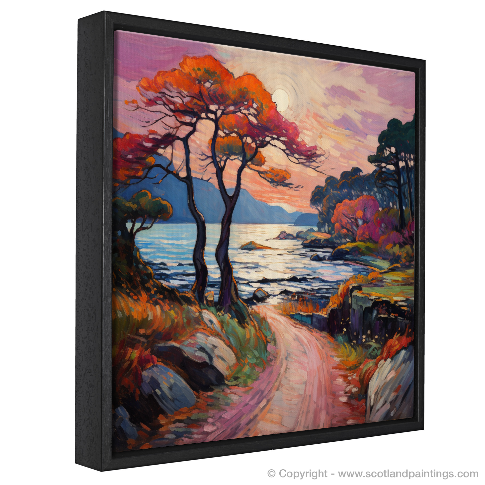 Let the vibrant hues of the Highlands ignite your senses with this captivating print from our 'Scottish Lochs' collection. The dynamic scenery, inspired by the serene Loch Katrine in Stirling, is portrayed through a Fauvist lens, alive with exuberance.