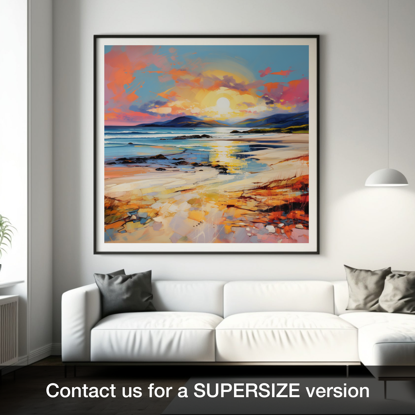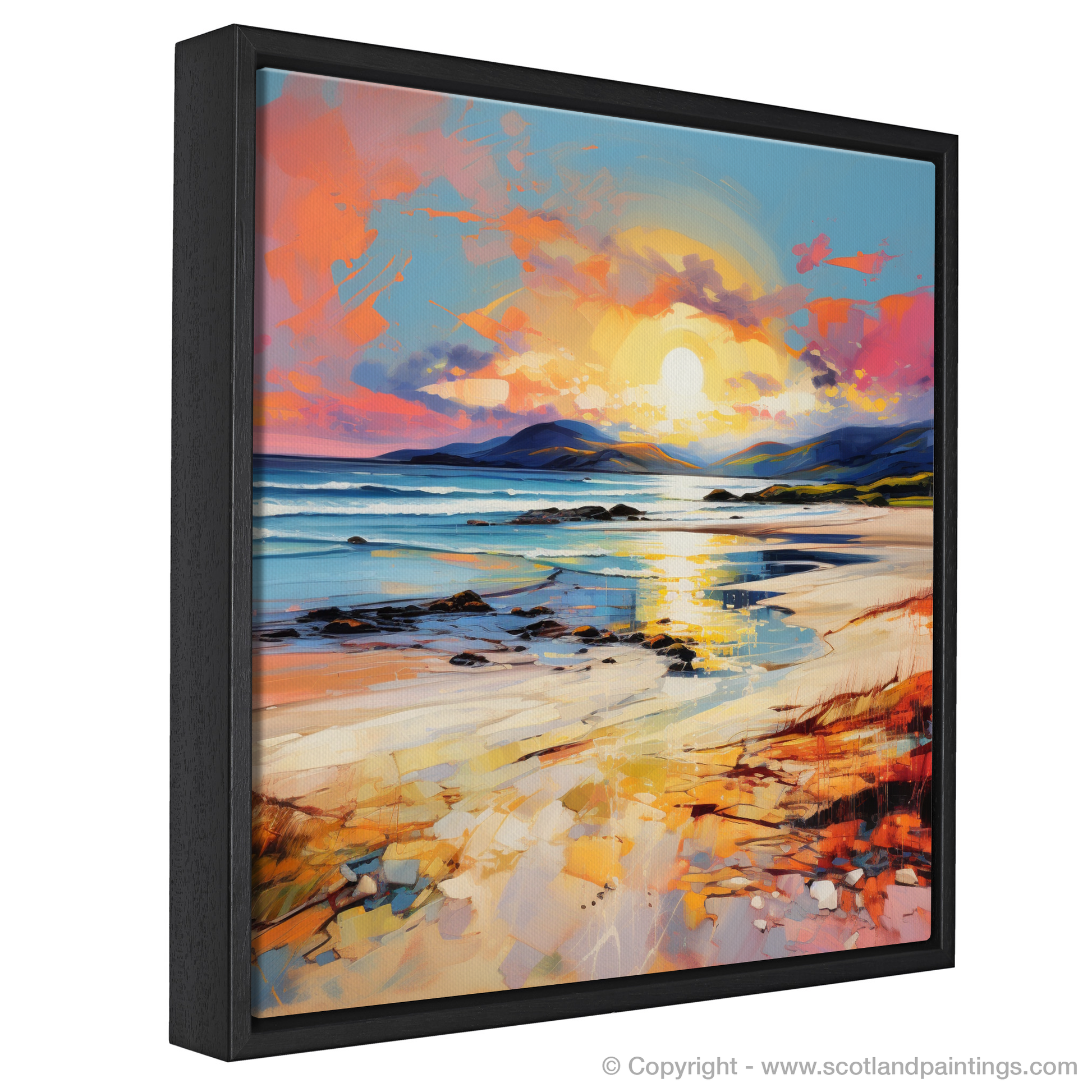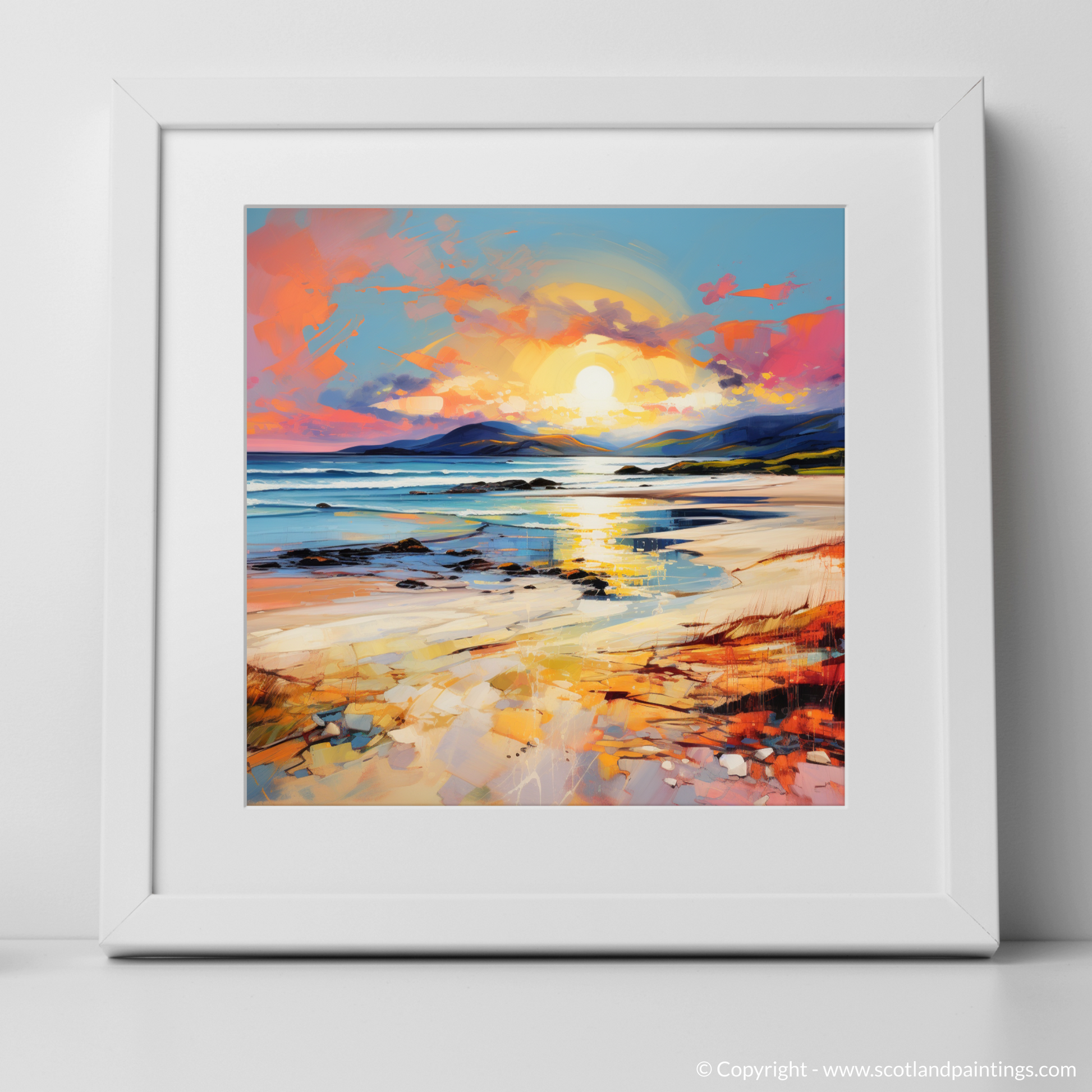 Capturing the essence of tranquillity and the sublime beauty of nature, this exquisite print transports viewers to the serene shores of Scarista Beach. Crafted in the evocative 'Color Field' style, the artwork mesmerises with a harmonious spectacle of colours that mimic the gentle caress of golden hour upon the land and sea.