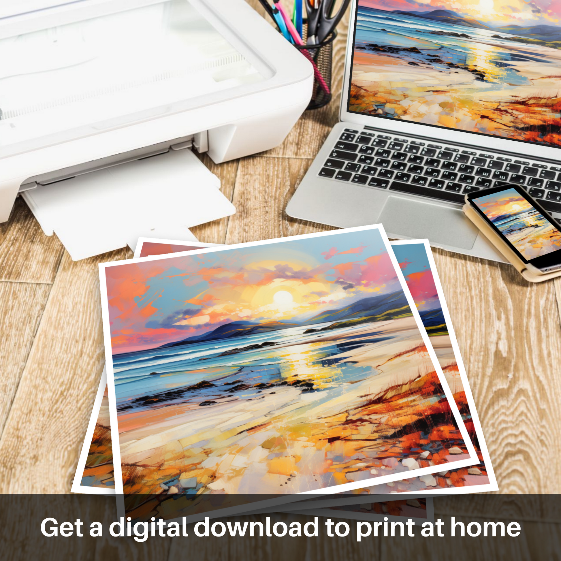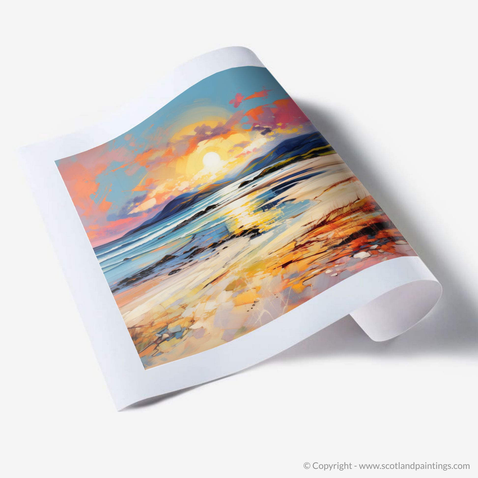 Perfect for those who cherish the wild and unspoilt landscapes of Scotland, this print is a testament to the quiet beauty of its beaches and the timeless enchantment of nature's display at the end of the day. It is a piece that will add a touch of contemplative beauty to any space, offering a window to the soulful moments where land, water, and sky meet in a silent symphony of colour and light.