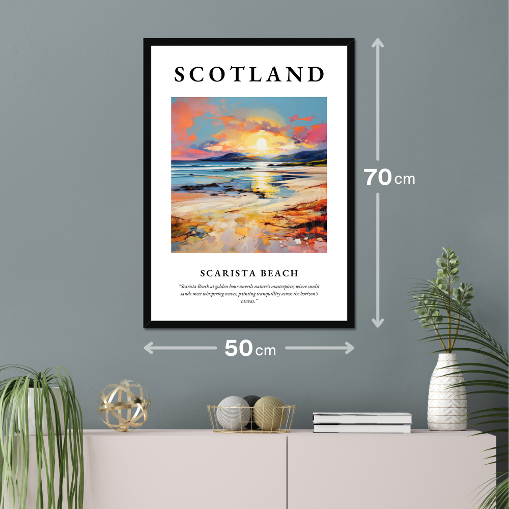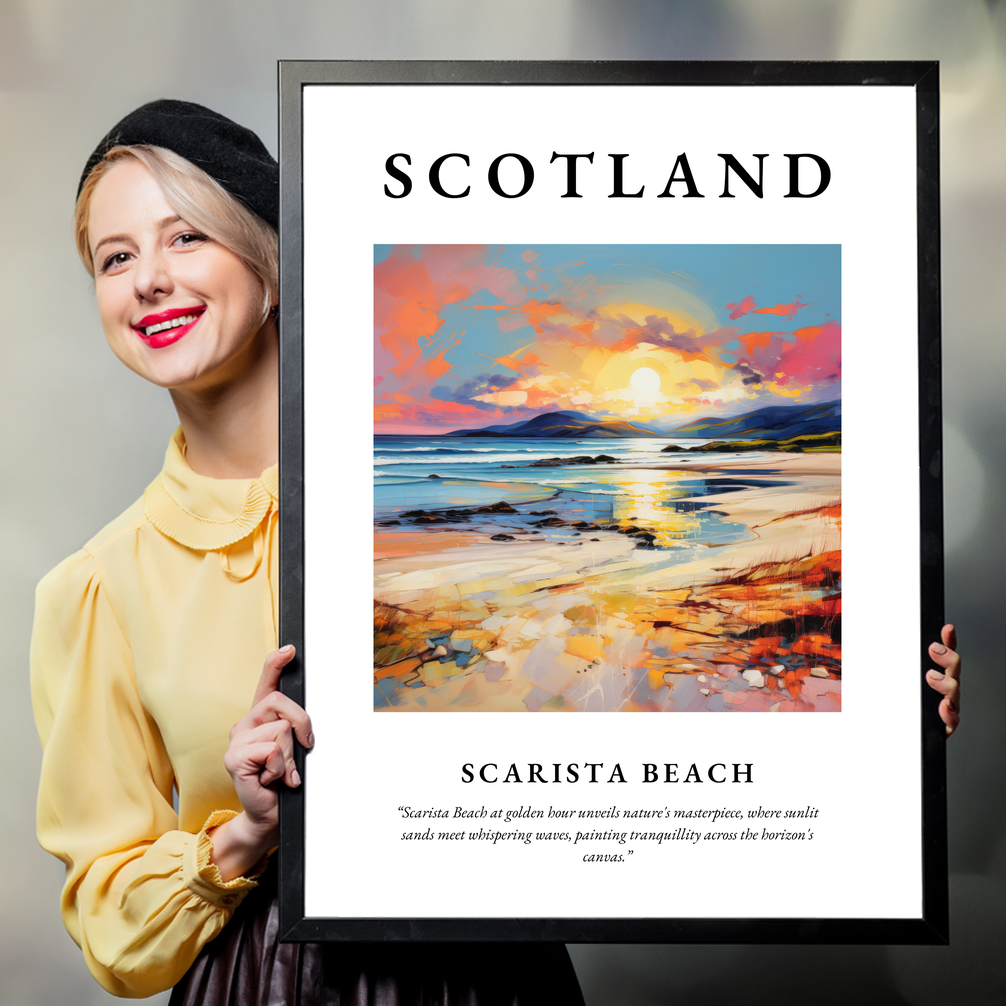 Immerse yourself in the serene beauty of Scotland’s coastline with our 50cm x 70cm framed poster print of Scarista Beach. Featuring bold typography, "SCOTLAND" crowns this breathtaking work of art, inviting you to explore the tranquil shores captured below. The painting embodies the "Color Field" style, creating a vivid tableau of Scarista Beach during the golden hour, where warm sands meet the hushed whispers of the waves, offering a tranquil expanse that resonates with nature’s finest.
