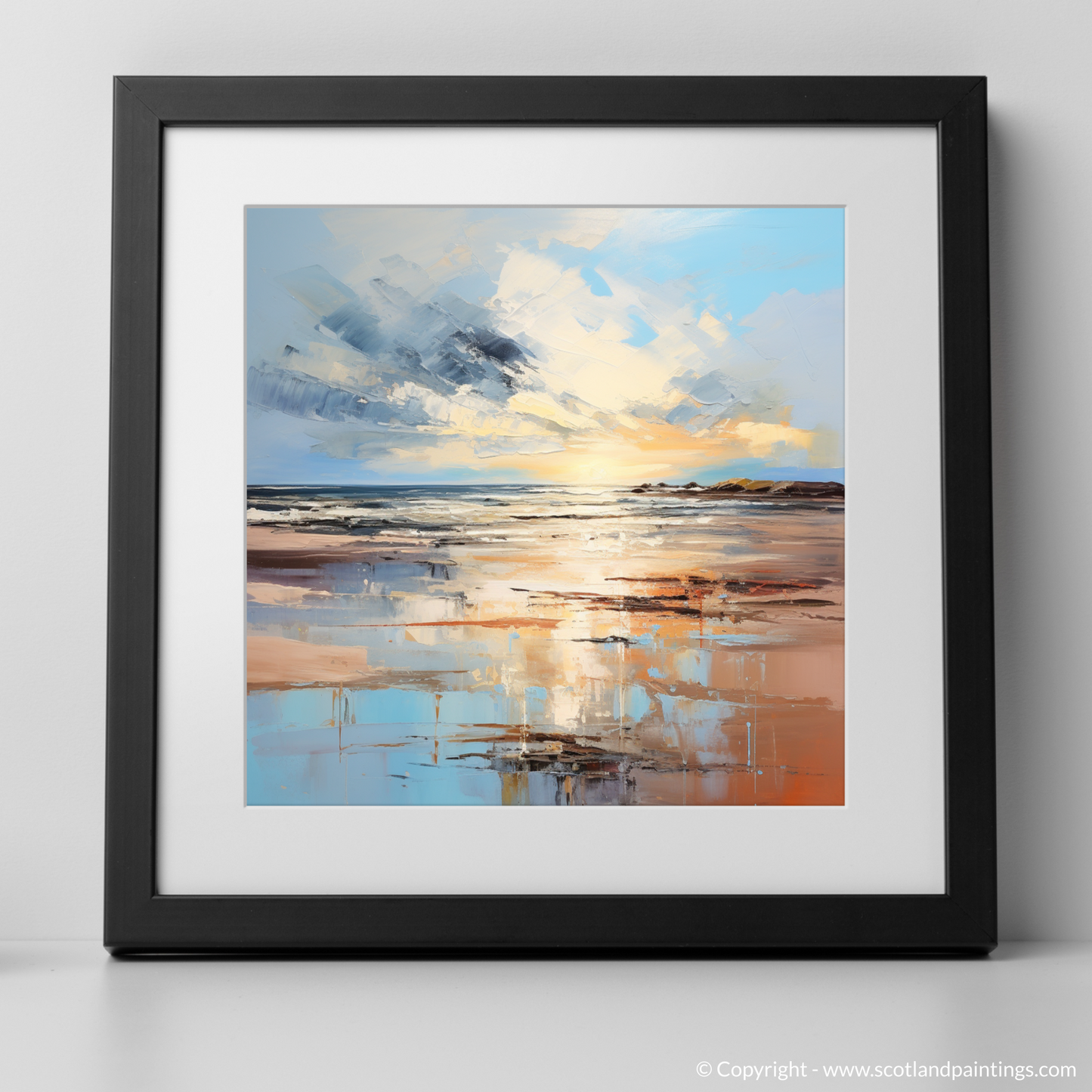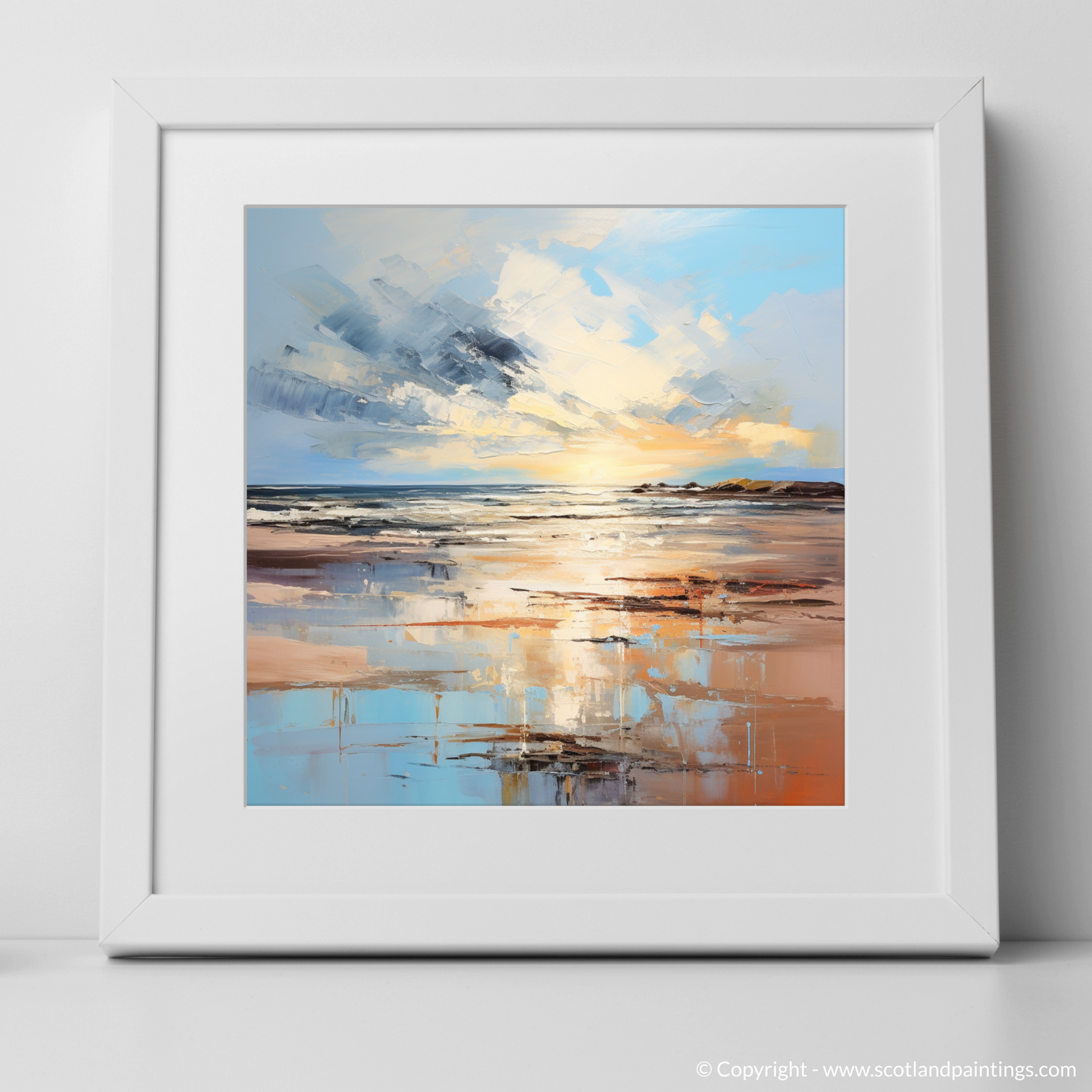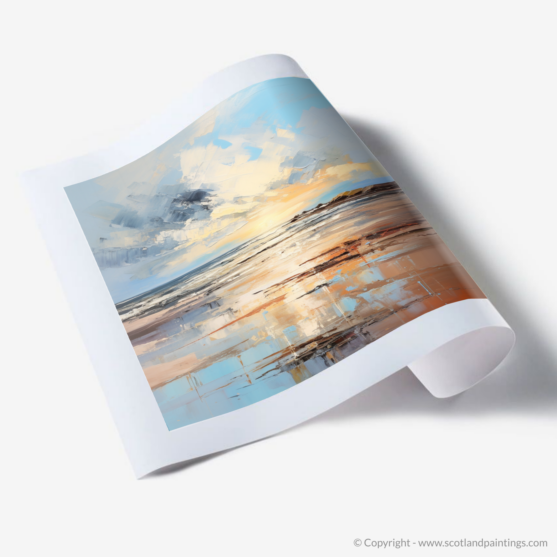 As the day wanes into the tranquil embrace of twilight, this evocative print captures the serene essence of Lunan Bay, one of Scotland's most picturesque coastal treasures. The artwork employs a minimalist style, deftly using a restrained colour palette to create a study in quiet simplicity and reflection.