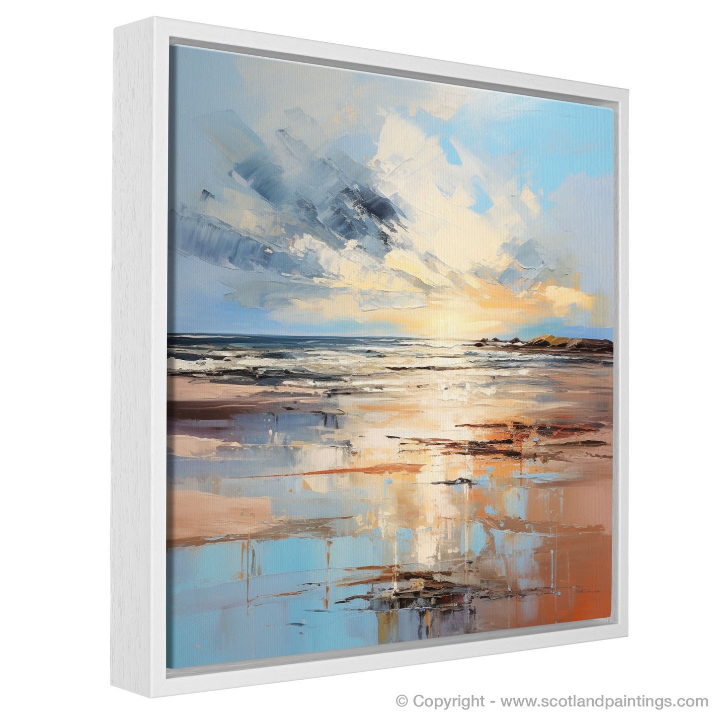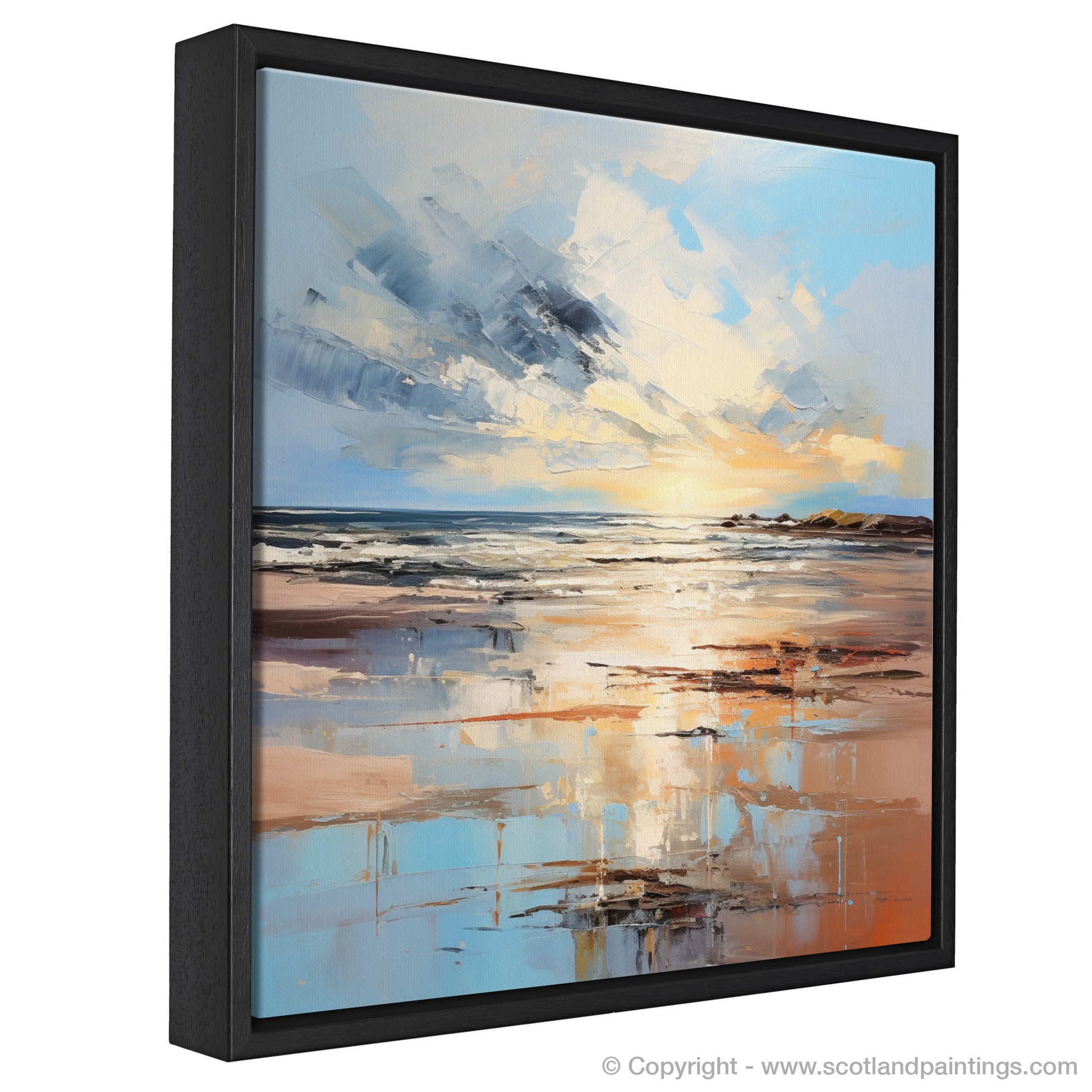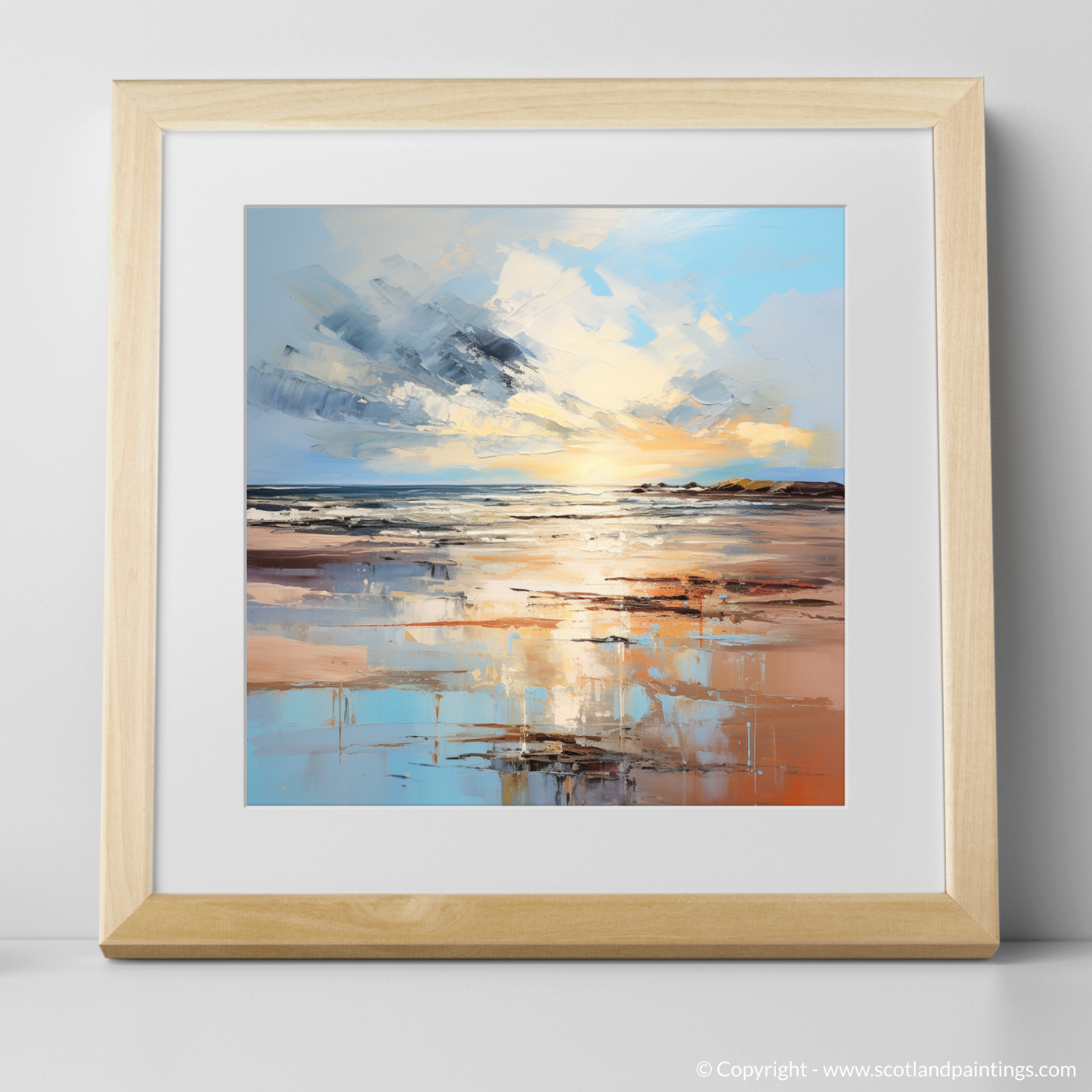 As the day wanes into the tranquil embrace of twilight, this evocative print captures the serene essence of Lunan Bay, one of Scotland's most picturesque coastal treasures. The artwork employs a minimalist style, deftly using a restrained colour palette to create a study in quiet simplicity and reflection.