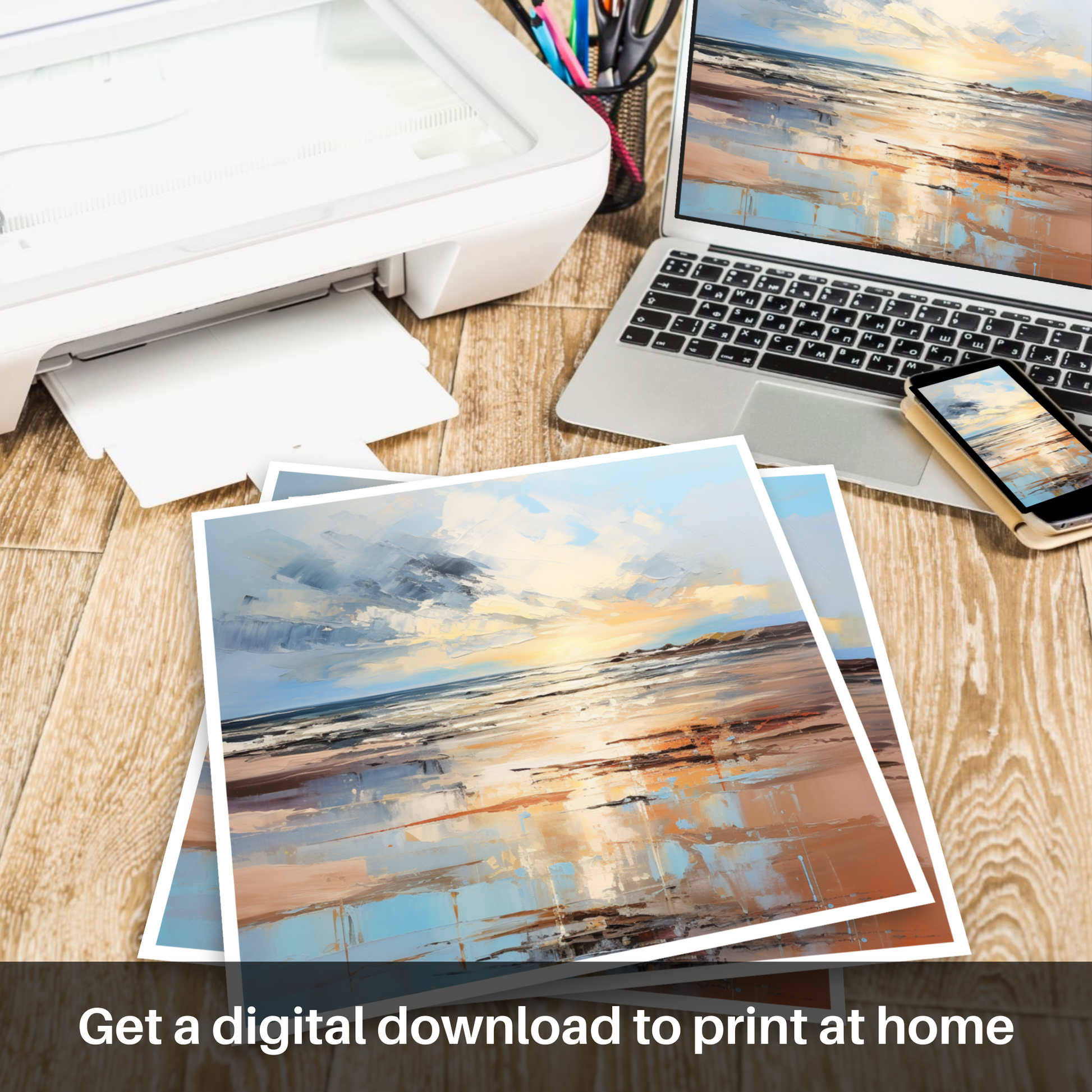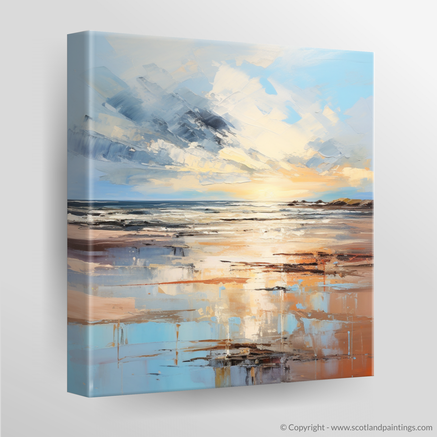 At first glance, the viewer is struck by the expanse of the shoreline, rendered in a symphony of earthen hues that capture the wet sands reflecting the last golden rays of the sinking sun. Striations of cream, amber, and rust converge upon the beach, suggesting the gentle ebb and flow of the tide.
