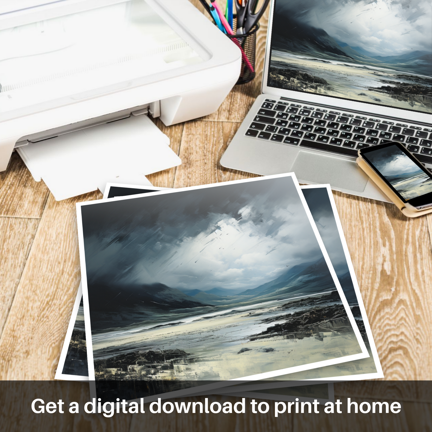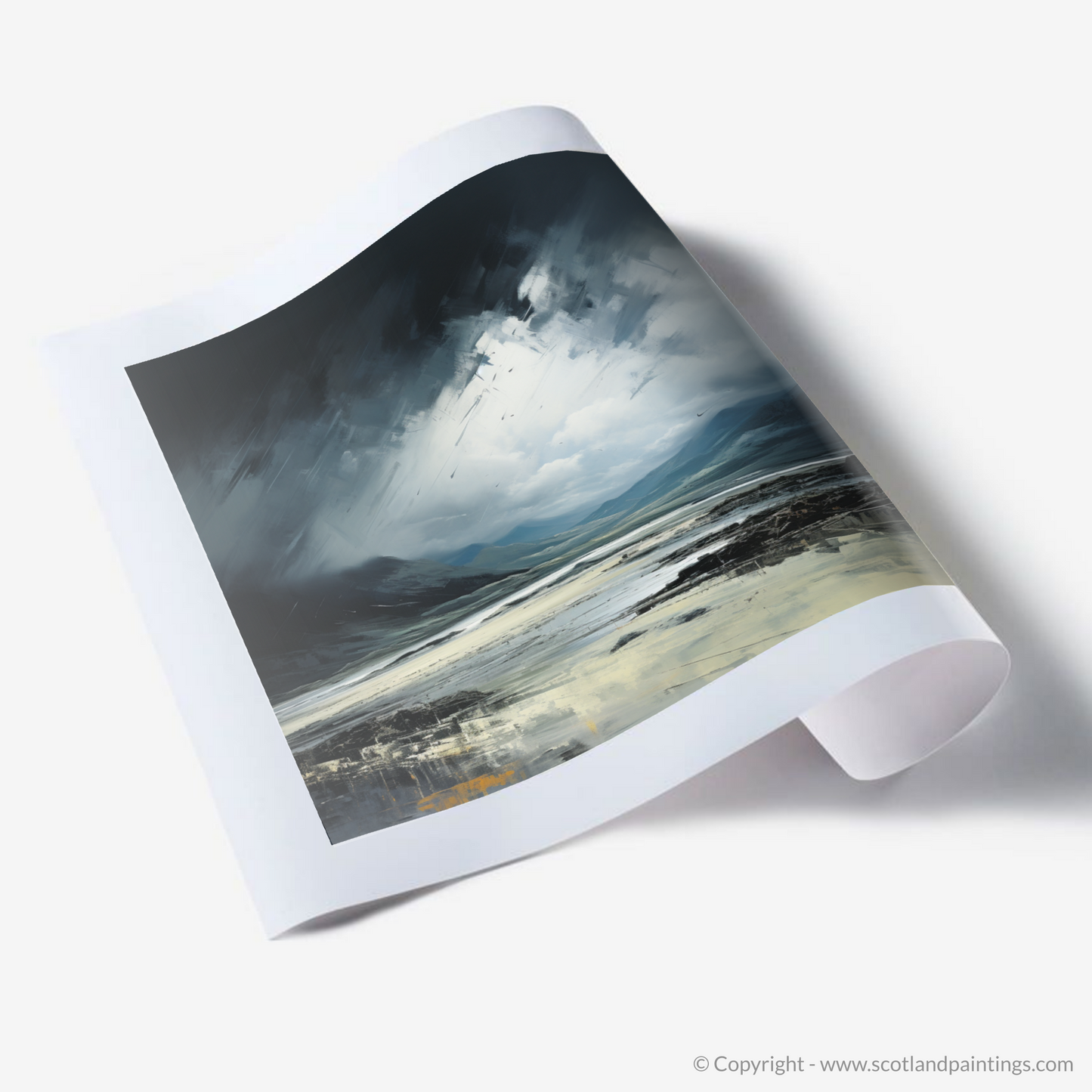 Capturing the restless spirit of the Scottish coastline, this evocative print beckons the viewer to experience the rugged beauty of Luskentyre Sands. The minimalistic style distills the scene down to its most emotive elements, creating a dynamic interplay between land, sea, and sky.