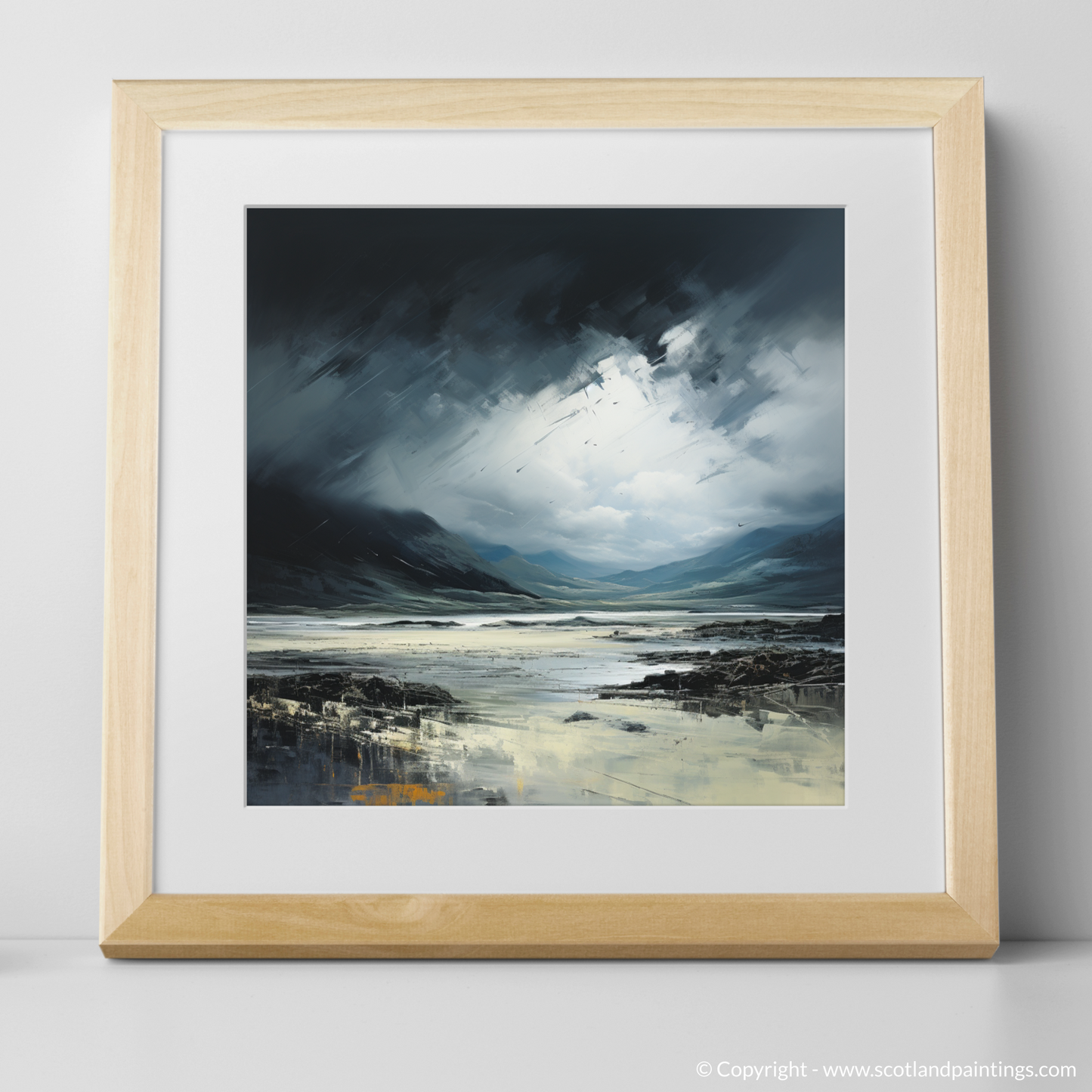 Below this charged atmosphere, the silvery sands of Luskentyre are depicted in broad, serene washes. The beach reflects the dance of light and shadow cast by the turbulent sky above, with a subtle infusion of golden hues along the shore, adding a warm contrast to the cool tones.