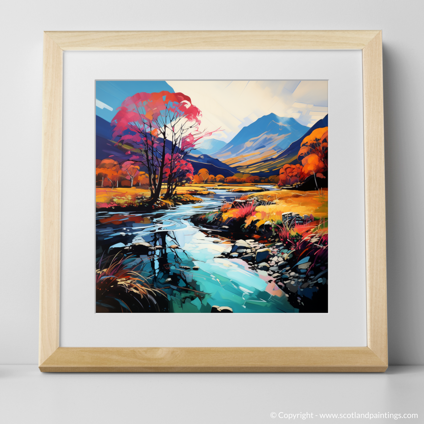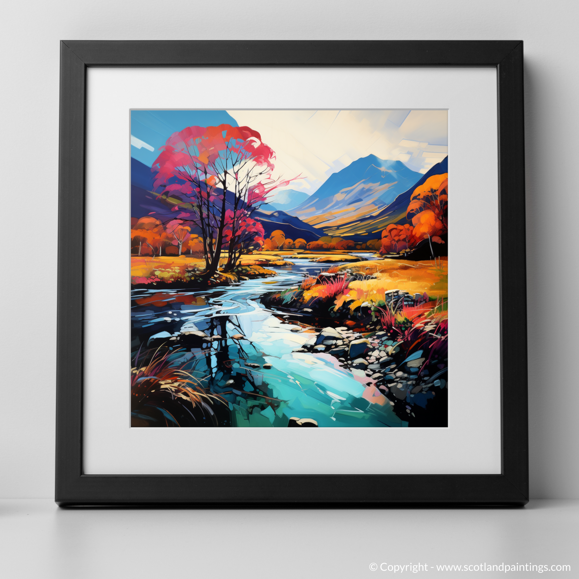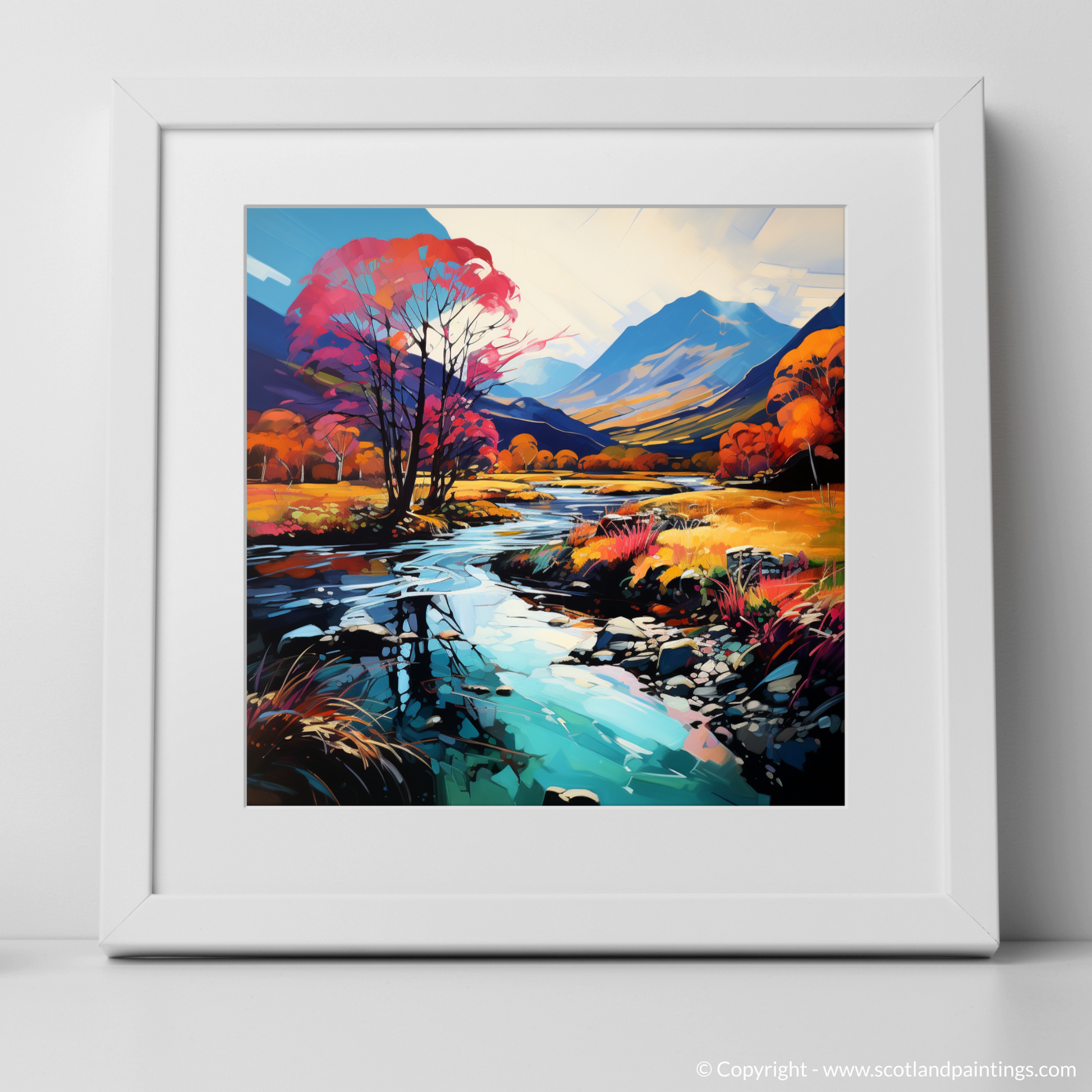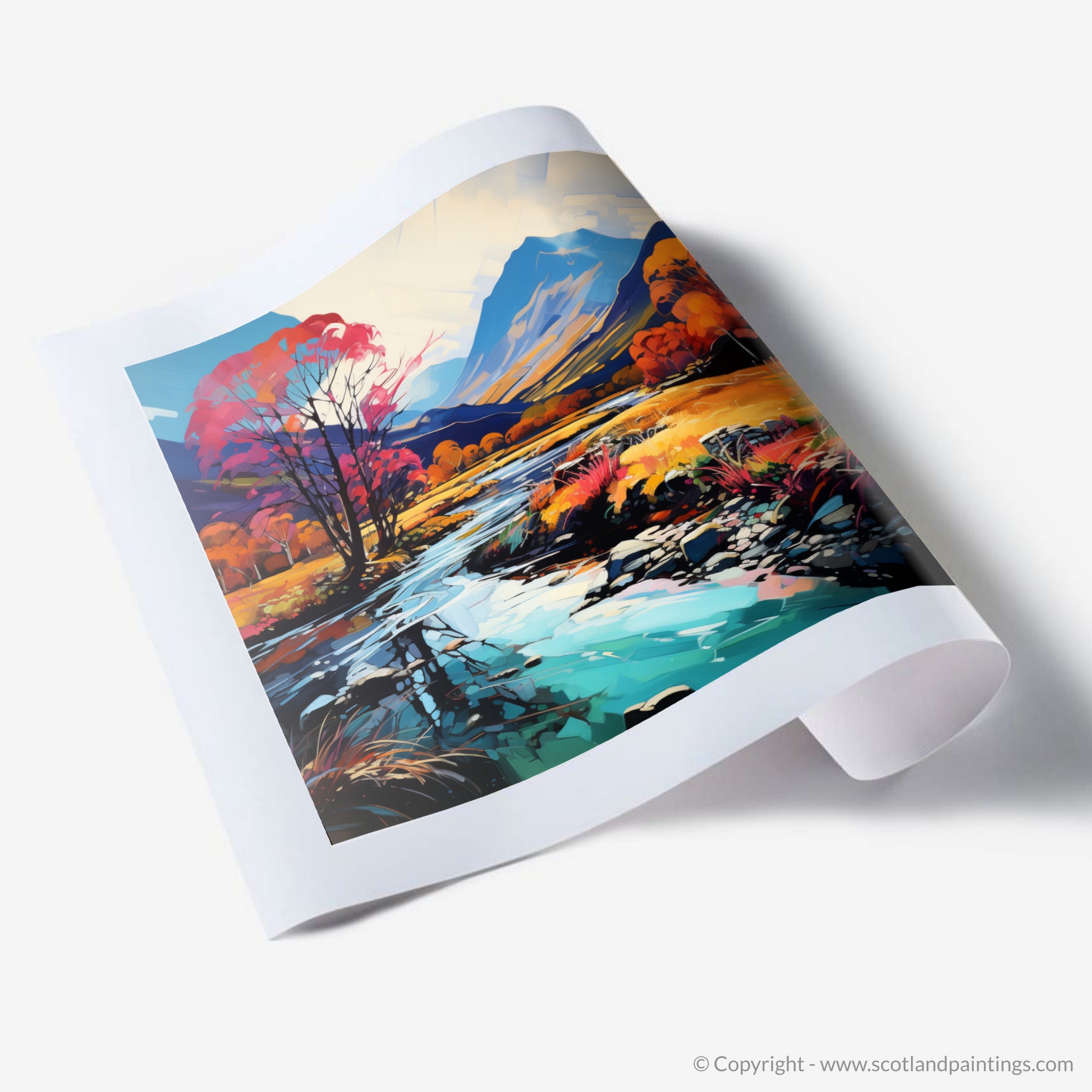 Immerse yourself in a vision of nature where colours riot and the wild Scottish landscape is reimagined through the vibrant lens of Fauvism. This captivating print, part of our 'Glencoe' collection, presents a bold interpretation of the serene River Coe reflections, a spectacle that kindles the imagination and enchants the soul.