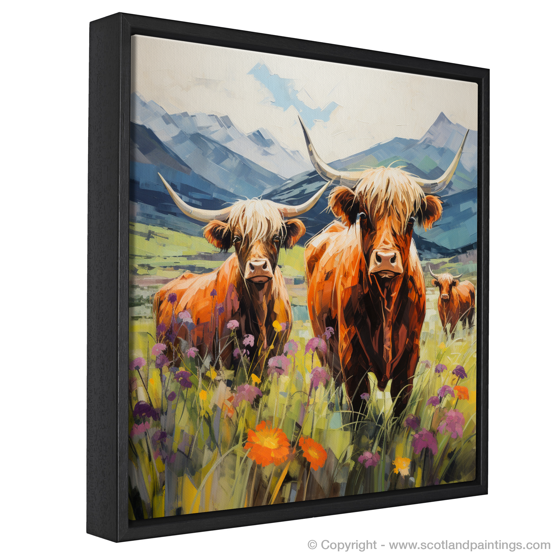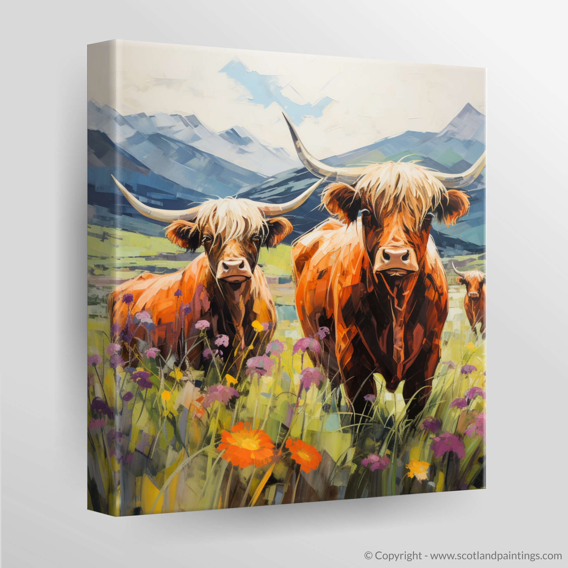 Foregrounded amidst a constellation of blooming flora, splotches of oranges, purples, and yellows dance across the field, suggesting wildflowers in the Highland breeze. These vibrant hues sing against the greens and blues that layer the hills and sky behind, crafting a symphony of colour that resonates with emotive intensity.