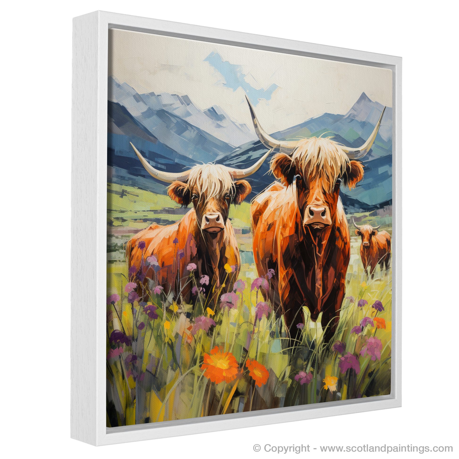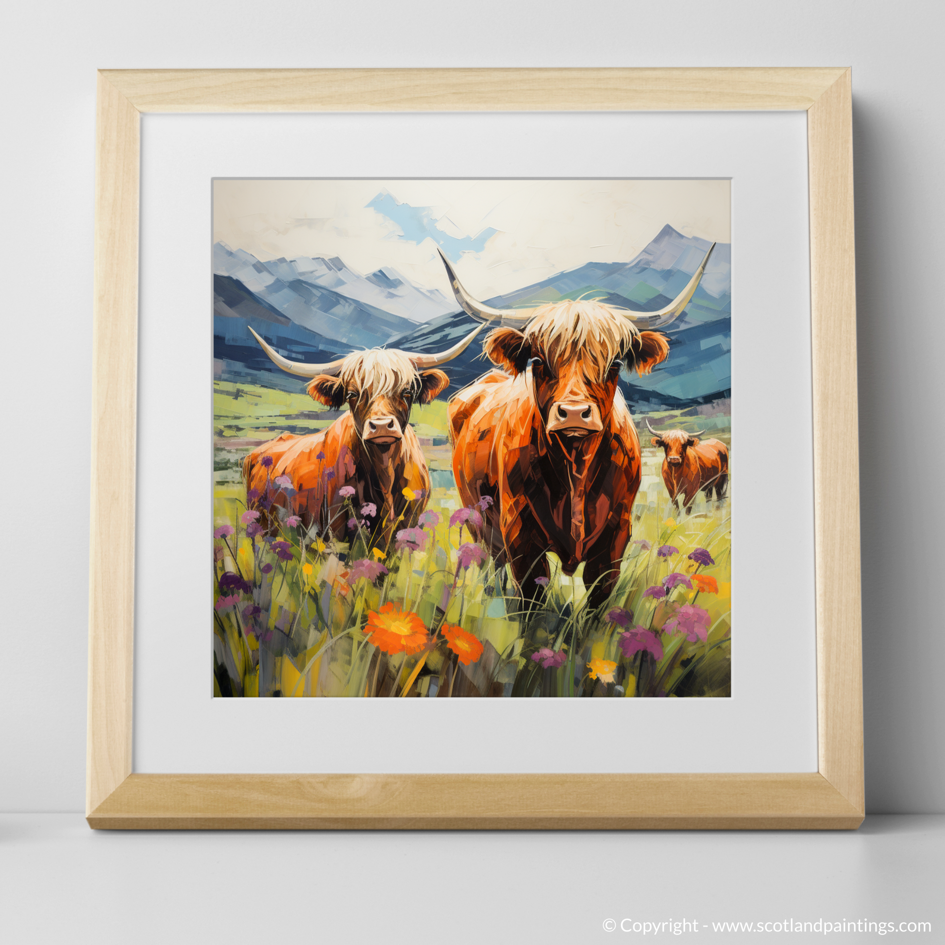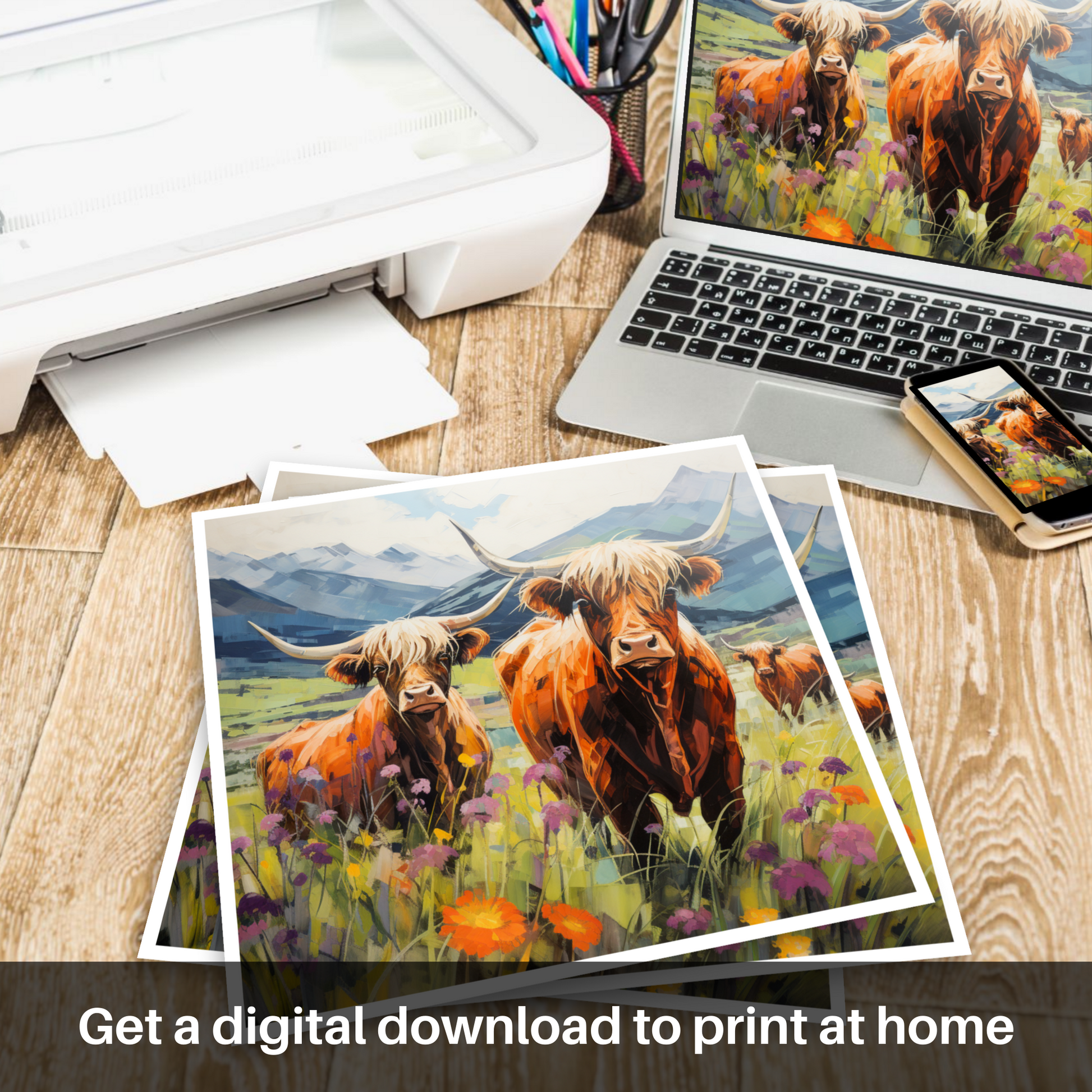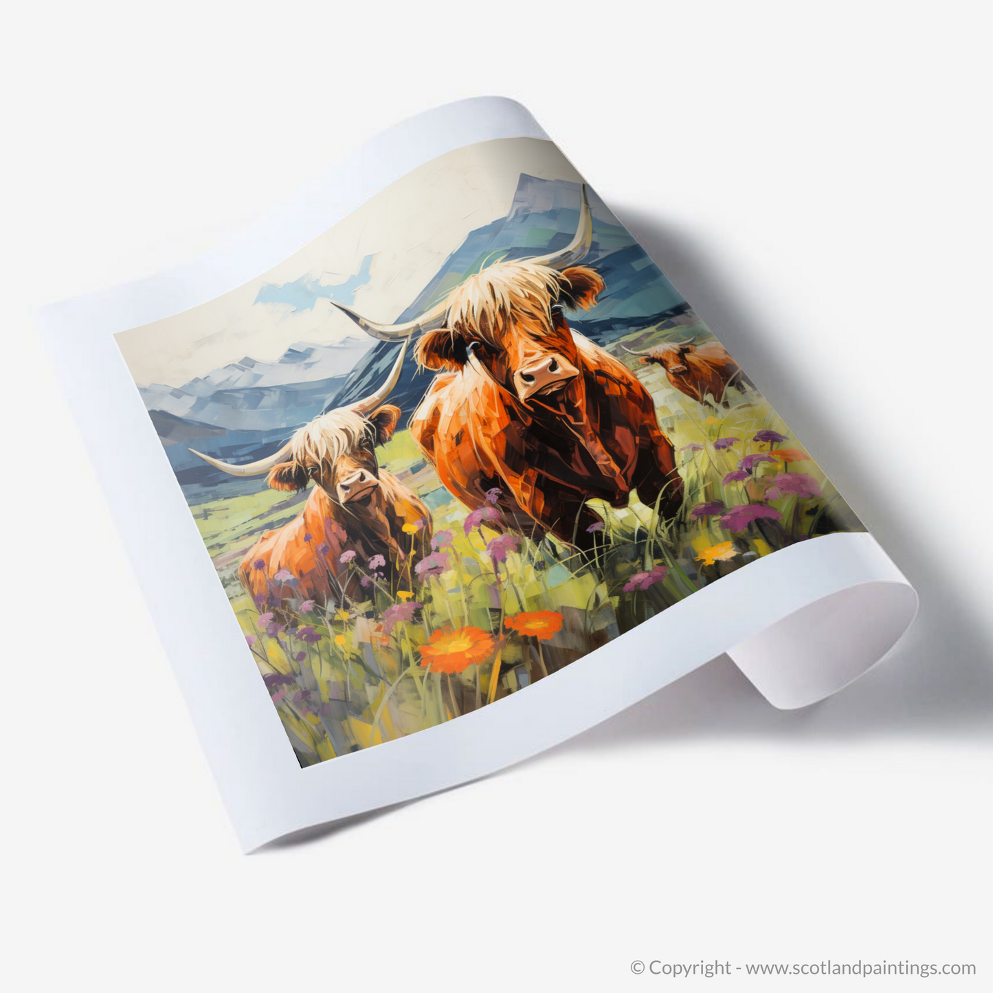 Captured within this arresting image is the sheer majesty of the Highland cow, set against a sweeping Glencoe backdrop, rendered with the soul-stirring vigour of Abstract Expressionism. Exuding vibrancy, the bold strokes and impasto technique birth a textured landscape that beckons the touch, whilst the interplay of light and shadow adds dimension, echoing the imposing grandeur of the Scottish Highlands.