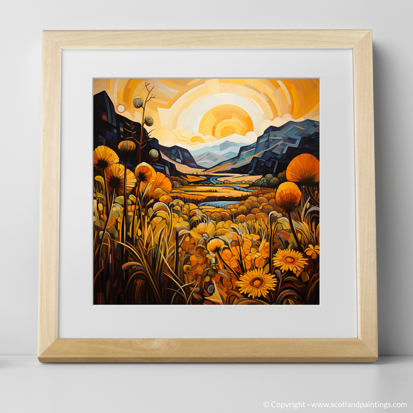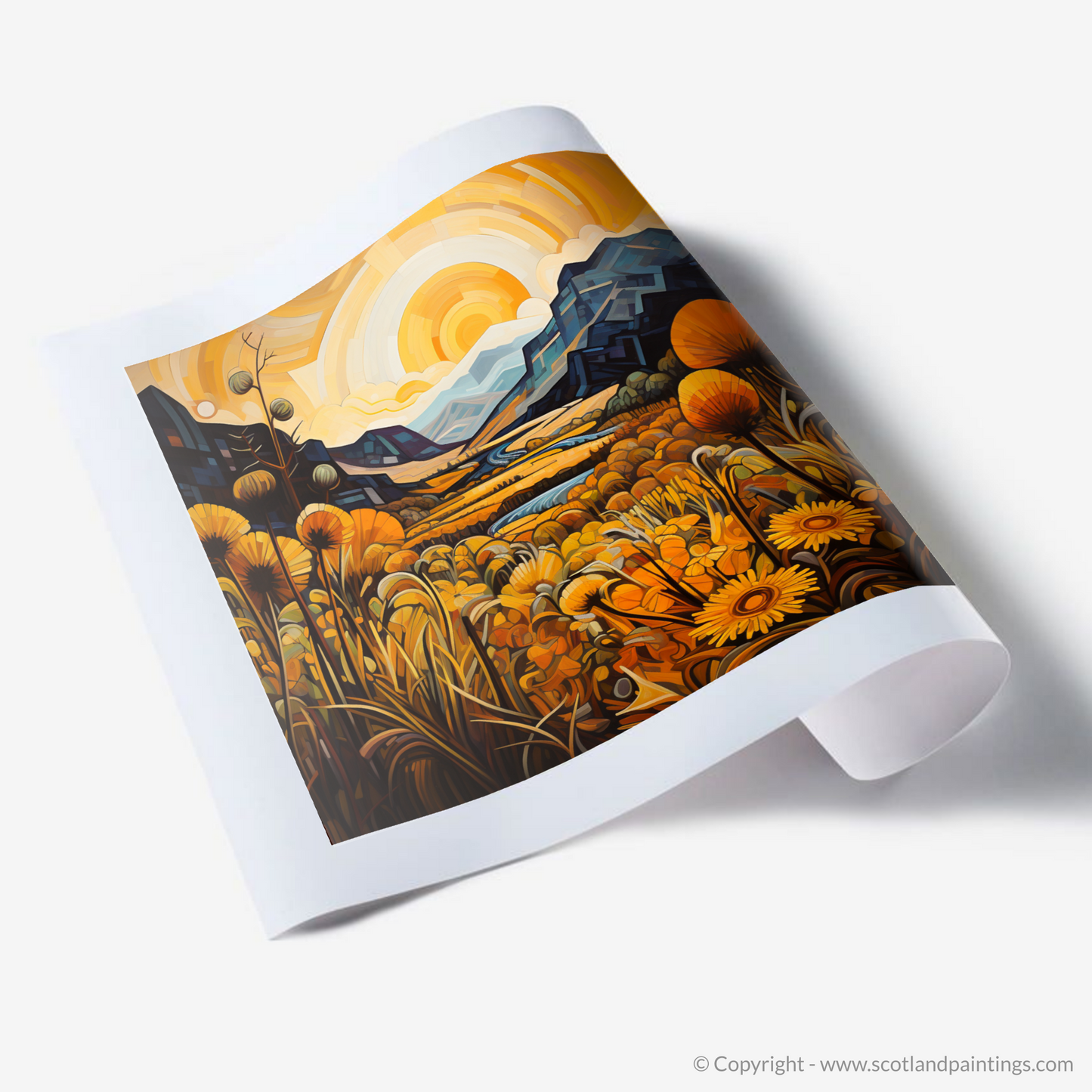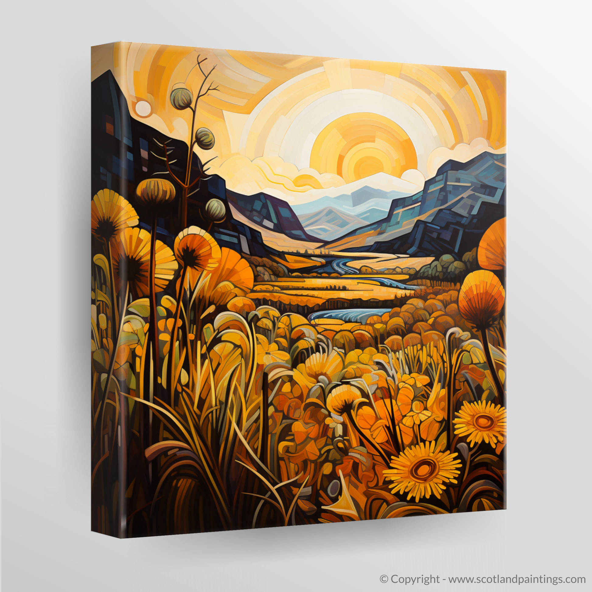 Immerse yourself in the bold geometry and vivid hues of a landscape where golden bracken unfurls across the canvas, evoking the timeless beauty of Glencoe. Angular forms and interlocking planes meld to form the craggy terrain of this Scottish vista, where the natural grandeur of the highlands is reimagined through the prism of Cubism.