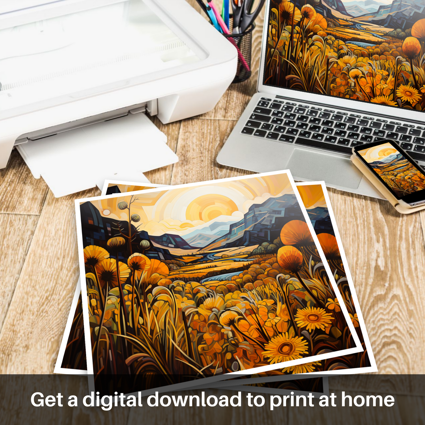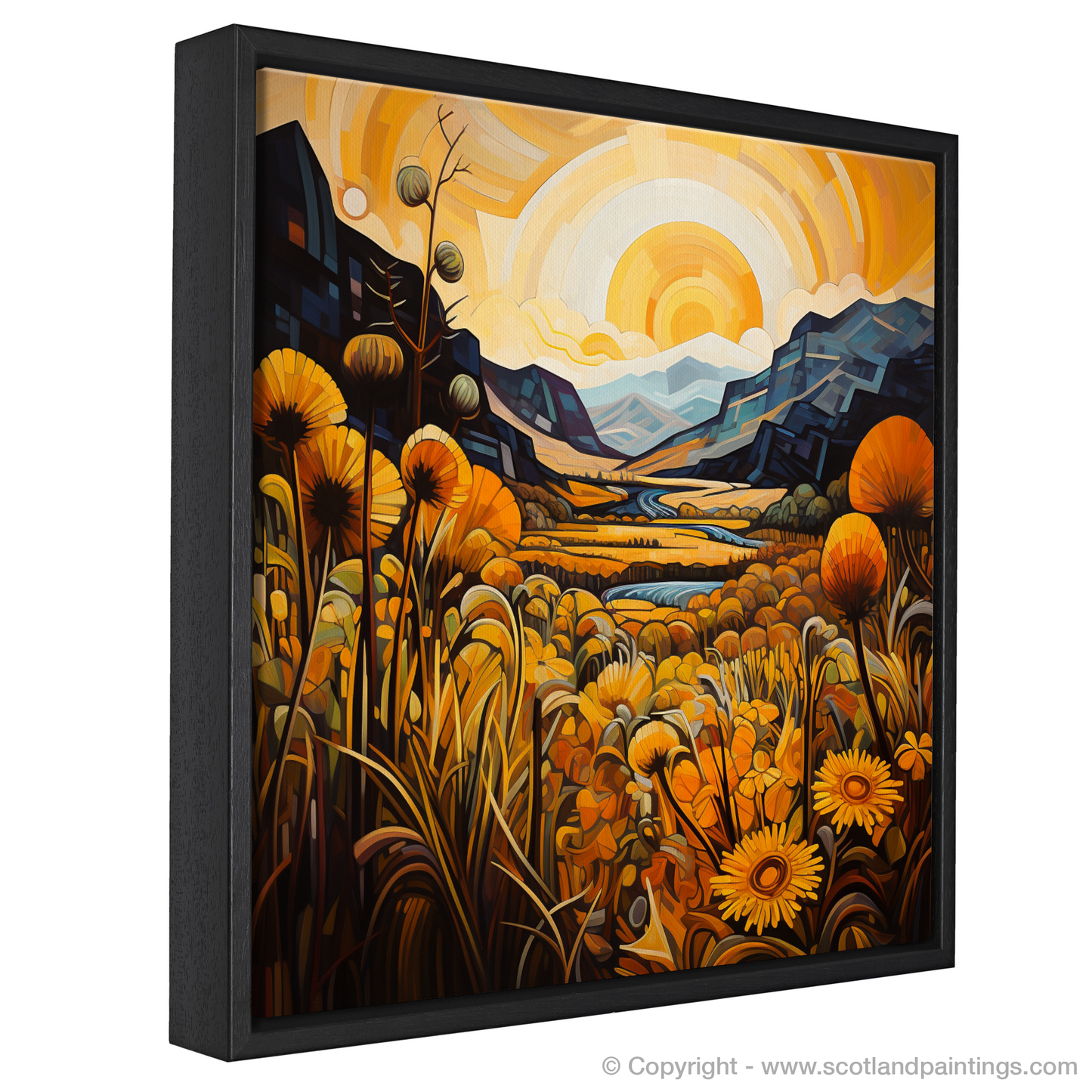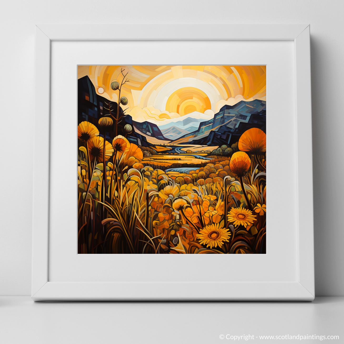 Immerse yourself in the bold geometry and vivid hues of a landscape where golden bracken unfurls across the canvas, evoking the timeless beauty of Glencoe. Angular forms and interlocking planes meld to form the craggy terrain of this Scottish vista, where the natural grandeur of the highlands is reimagined through the prism of Cubism.