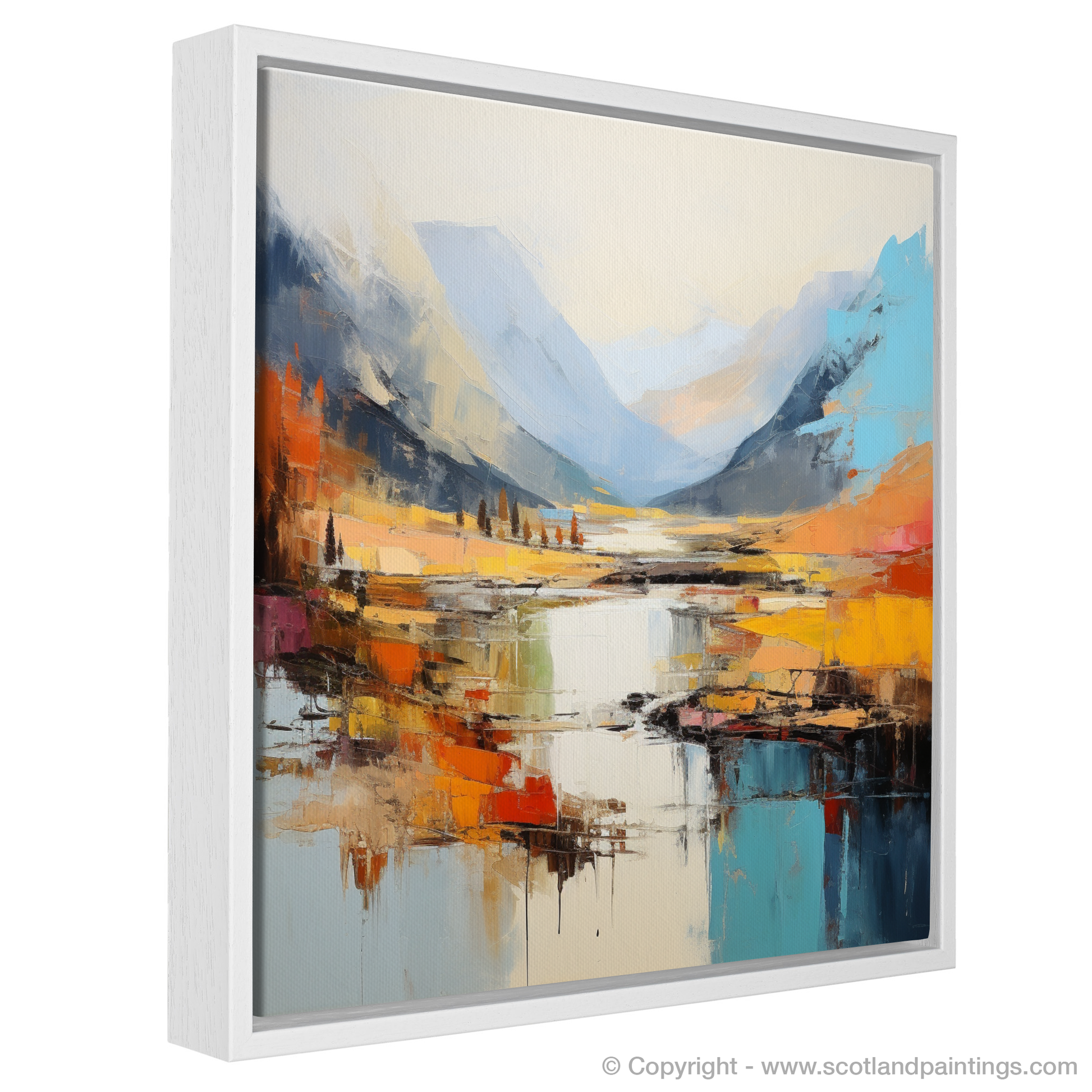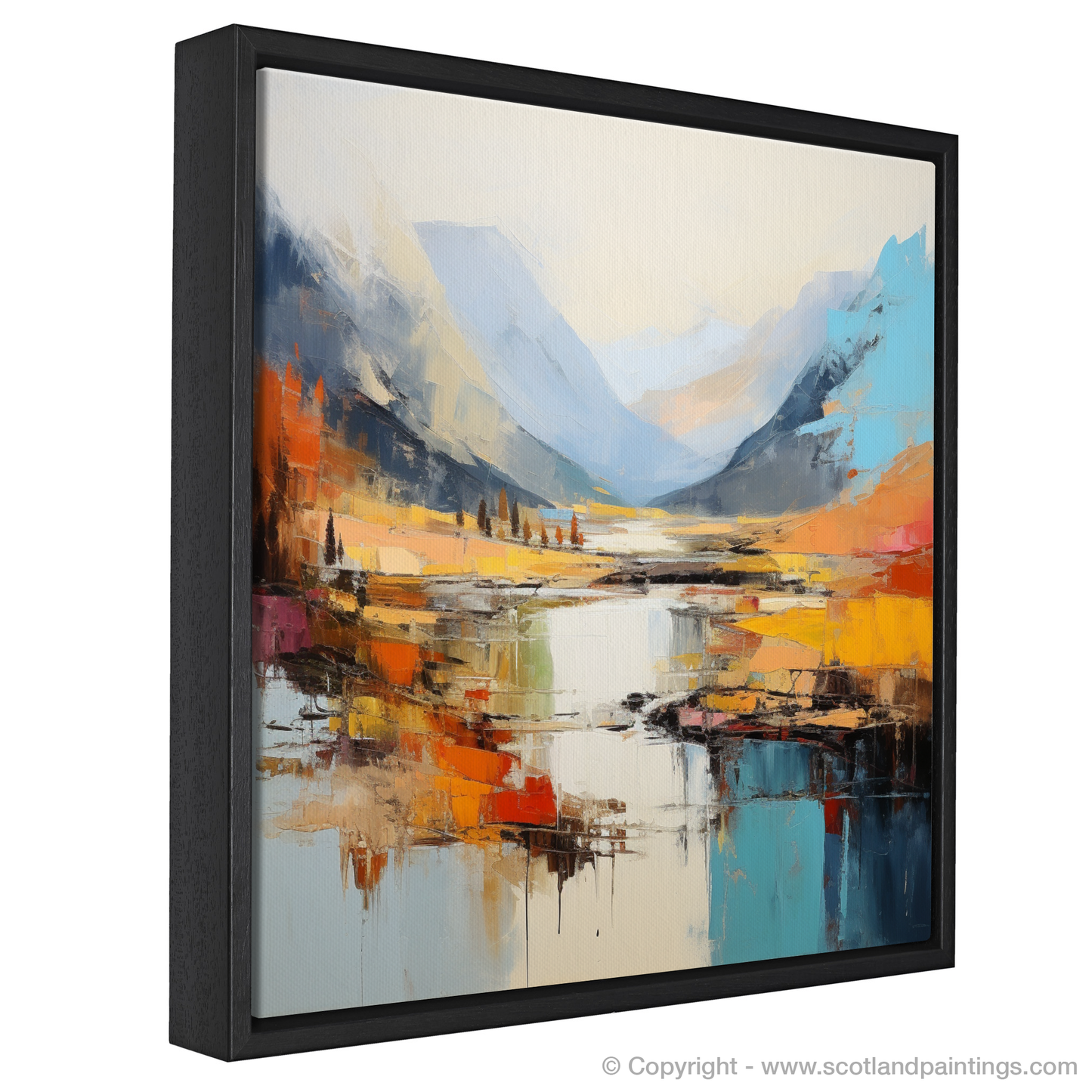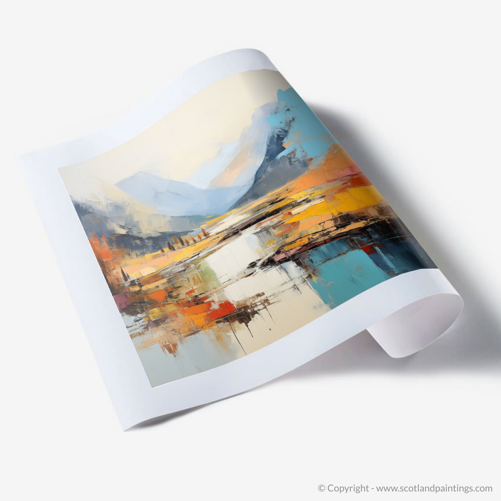 Capturing the fiery essence of Autumn in the Scottish Highlands, this print immerses the viewer in a world where nature's palette comes alive with vigor. Bold, deliberate strokes of tangerine, amber, and gold mingle with cerulean and sapphire, reminiscent of Glencoe's rugged vistas and crisp skies. At once turbulent and serene, the print's abstract expressionist style evokes the raw and unfettered beauty of this ancient landscape, guiding the eye through the dance of colours that reflect off the mirrored surface of a still loch.