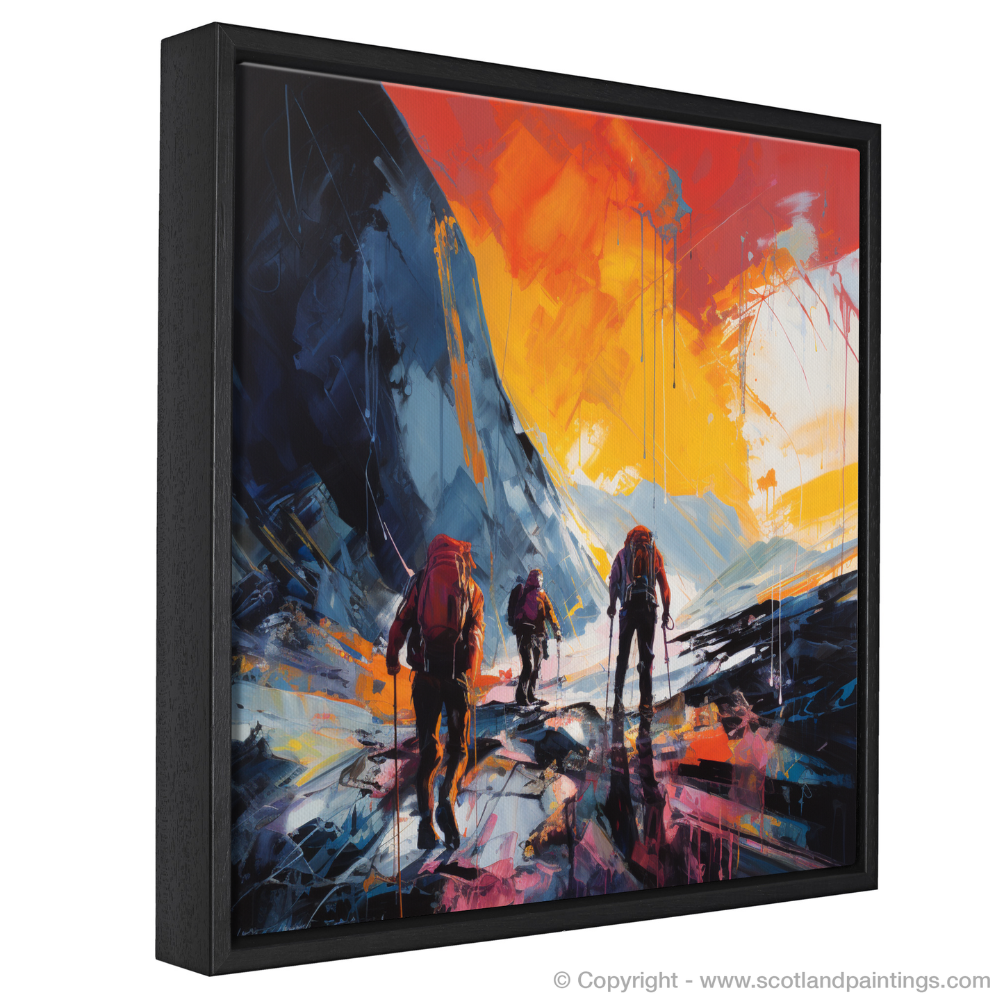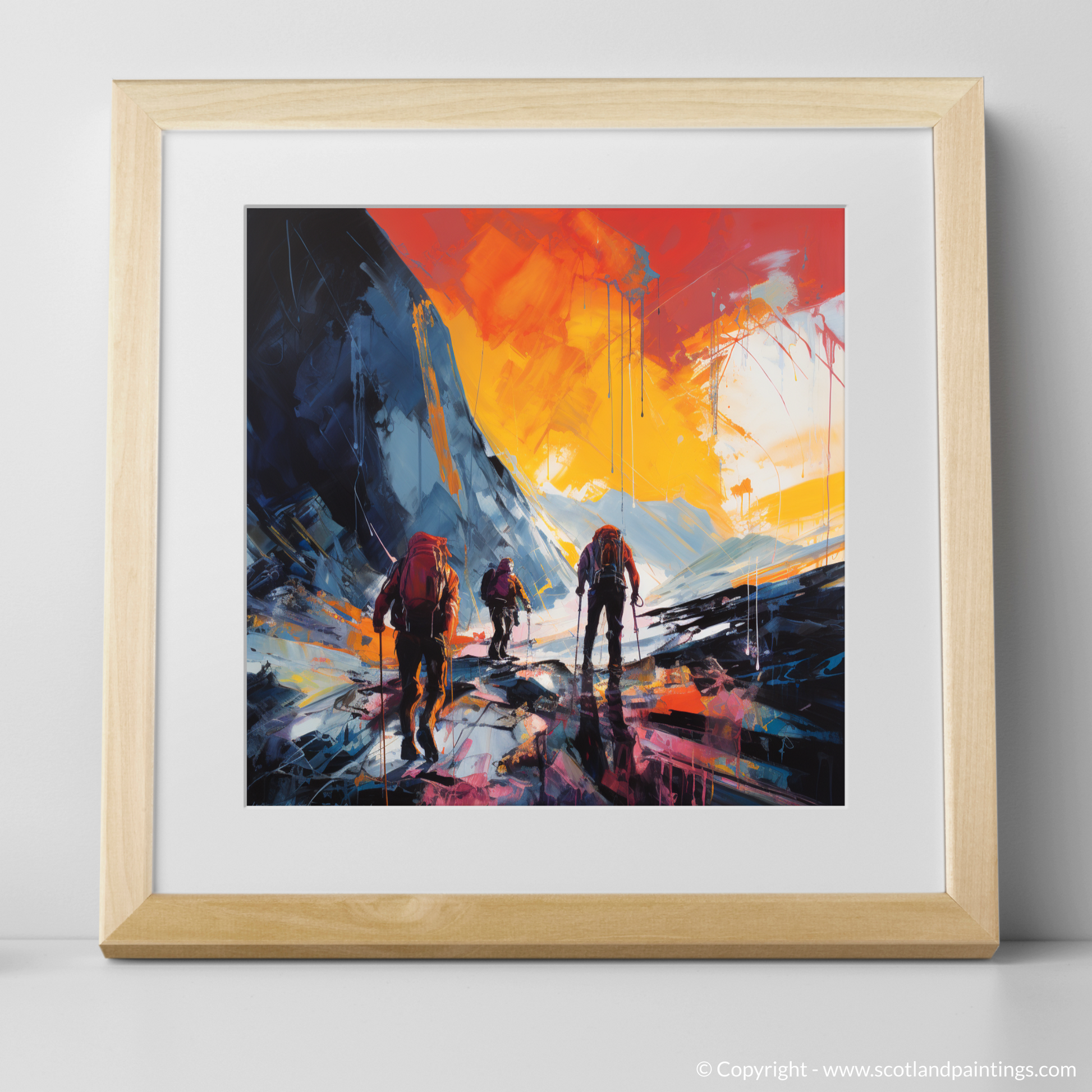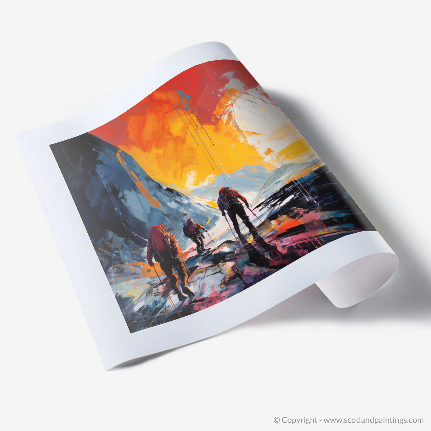 Immerse yourself in the vibrant energy and raw beauty of the Scottish Highlands with this mesmerising print from our 'Glencoe' collection. The artwork captures the essence of adventure as climbers make their ascent, portrayed through a symphony of abstract shapes and daring brushstrokes.