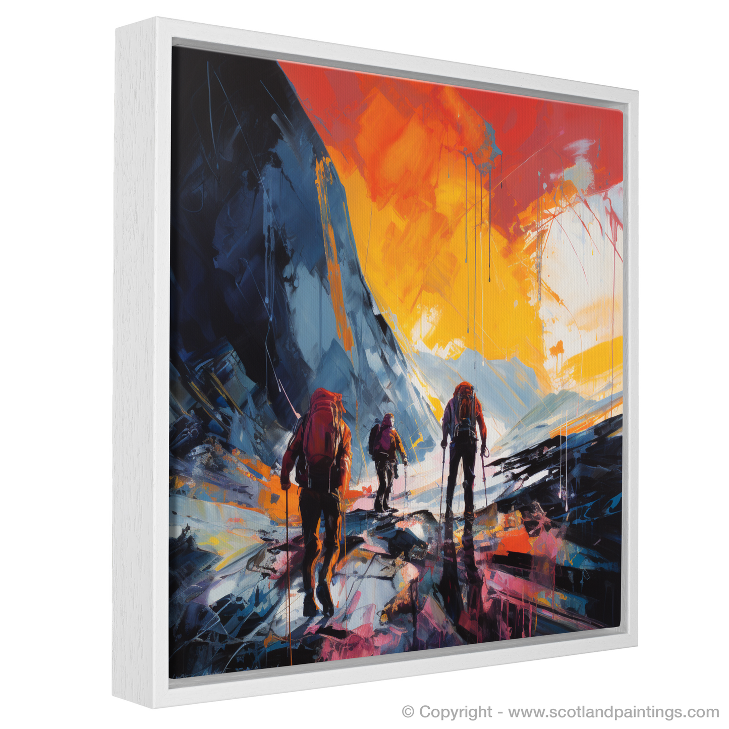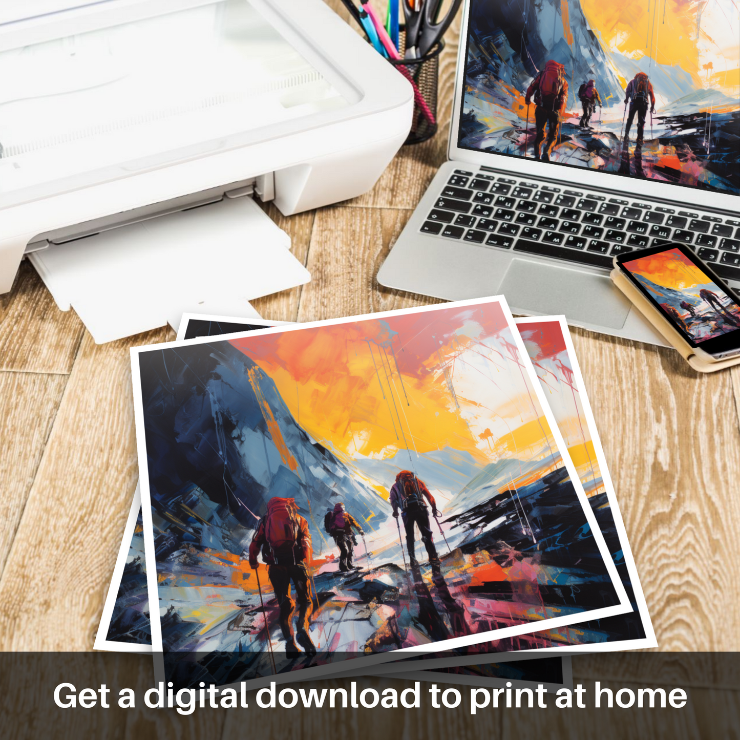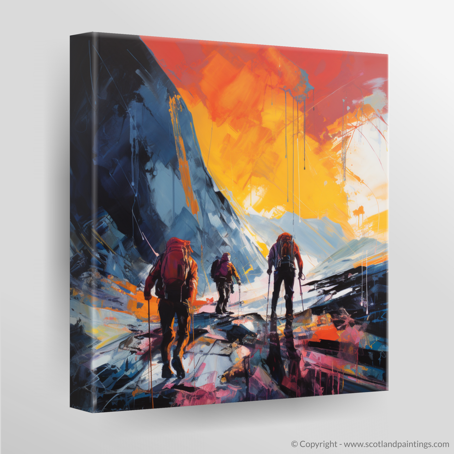 Immerse yourself in the vibrant energy and raw beauty of the Scottish Highlands with this mesmerising print from our 'Glencoe' collection. The artwork captures the essence of adventure as climbers make their ascent, portrayed through a symphony of abstract shapes and daring brushstrokes.