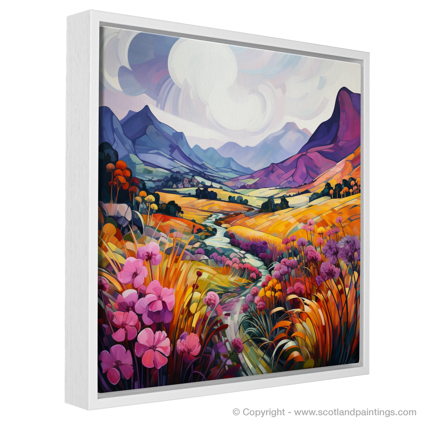 The majestic Glencoe mountains rise in the distance, their peaks rendered in layers of purple, blue, and grey facets that bring to life the intense drama of this Scottish vista. Above, the sky swirls with stylised clouds, with segments of white and blue interlocking in harmonious disorder, a fitting metaphor for the ever-changing Scottish weather.