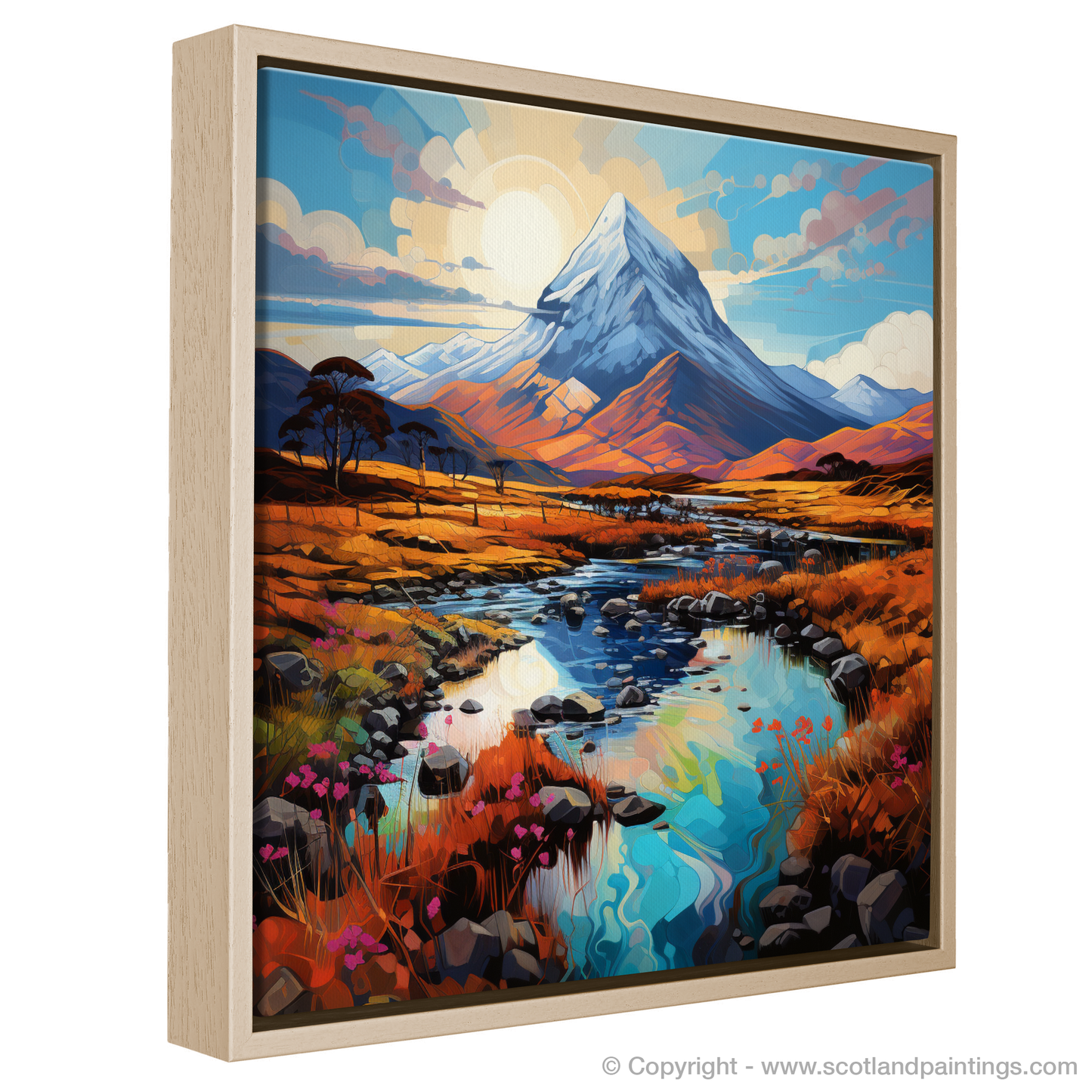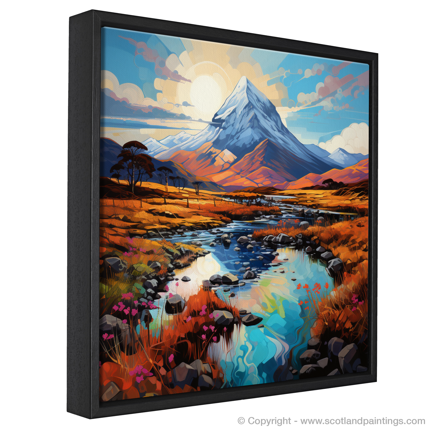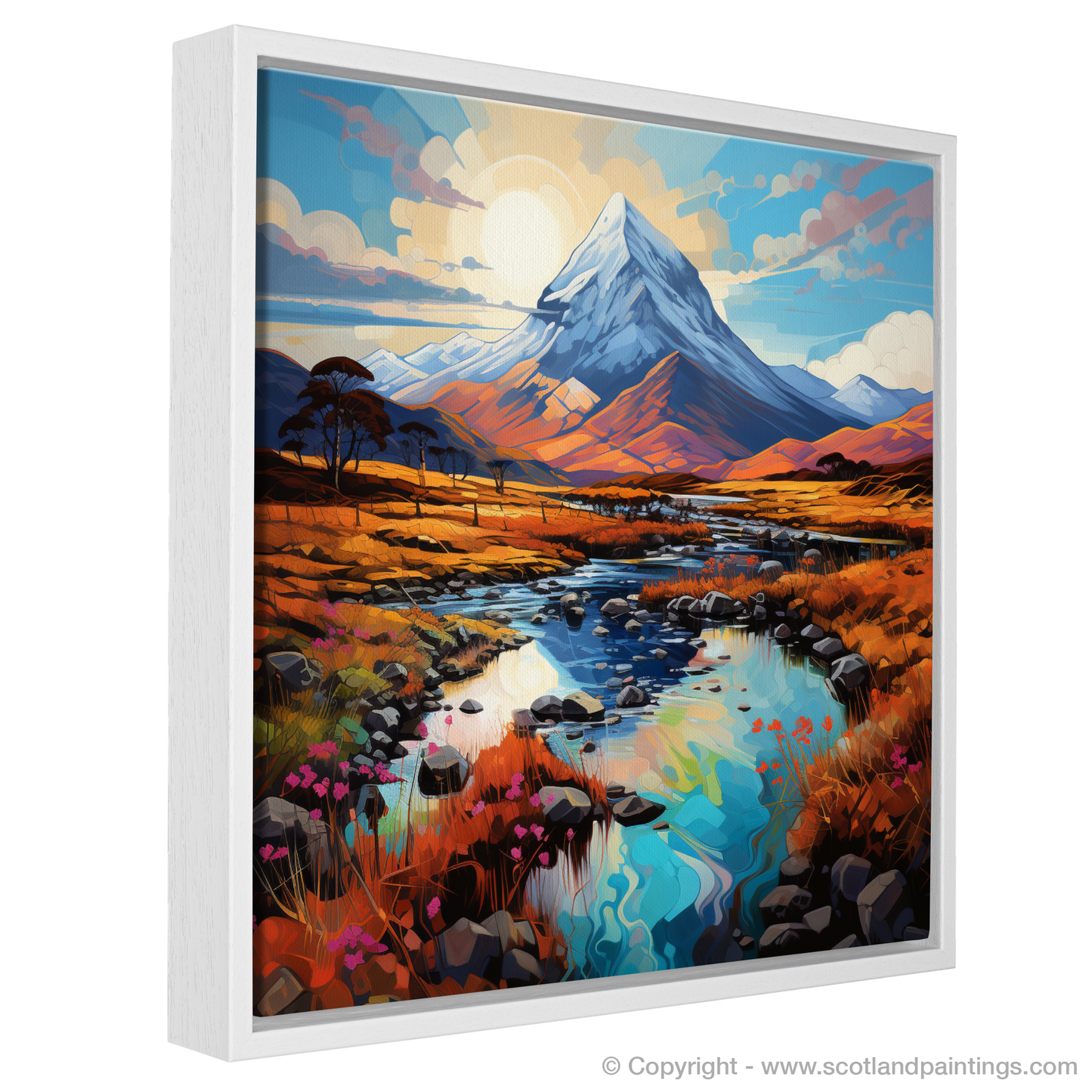 Immerse yourself in the vibrant and whimsical charm of the Scottish Highlands with this captivating print inspired by Buachaille Etive Mòr, a celebrated icon amidst the rugged beauty of Glencoe. This exquisite piece invites the viewer into a storybook rendering of nature, where the rich tapestry of the Highlands unfolds in a kaleidoscope of colours.