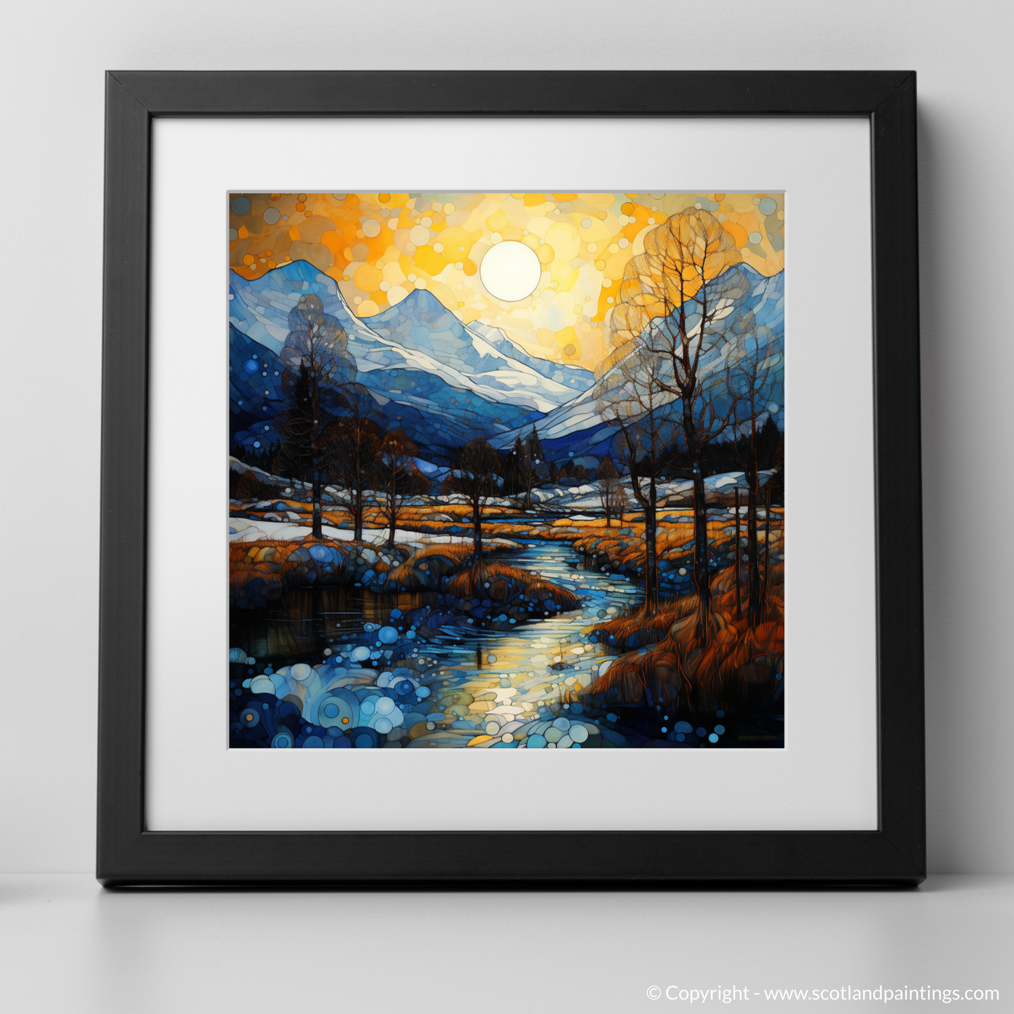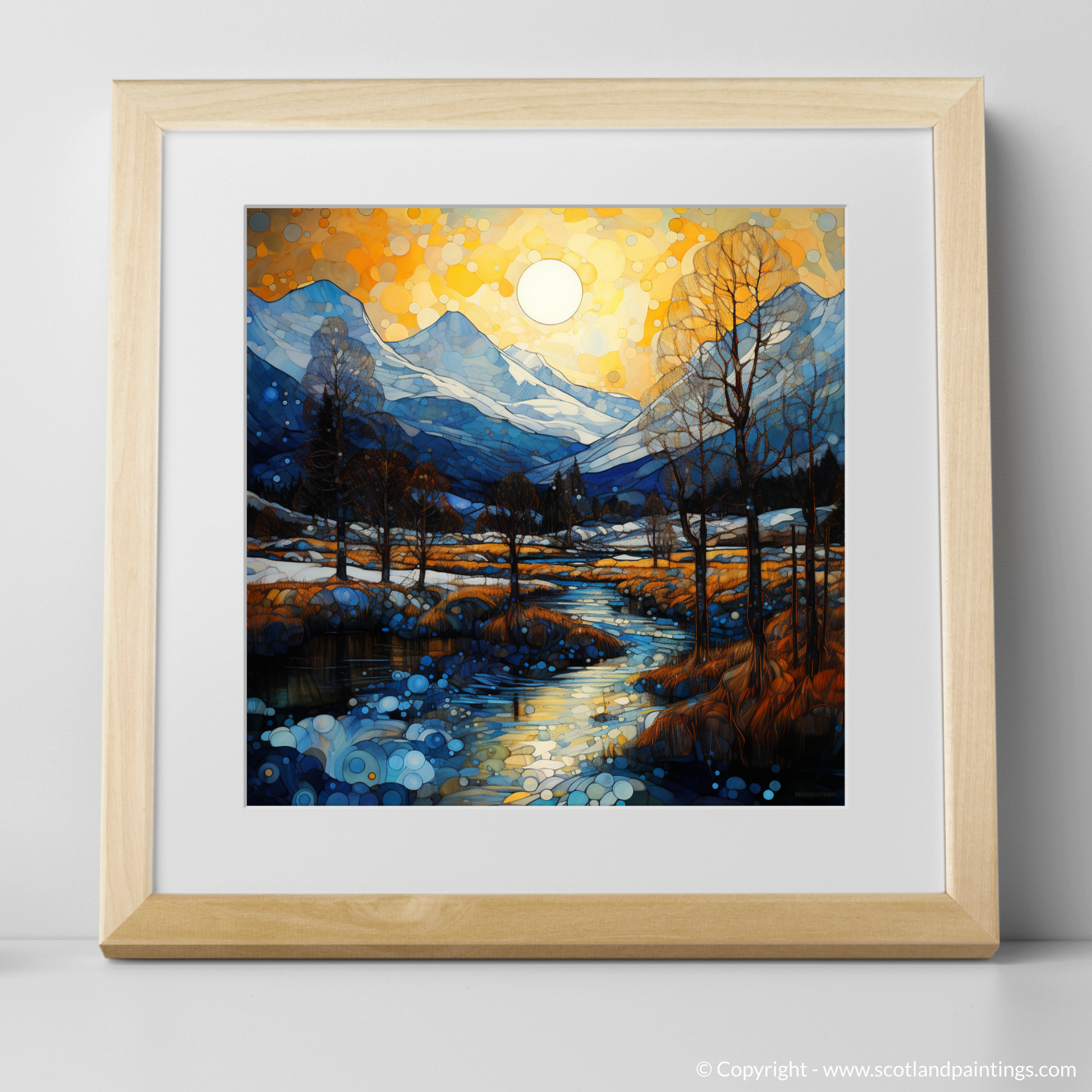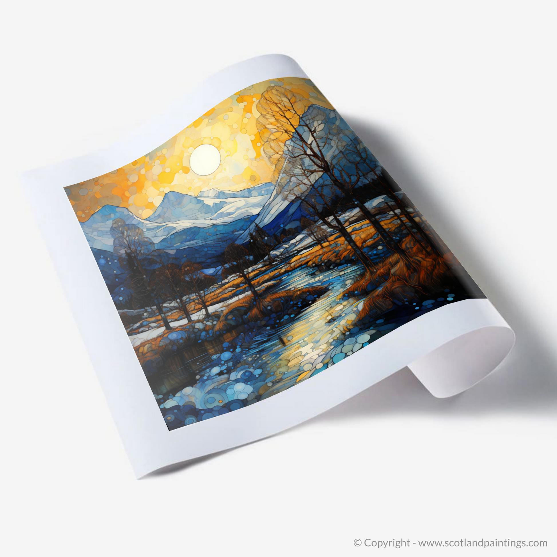 Capturing the ethereal beauty of Glencoe's snowy peaks, this captivating print invites the onlooker to immerse themselves into a Art Nouveau-inspired dreamscape where nature’s majesty is celebrated in swirls of vivid colours and elegant lines. The serene highland panorama depicted here is awash with an almost tangible tranquillity, as if the mountains themselves are breathing in the cold, crisp air.
