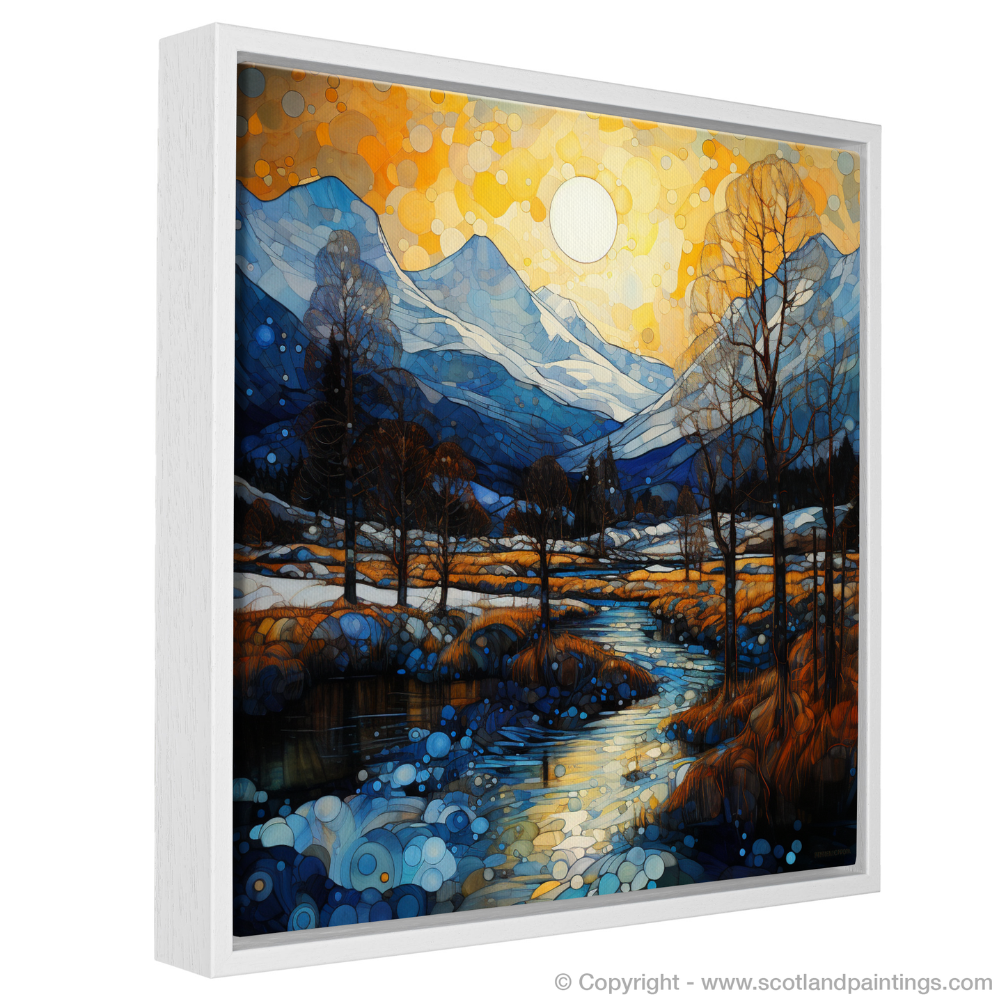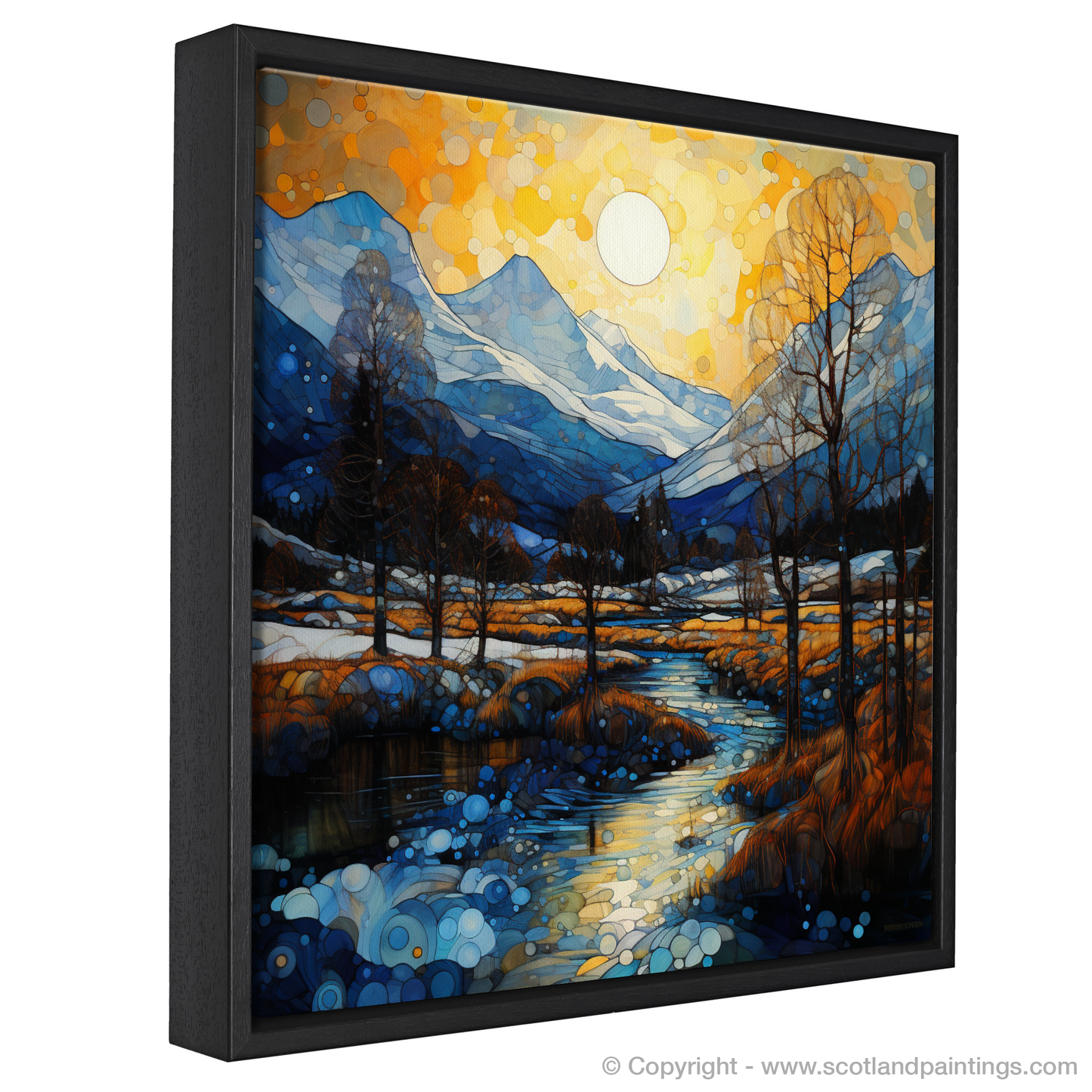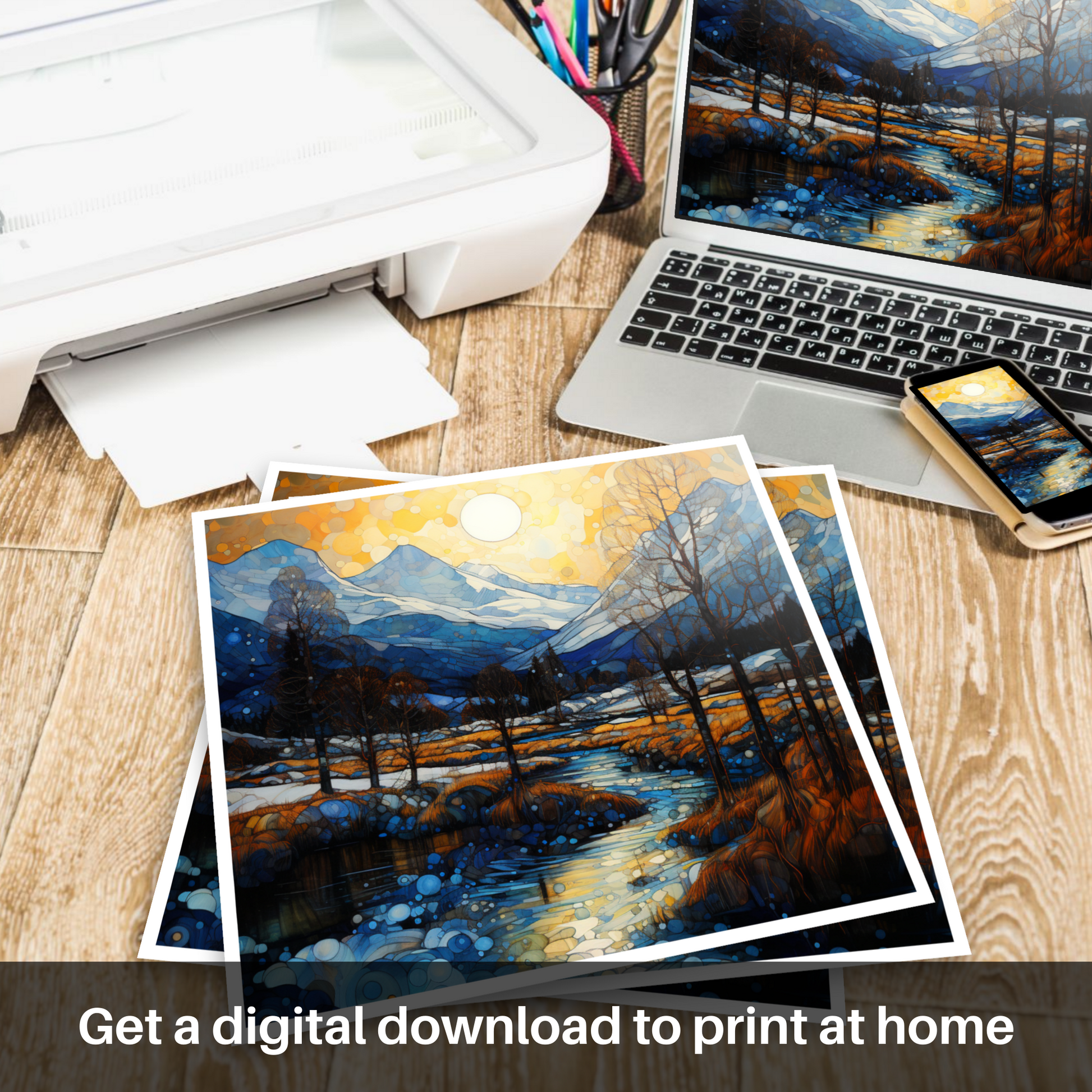 Capturing the ethereal beauty of Glencoe's snowy peaks, this captivating print invites the onlooker to immerse themselves into a Art Nouveau-inspired dreamscape where nature’s majesty is celebrated in swirls of vivid colours and elegant lines. The serene highland panorama depicted here is awash with an almost tangible tranquillity, as if the mountains themselves are breathing in the cold, crisp air.