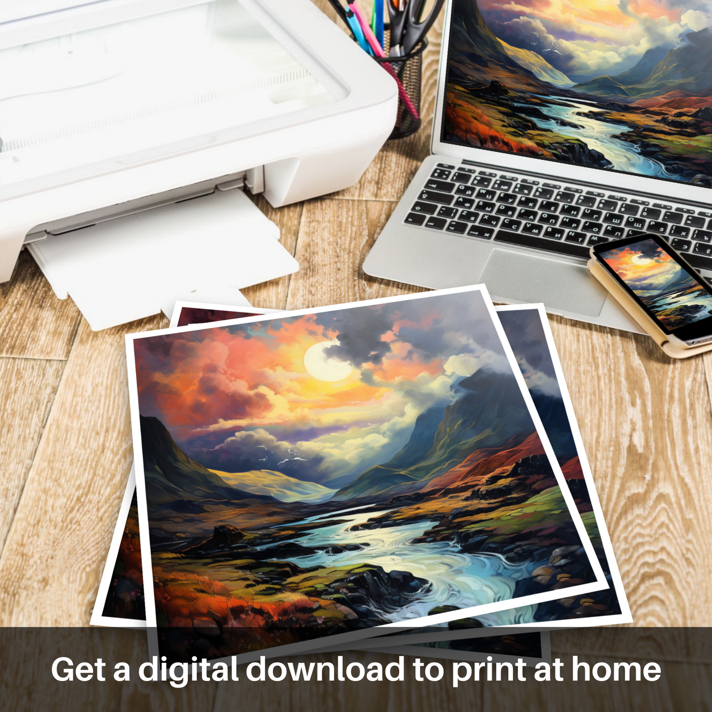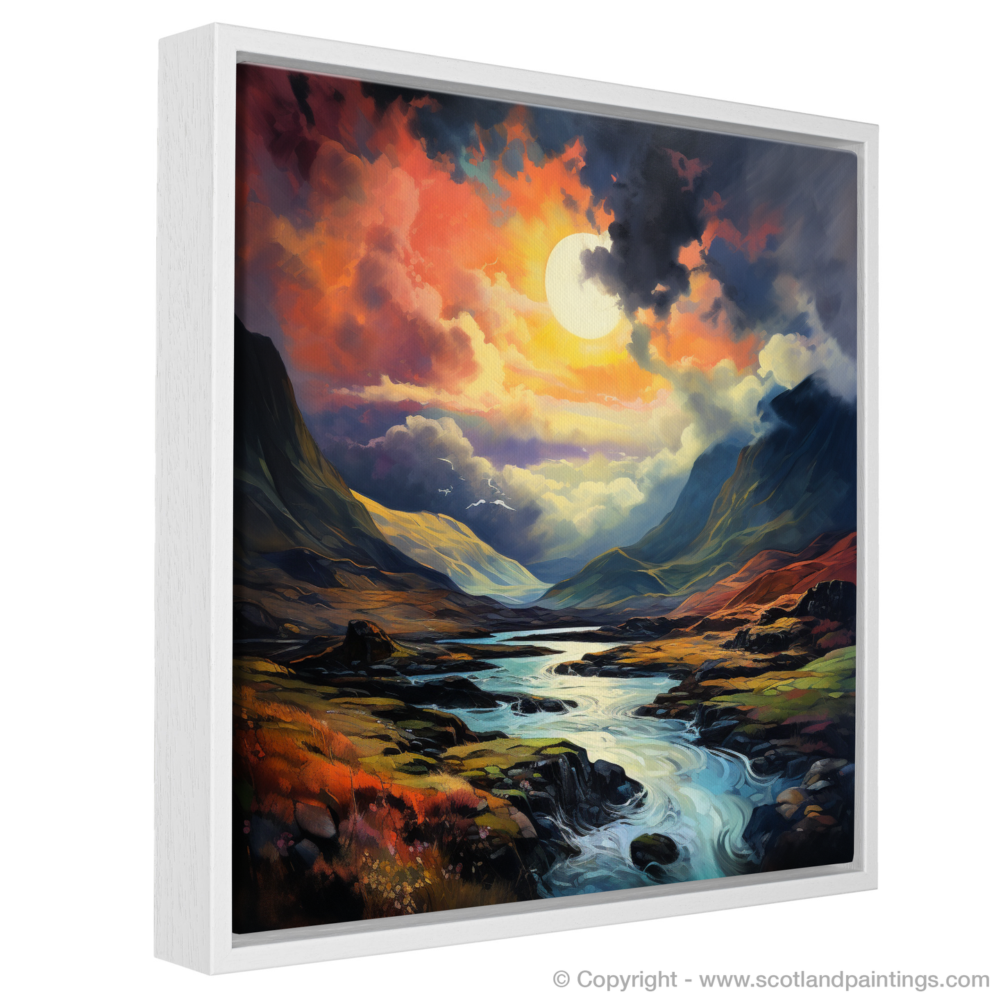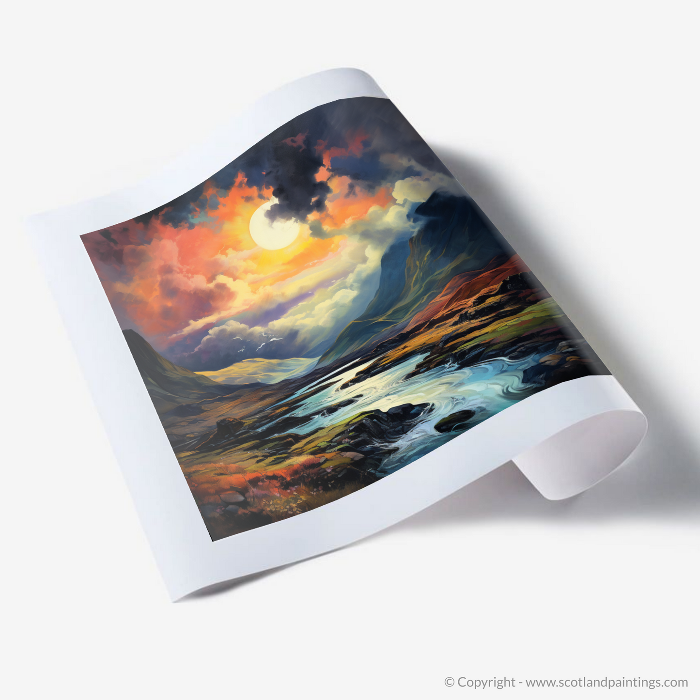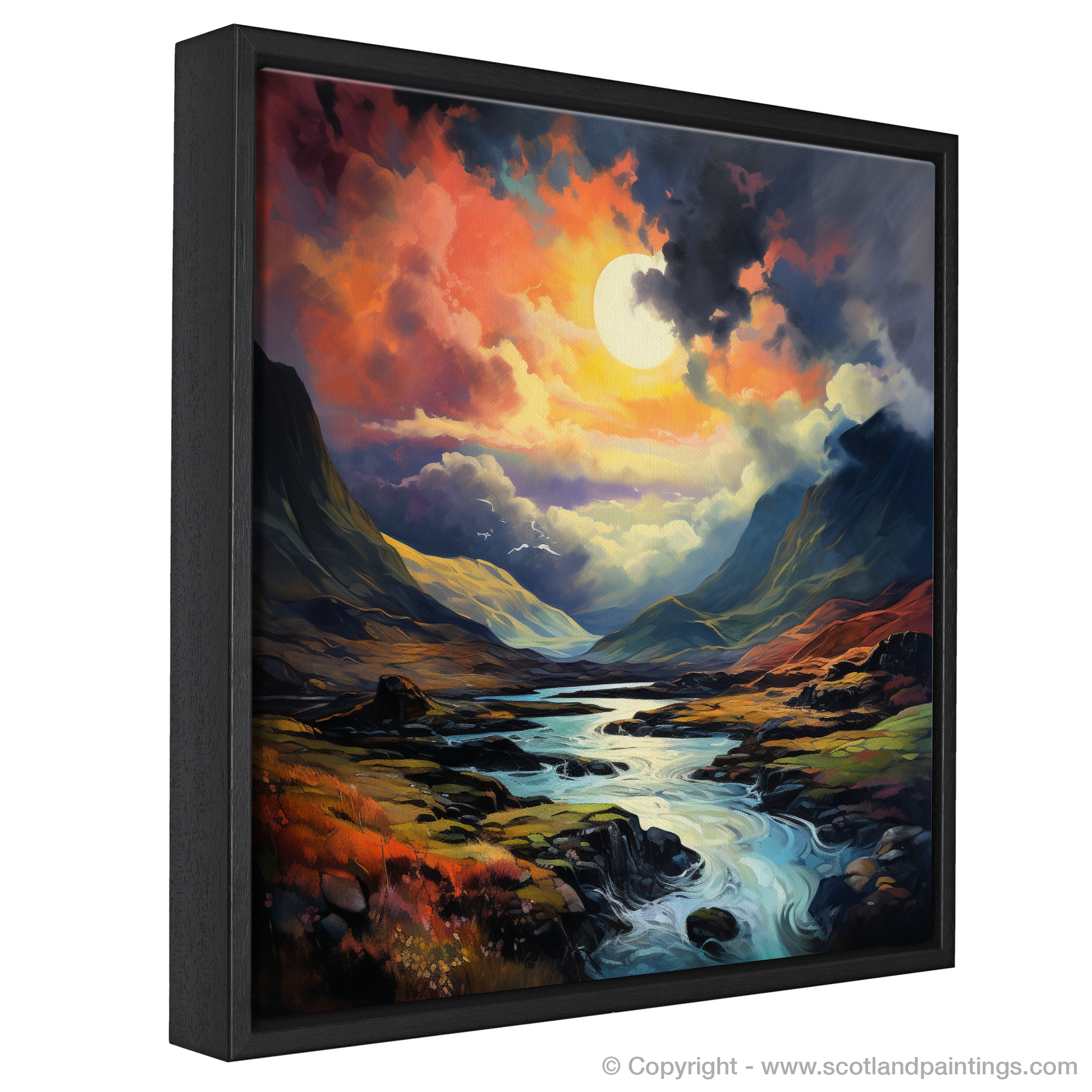 Let the essence of Glencoe's dramatic skies unveil upon your walls with this exquisite print, where the line between dream and reality softly blurs. Bathed in the glow of a luminescent sky, the canvas comes alive with hues of burning orange, deep violet, and soft pinks that dance around an almost supernaturally large moon. This celestial body casts its serene light across the windswept landscape, illuminating the meandering waterways that snake through the rugged terrain.