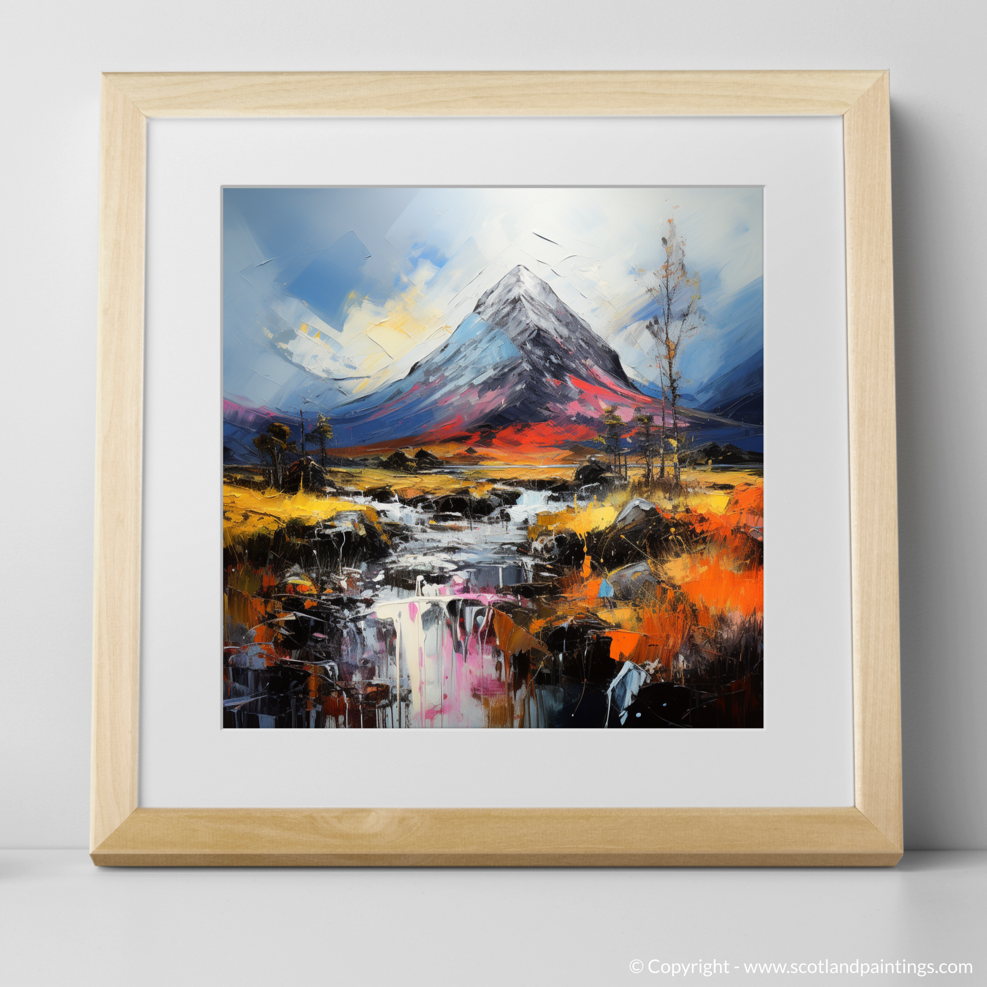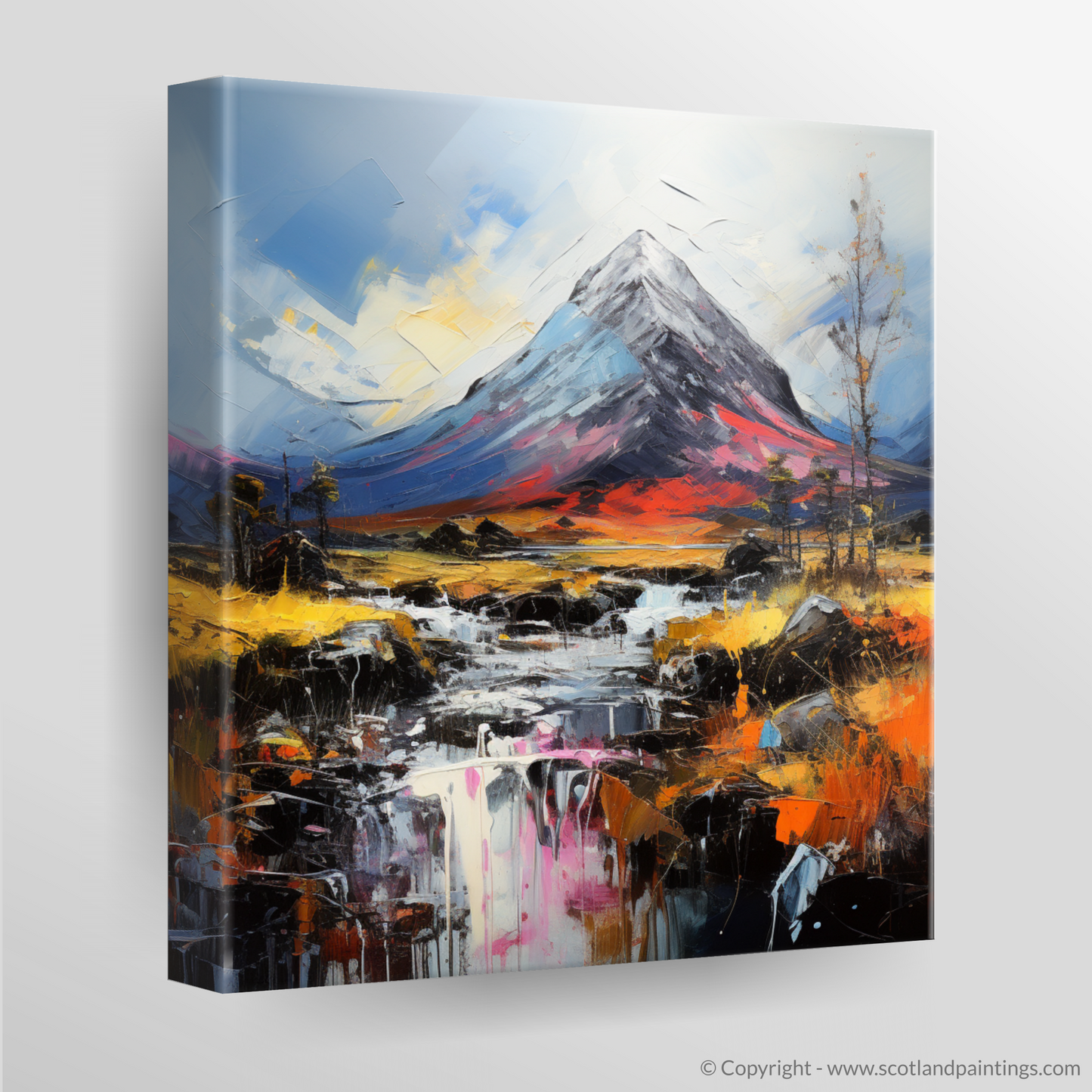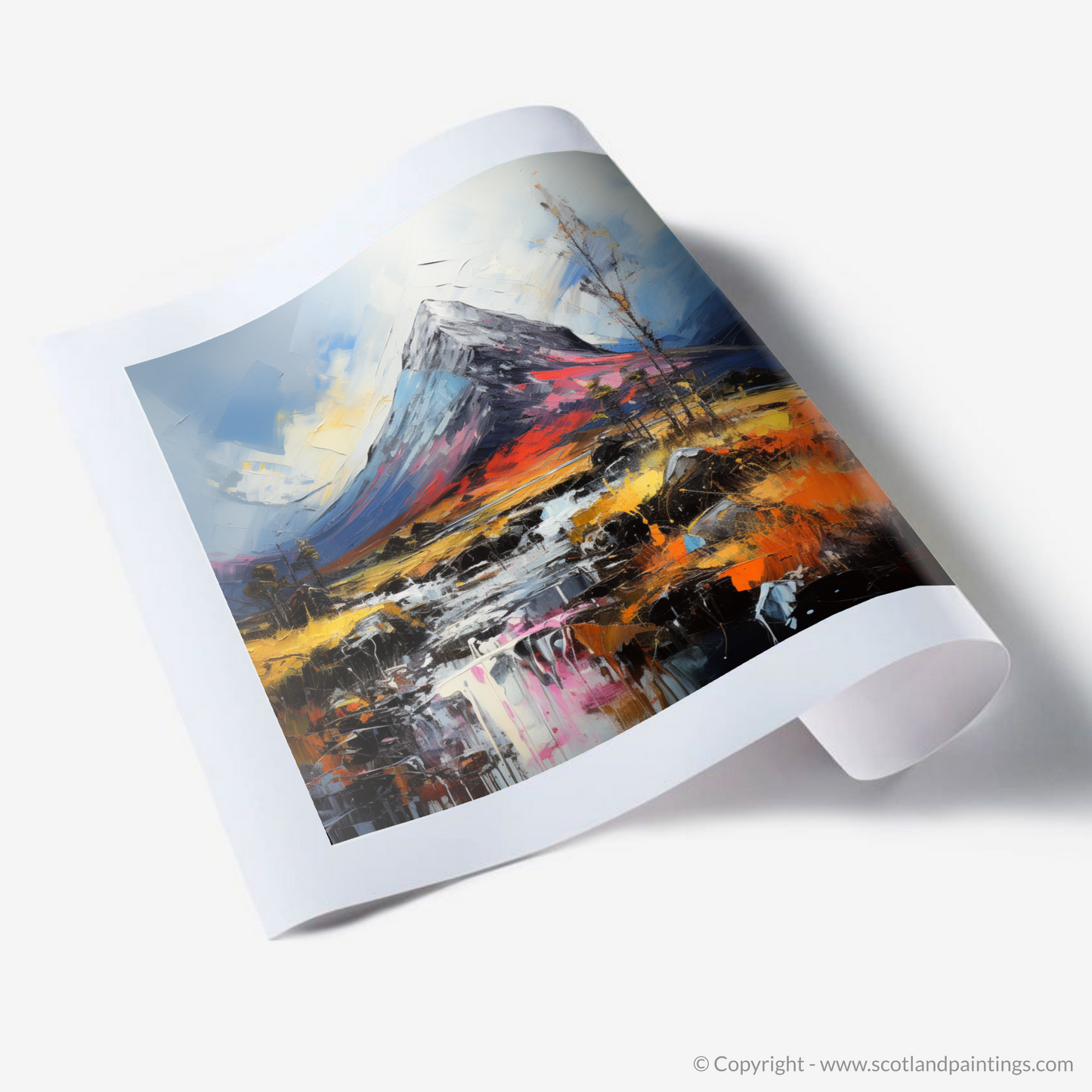 Enveloping the senses in a dance of colour and texture, this evocative piece captures the wild essence of the Scottish Highlands with a nod to the majestic Buachaille Etive Mòr. Swirls of rich, fiery oranges and reds clash with the tranquil blues and purples, drawing your gaze across a landscape rendered with a visceral boldness that can only be attributed to Abstract Impressionism.