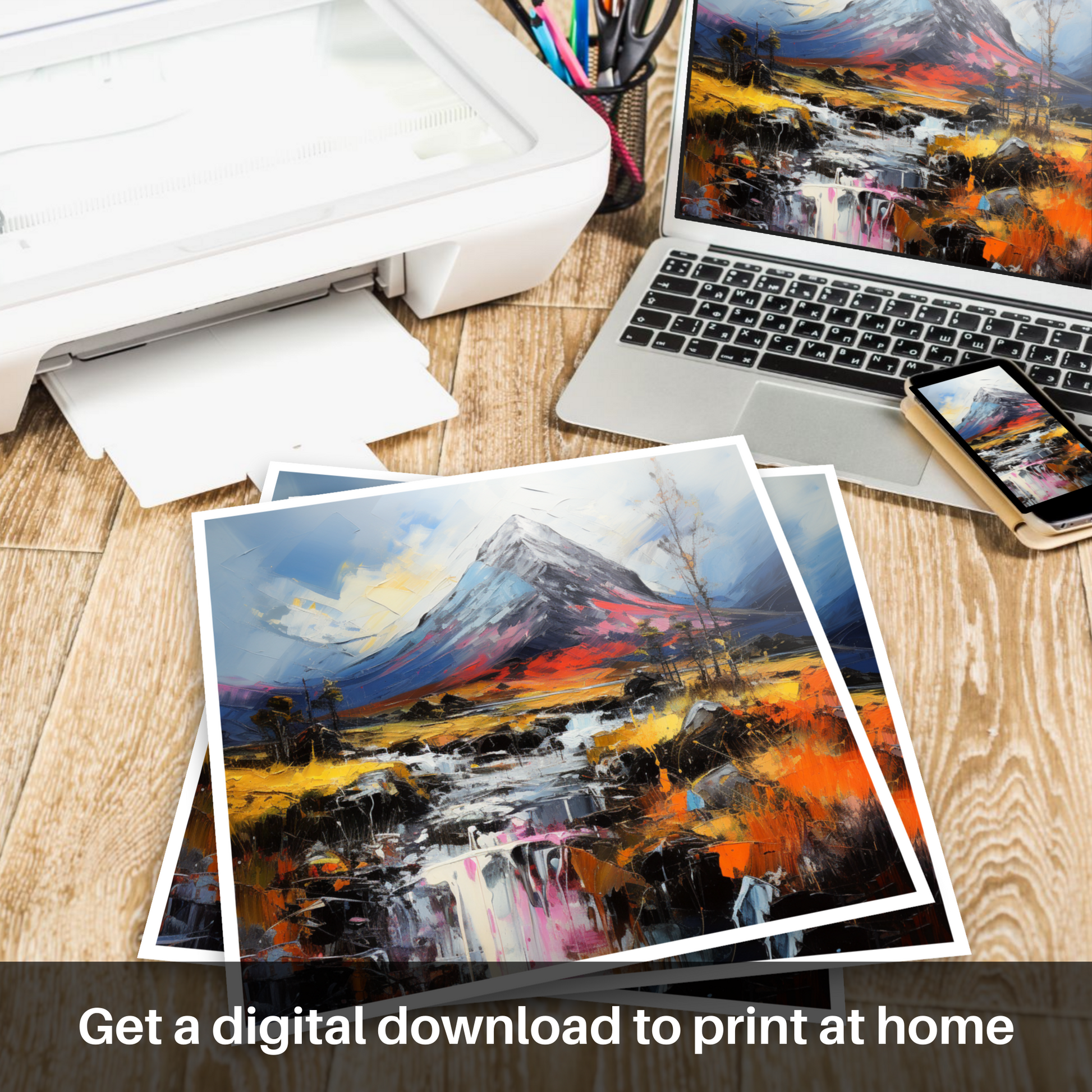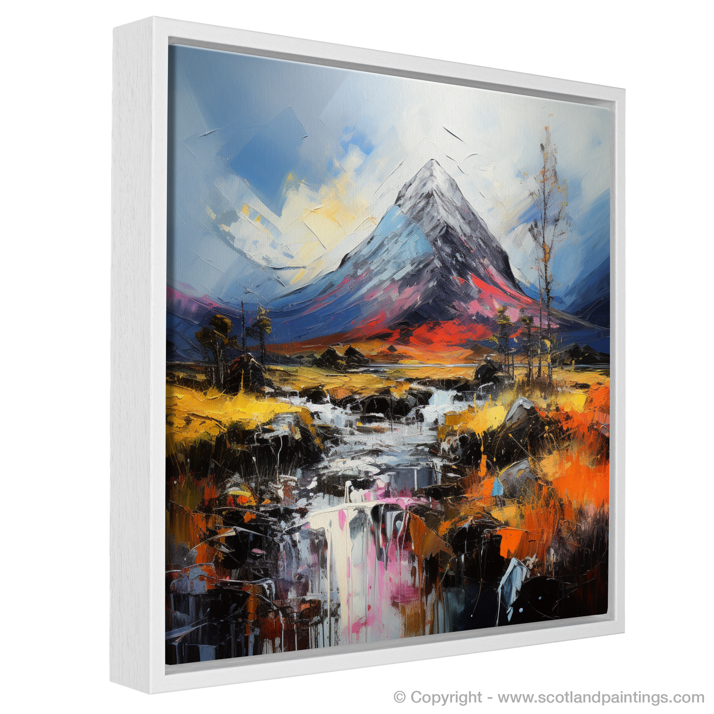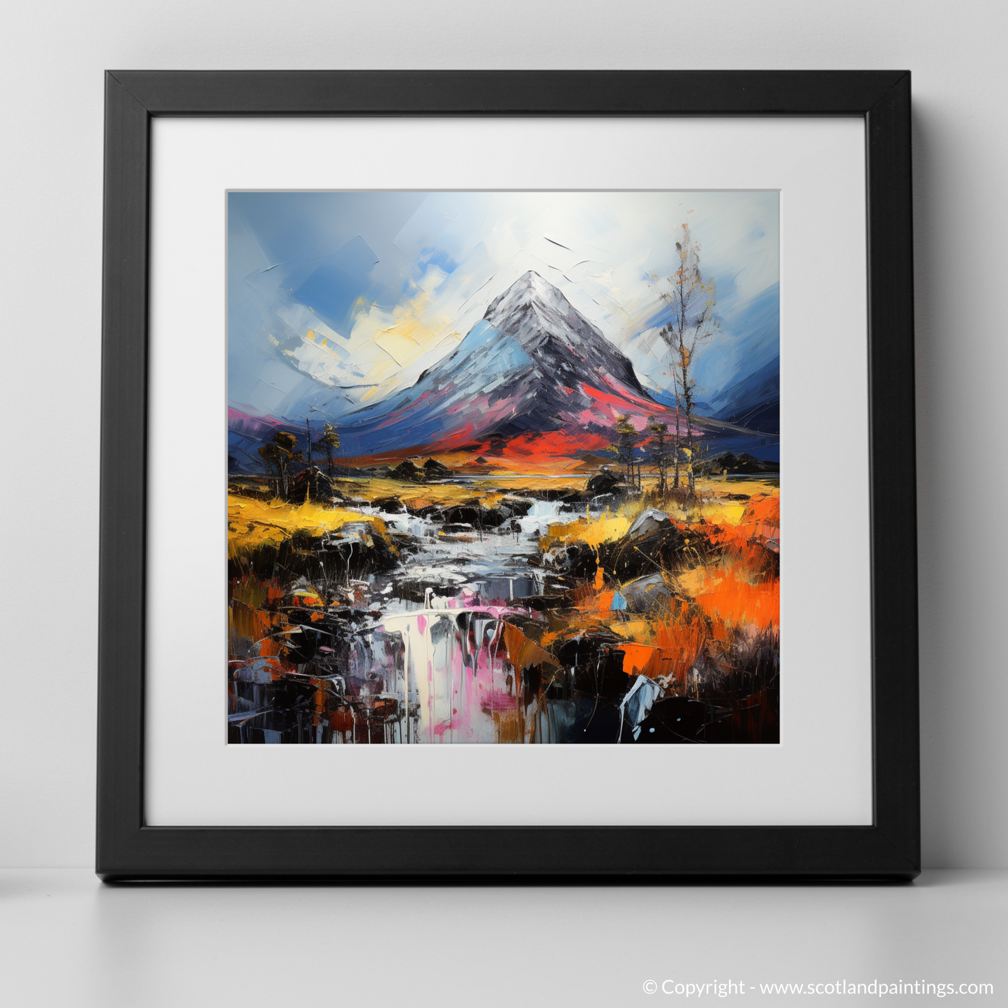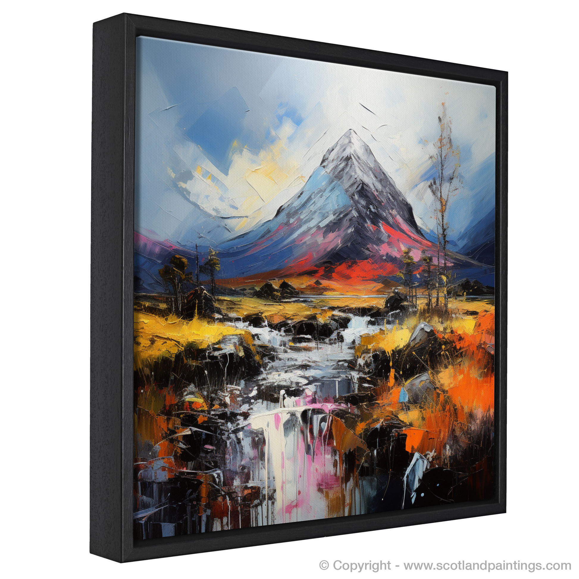 Enveloping the senses in a dance of colour and texture, this evocative piece captures the wild essence of the Scottish Highlands with a nod to the majestic Buachaille Etive Mòr. Swirls of rich, fiery oranges and reds clash with the tranquil blues and purples, drawing your gaze across a landscape rendered with a visceral boldness that can only be attributed to Abstract Impressionism.