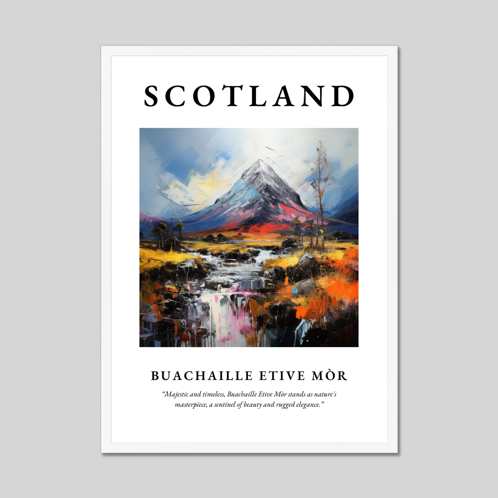 The poster's layout begins with the bold proclamation, “SCOTLAND,” leading your gaze to the vividly expressive painting of Buachaille Etive Mòr. Below, a poetic quote encapsulates the essence of this dominant natural landmark: “Majestic and timeless, Buachaille Etive Mòr stands as nature's masterpiece, a sentinel of beauty and rugged elegance.” This visual and textual homage appeals to art lovers and those with a personal connection to this iconic location.