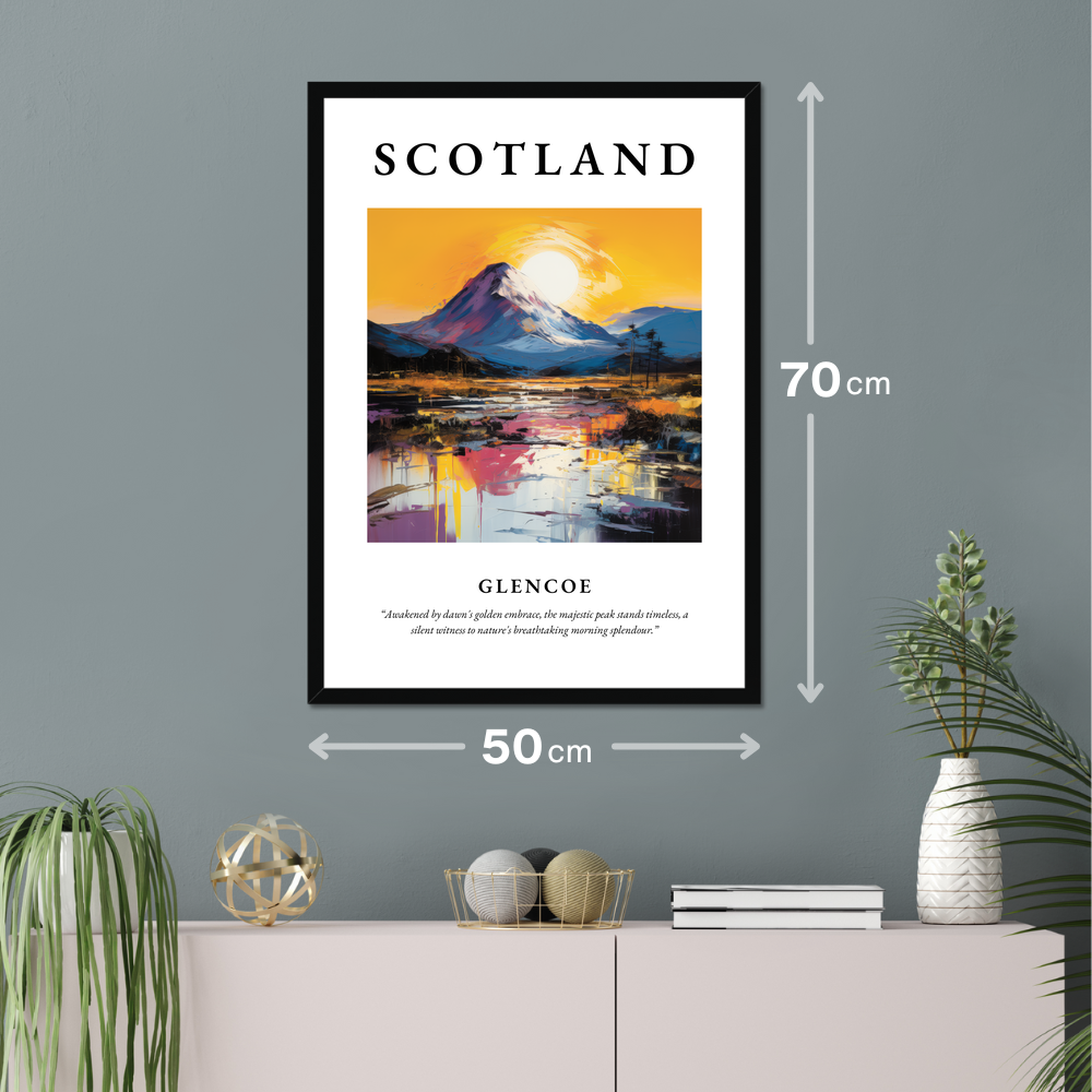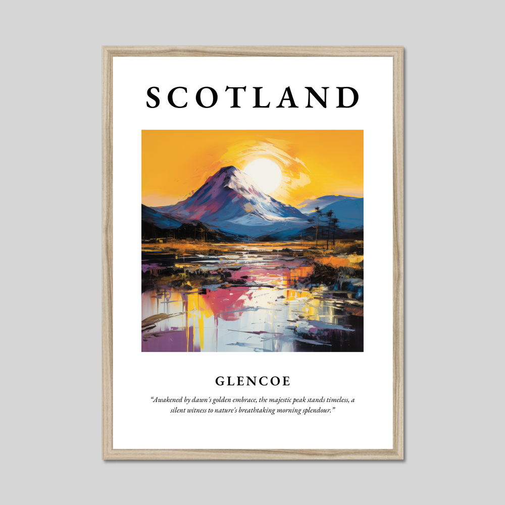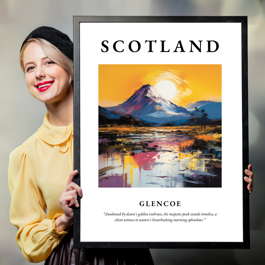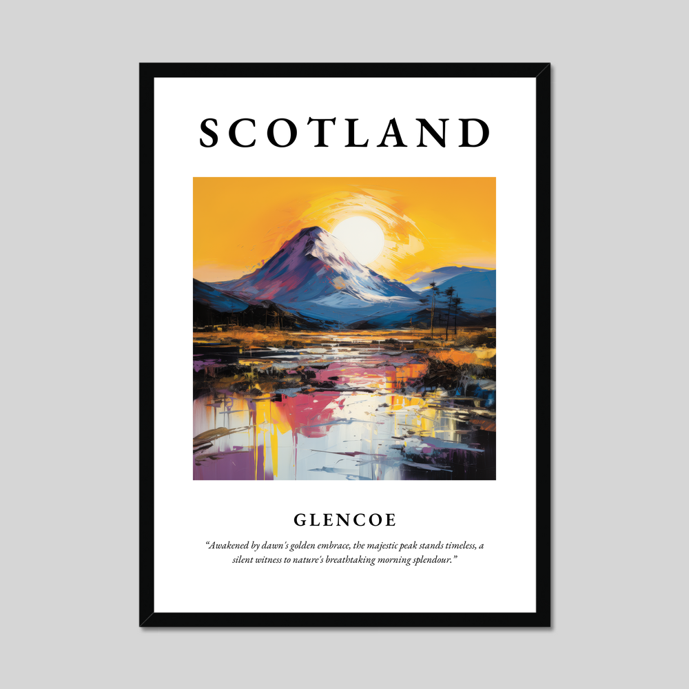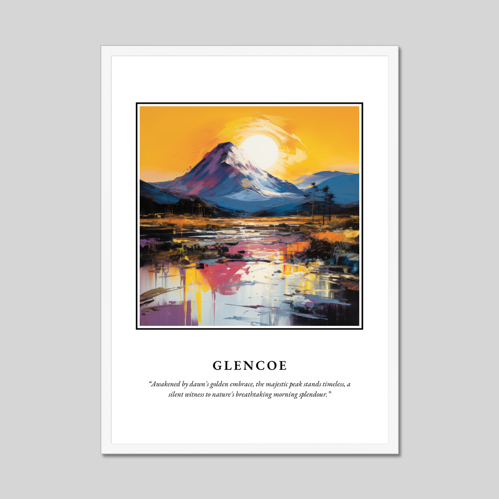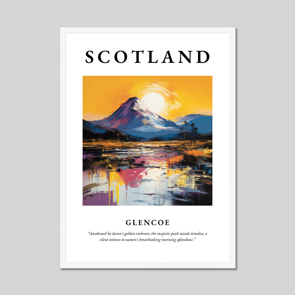 The allure of Glencoe is legendary, with its dramatic landscapes and rich history resonating through the ages. Known for its rugged mountain peaks and sweeping valleys, Glencoe offers a glimpse into the raw beauty of Scotland's wilderness. Often shrouded in mist and mystery, it's a place where past and present collide, offering endless inspiration to artists and poets alike. This poster captures that very essence, echoing the landscape's timeless beauty and the glistening promise of dawn upon its peaks.
