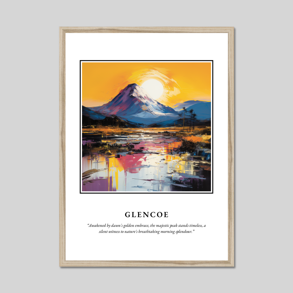 Beneath this vivid portrayal lies the poignant quote: "Awakened by dawn's golden embrace, the majestic peak stands timeless, a silent witness to nature's breathtaking morning splendour." This quote enhances the artwork, offering a narrative element that evokes the haunting beauty of Glencoe at sunrise.