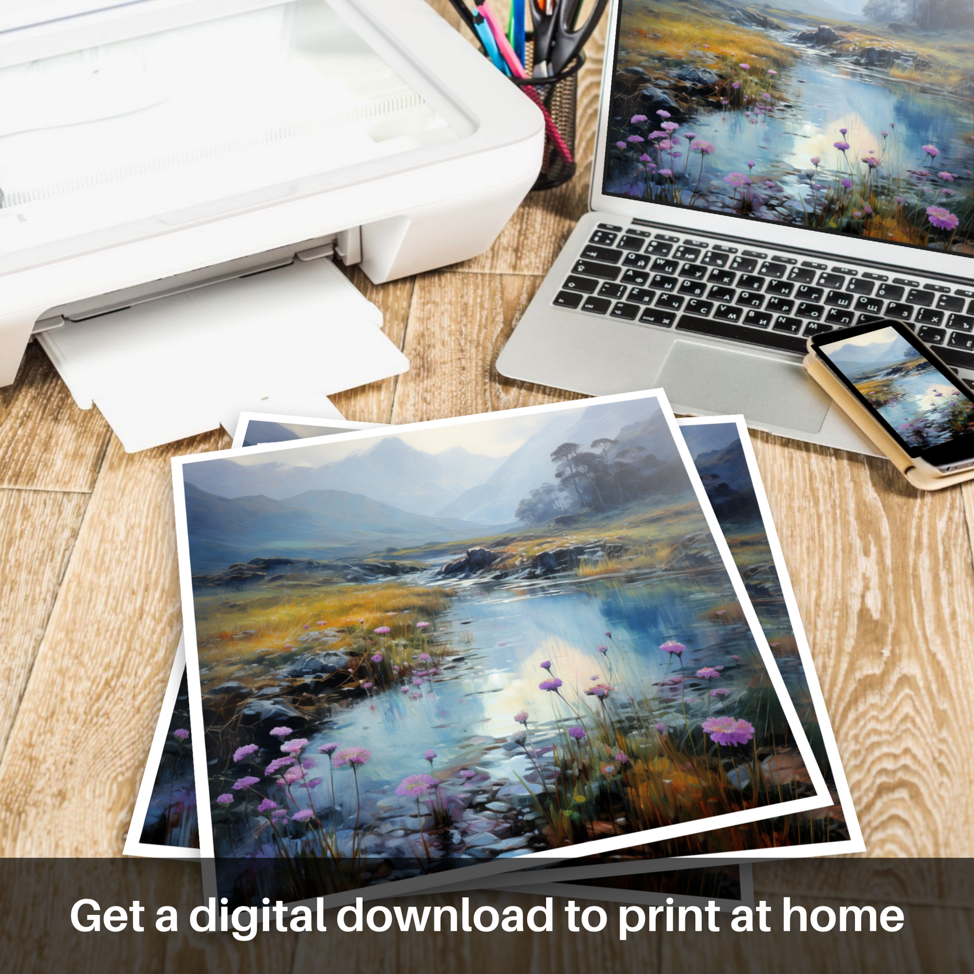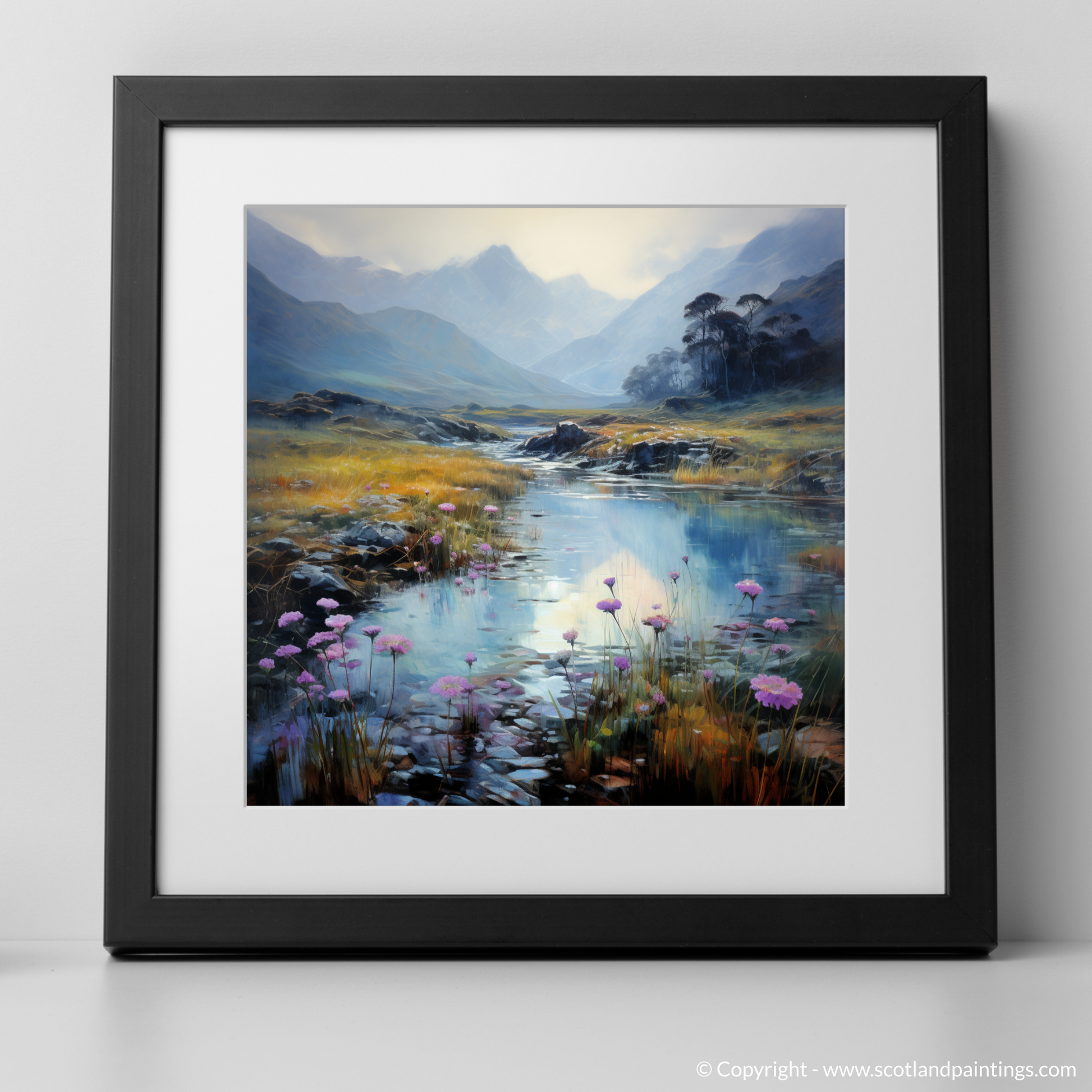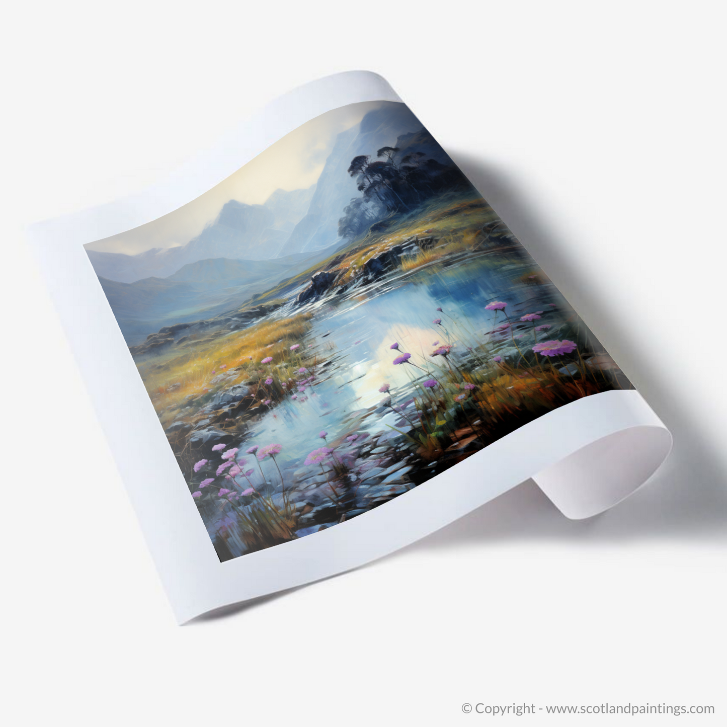 Capturing the ethereal beauty of the Scottish Highlands, this exquisite print taps into the Art Nouveau ethos, blending natural forms with elegant, stylised designs. Gentle morning light filters through the mist, casting a soft glow over the rugged landscape of Glencoe, effortlessly guiding the eye through the serene vista of undulating hills and tranquil waters.