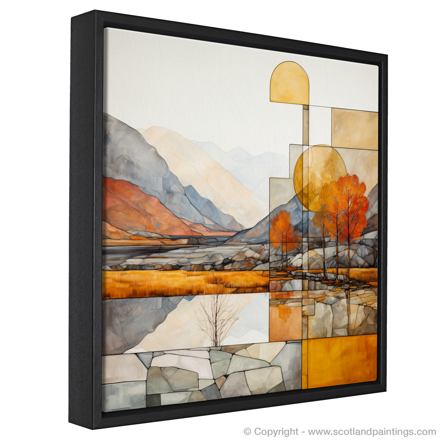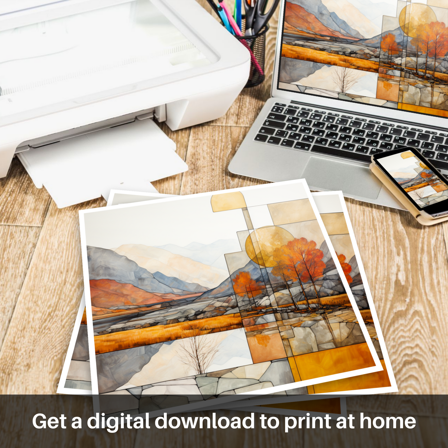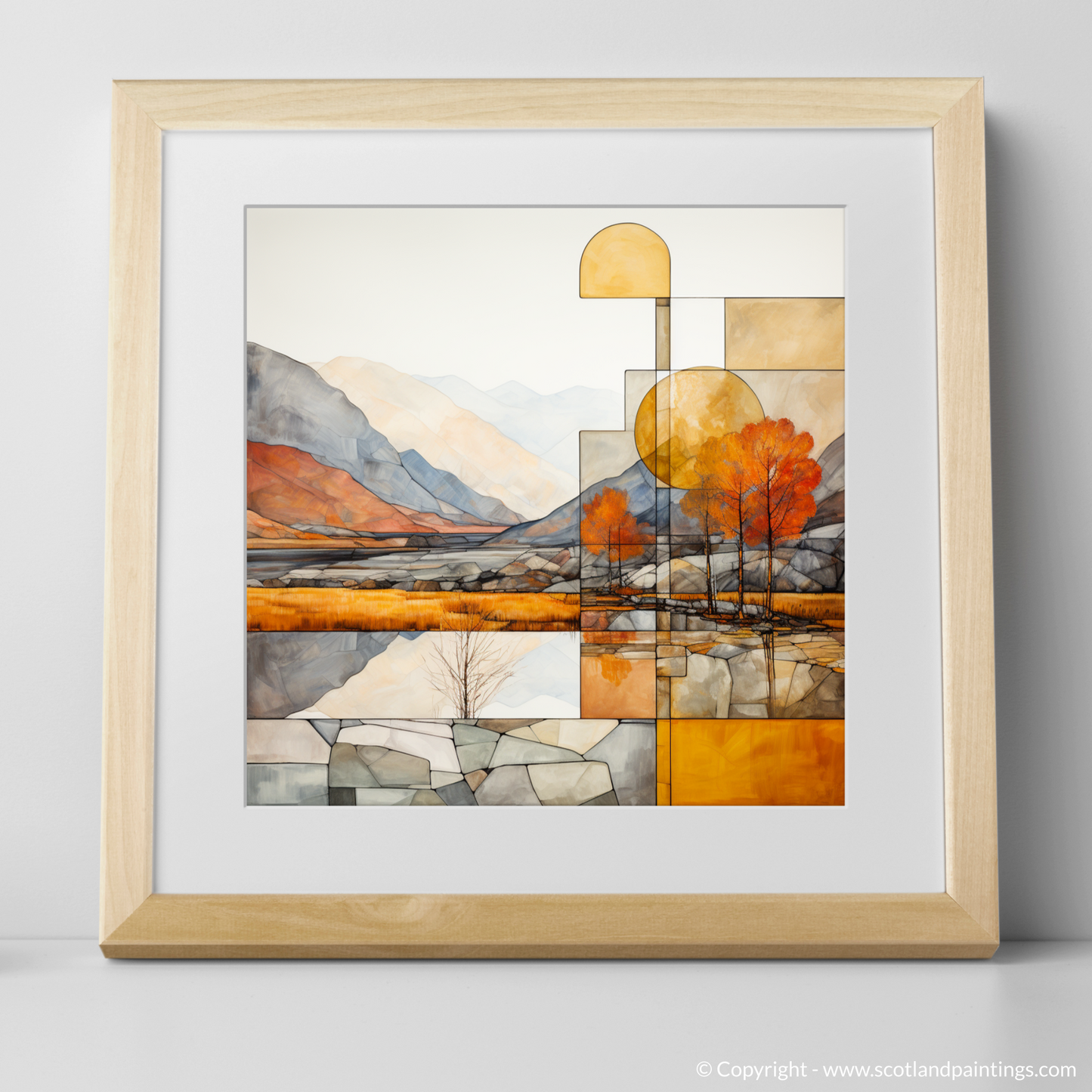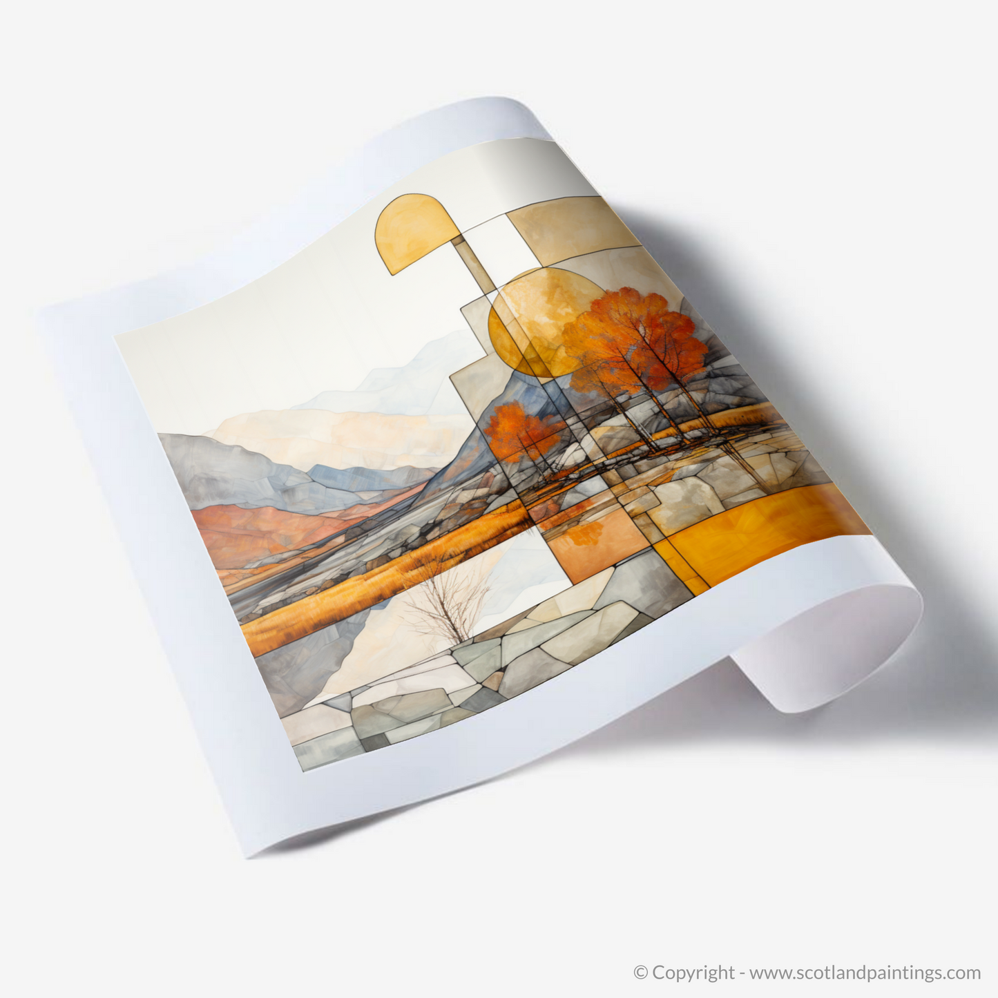 Immerse yourself in the striking abstraction of Glencoe's Autumn majesty with this exquisite print, a tapestry of warm colours and textured layers that captures the essence of the changing season. The artwork vividly portrays the organic ebb and flow of nature through a series of bold geometric shapes and soft, flowing lines that coalesce to form a harmonious and thought-provoking landscape.