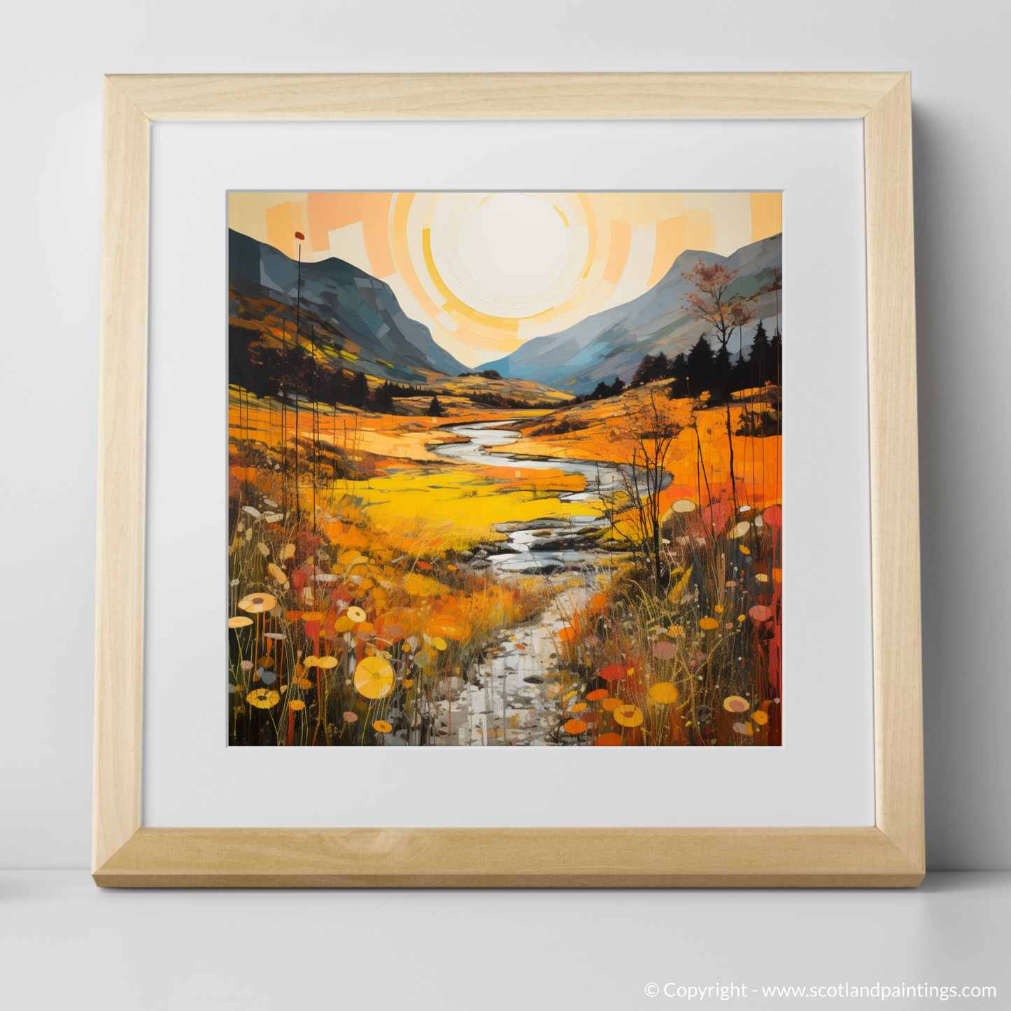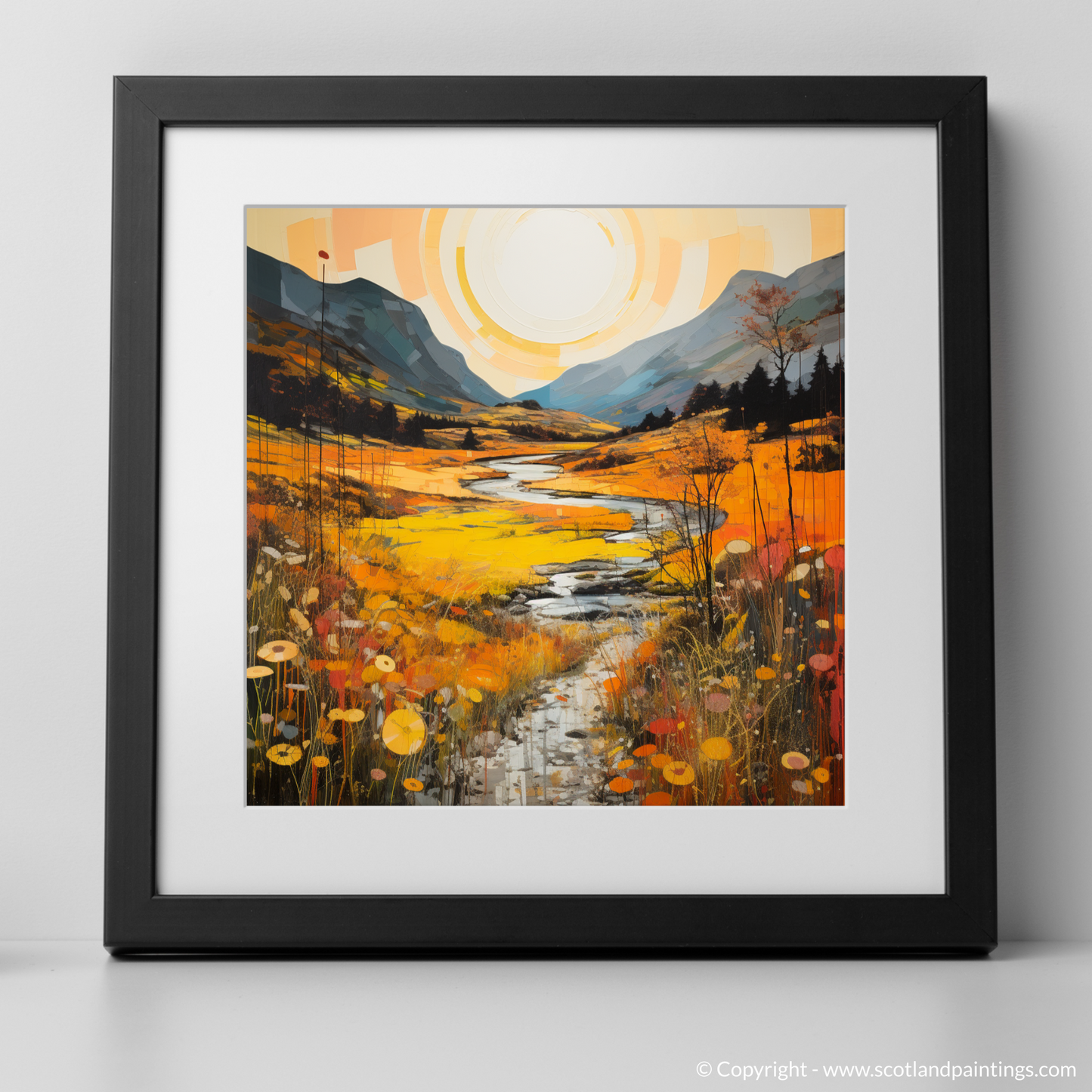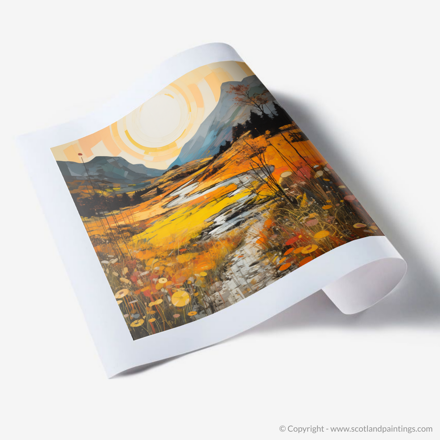 Immerse yourself in the warm embrace of autumn as the Highland's golden bracken unfurls across this evocative print. A serene ode to the majesty of Glencoe, this piece captures the essence of the Scottish landscapes with a gloriously warm palette. Deep amber, burnt orange, and mustard yellows cascade through the scene, evoking the natural splendour of the bracken in its peak season.