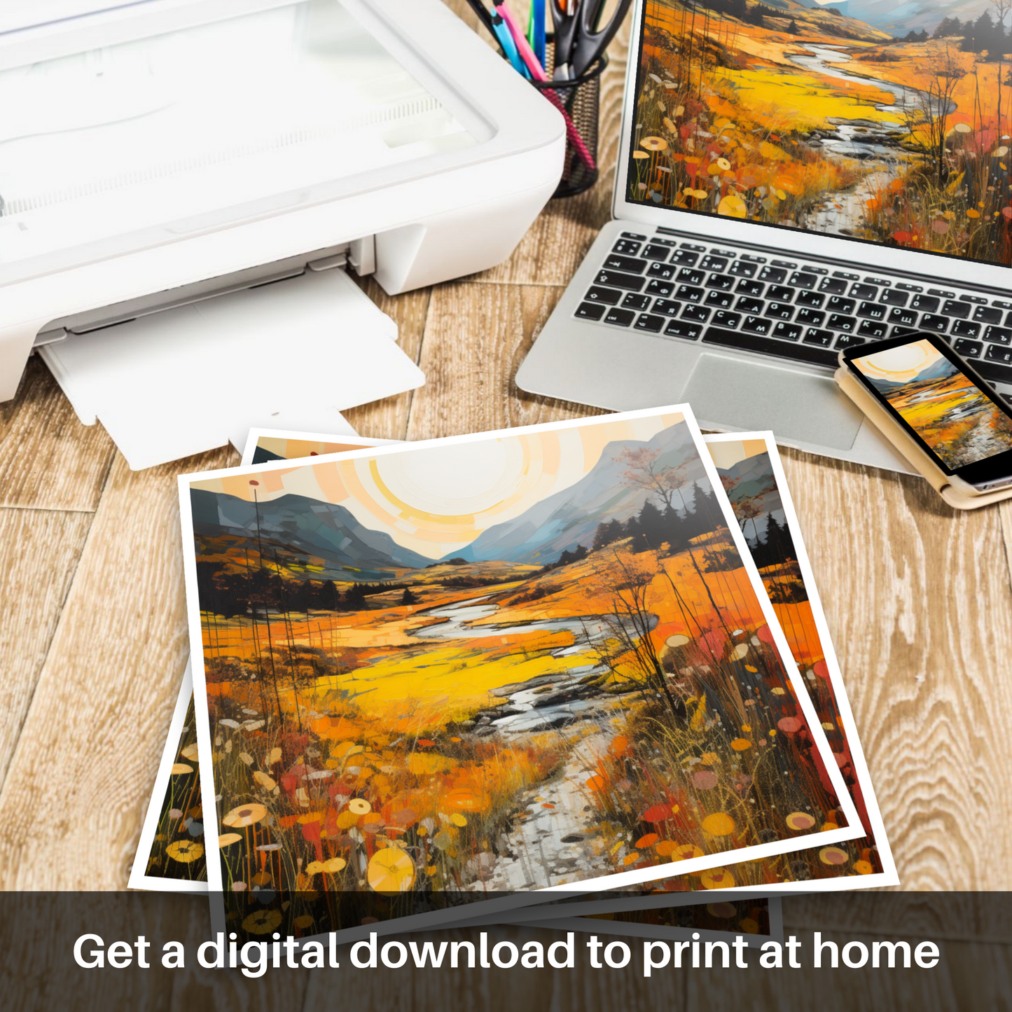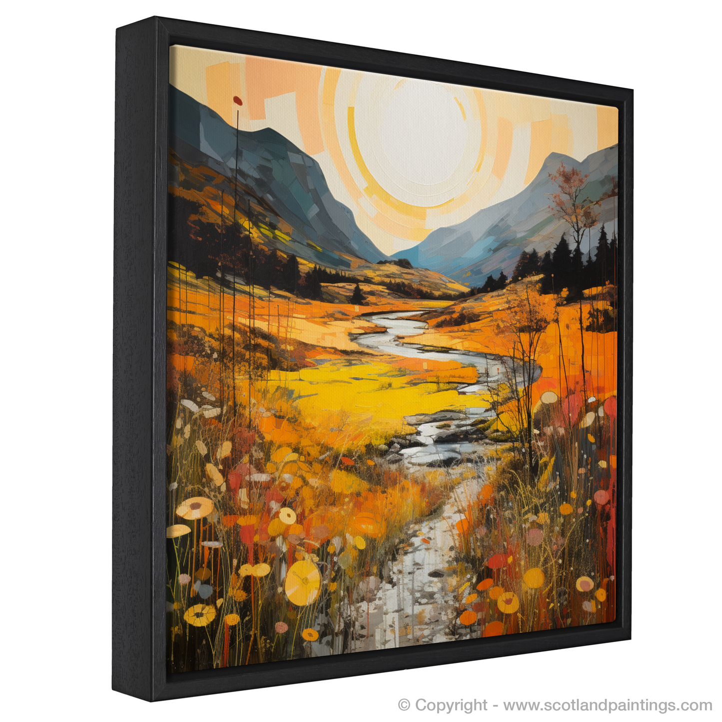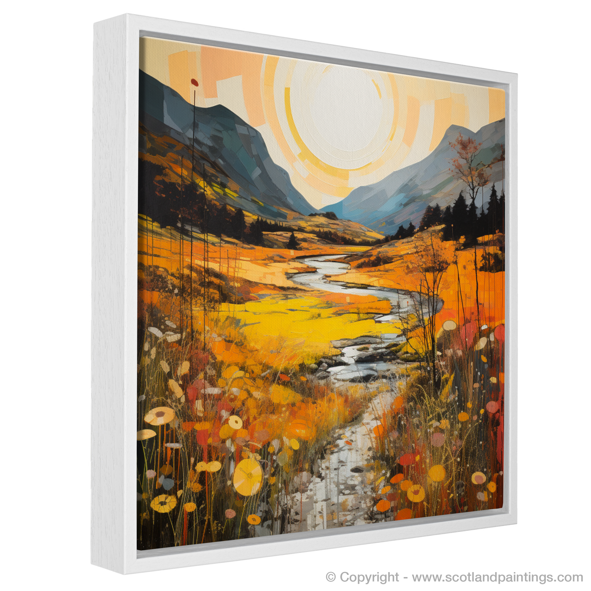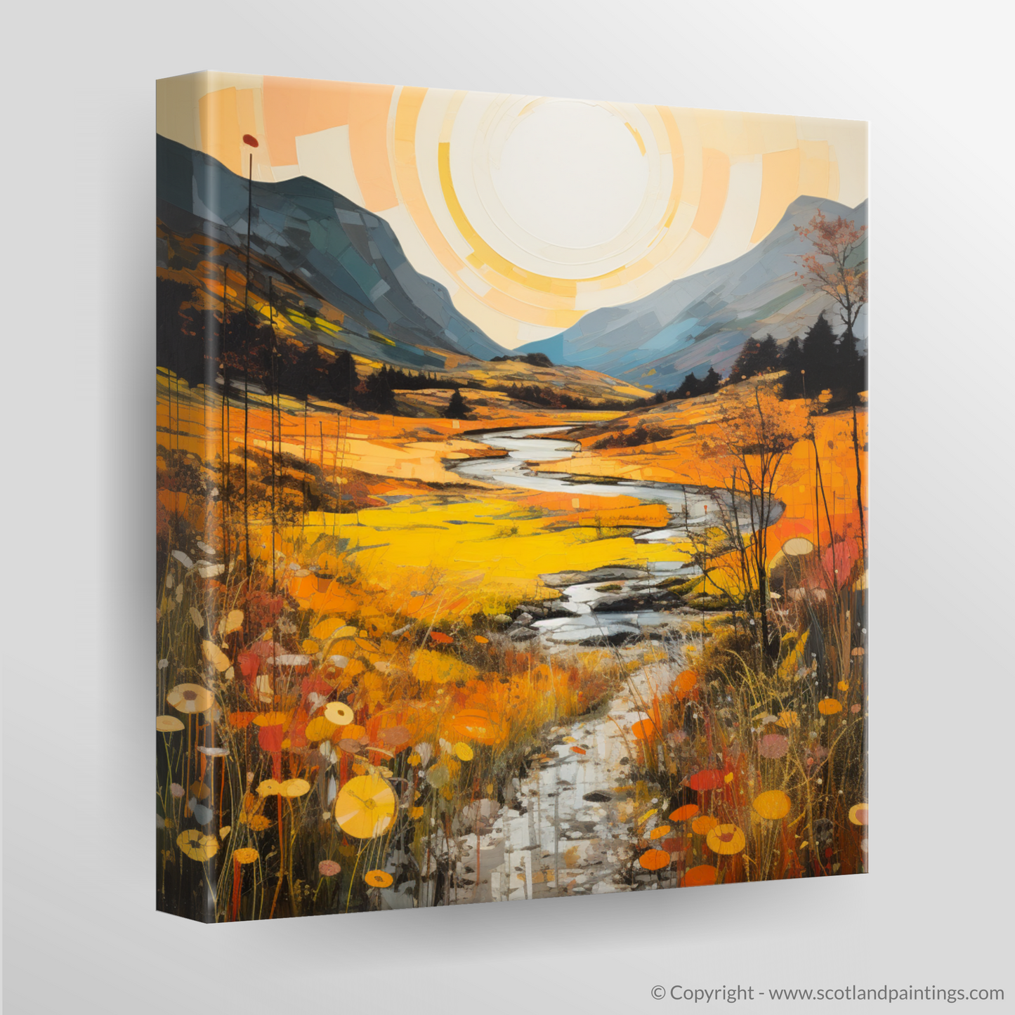Immerse yourself in the warm embrace of autumn as the Highland's golden bracken unfurls across this evocative print. A serene ode to the majesty of Glencoe, this piece captures the essence of the Scottish landscapes with a gloriously warm palette. Deep amber, burnt orange, and mustard yellows cascade through the scene, evoking the natural splendour of the bracken in its peak season.