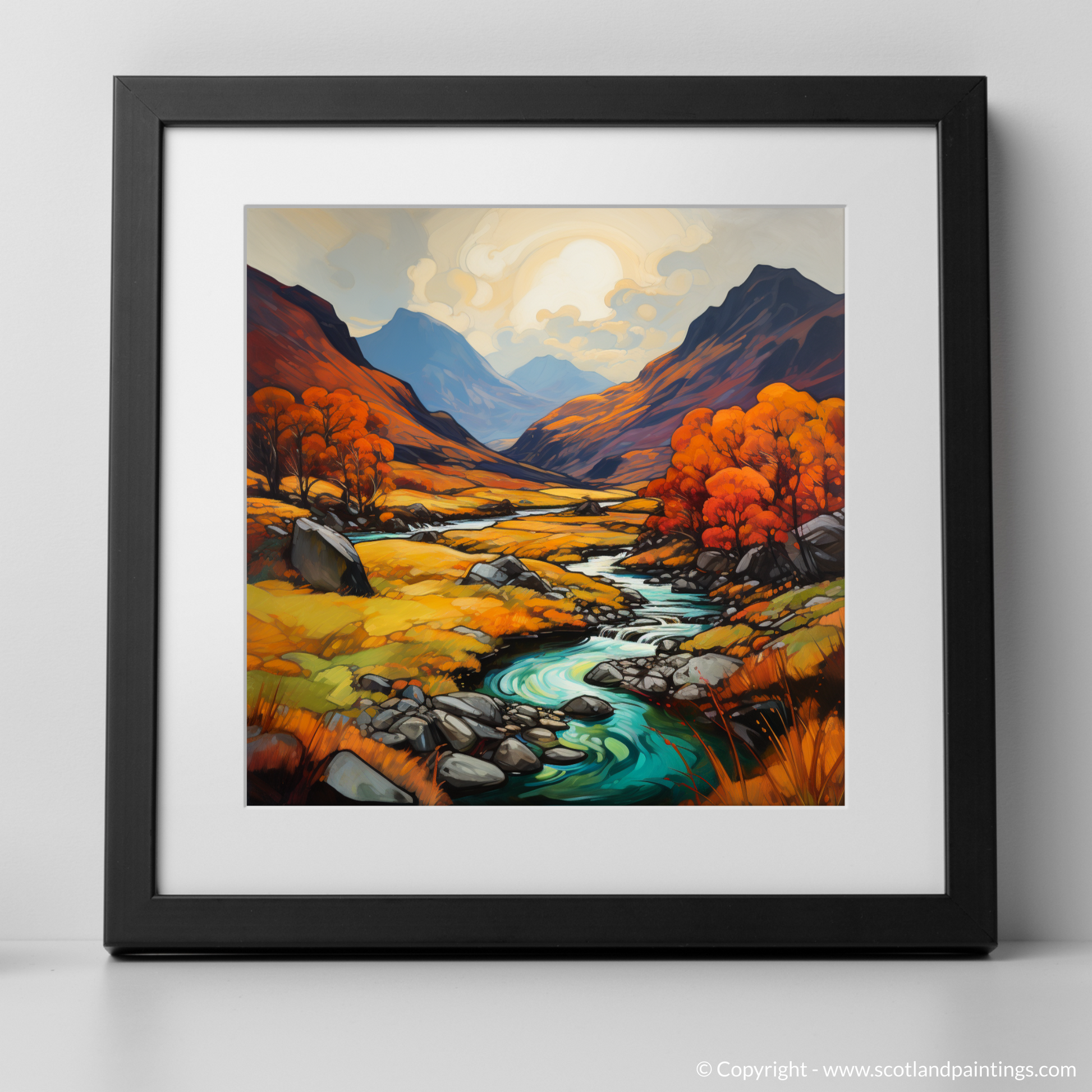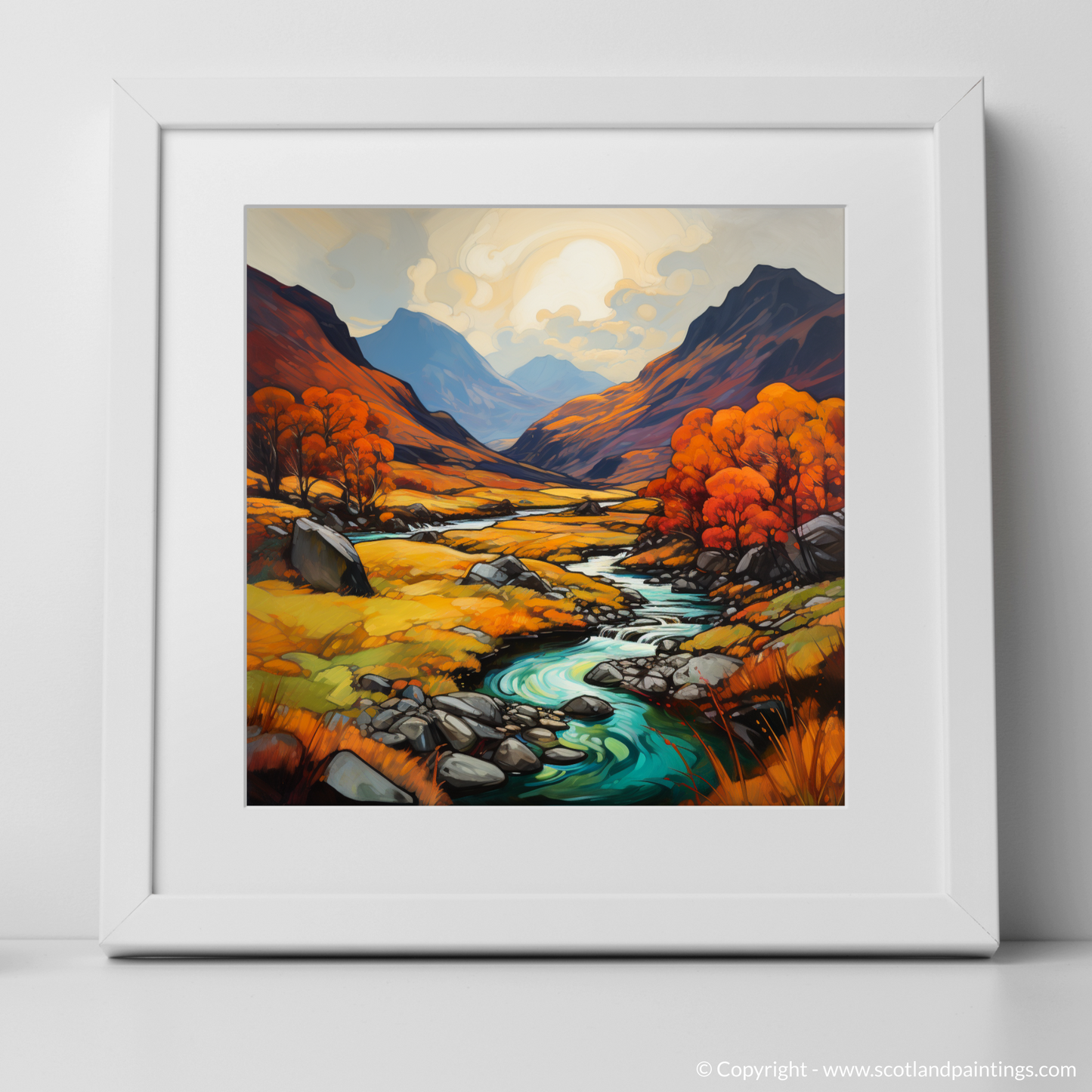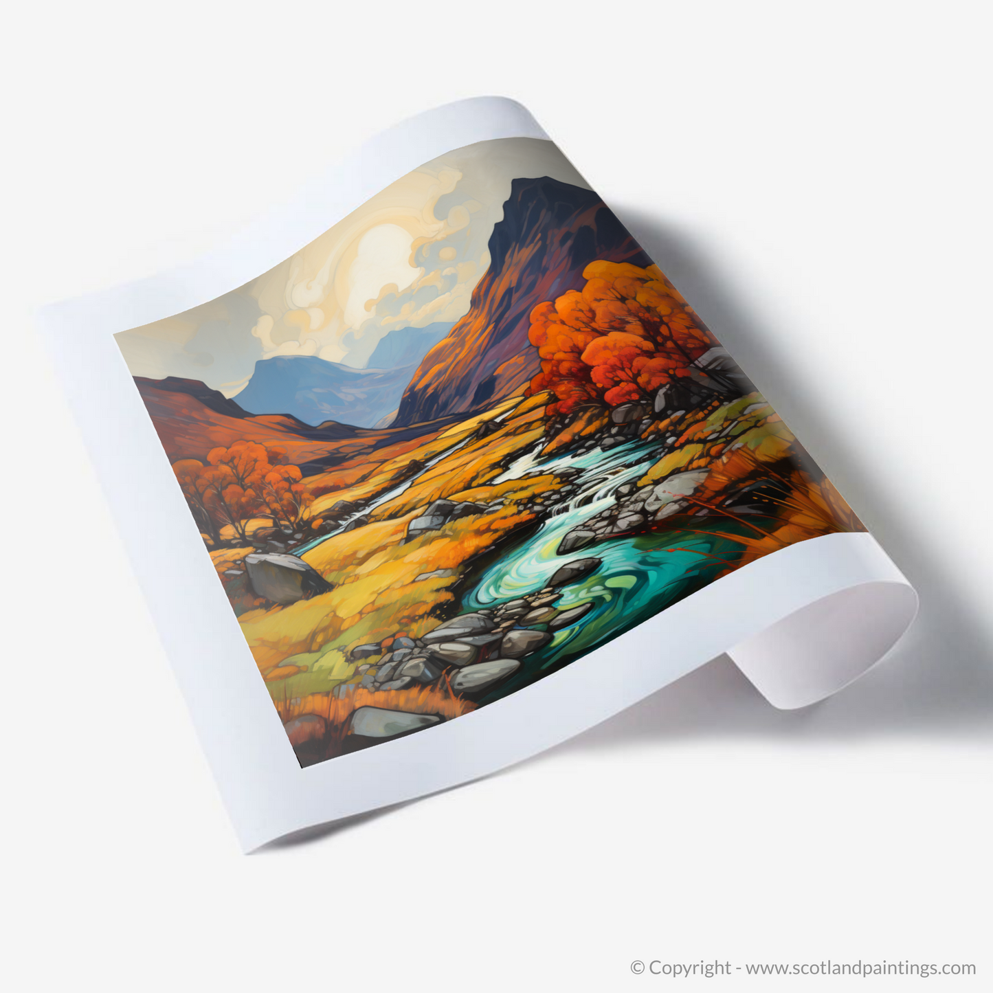 Immerse yourself in the fiery embrace of Autumn with this captivating print, a medley of geometric splendour and natural beauty reminiscent of Glencoe's breathtaking scenery. Swirls of a vivid turquoise stream dance playfully through the heart of this piece, carving a serpentine path through the warm golden hues of the surrounding moorland. Majestic mountains rise in the background, their silhouettes softened by a hazy sky where the subtle gradation of golden light fades into a soft blue, encapsulating the tranquil essence of a late afternoon in the highlands.