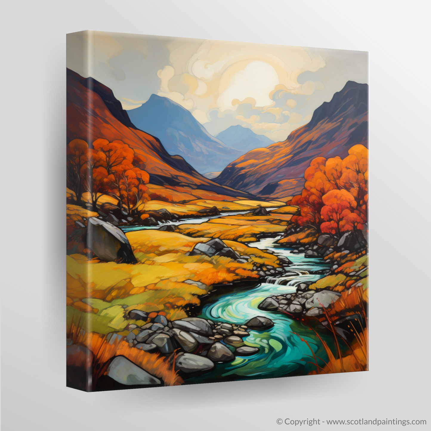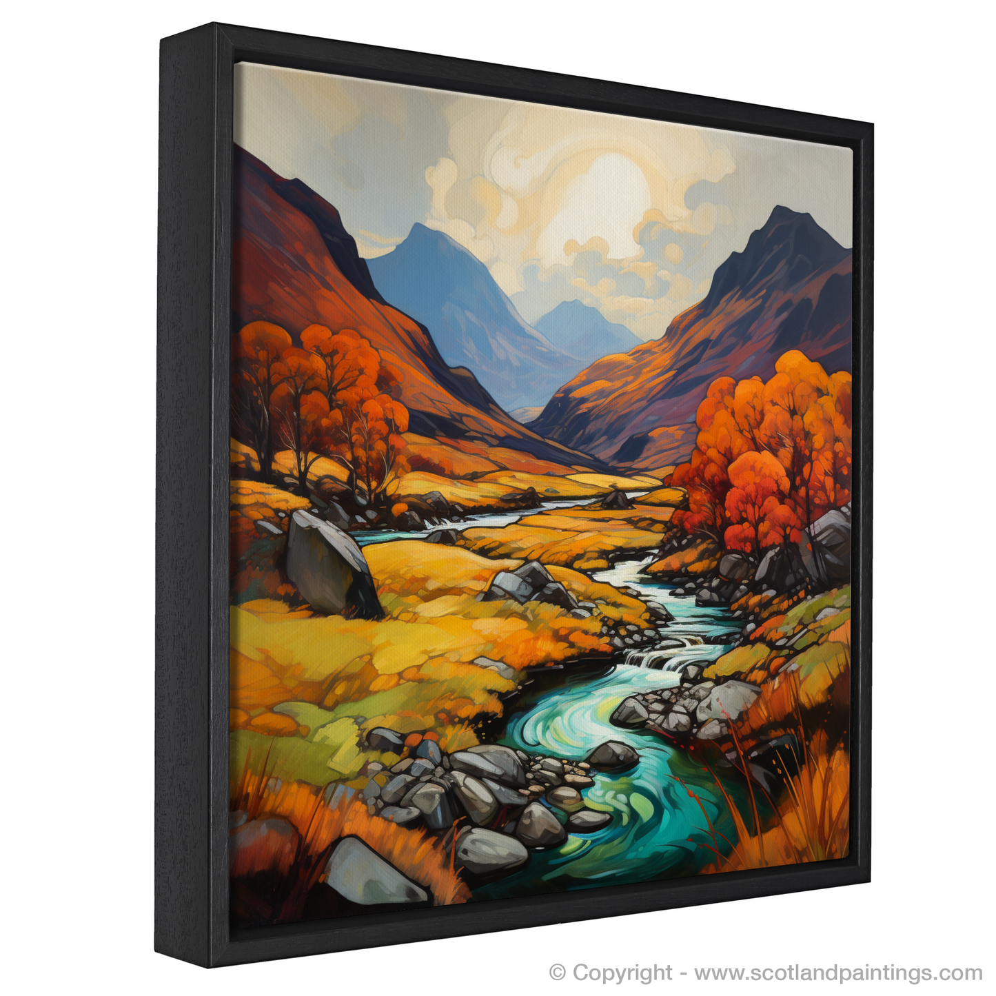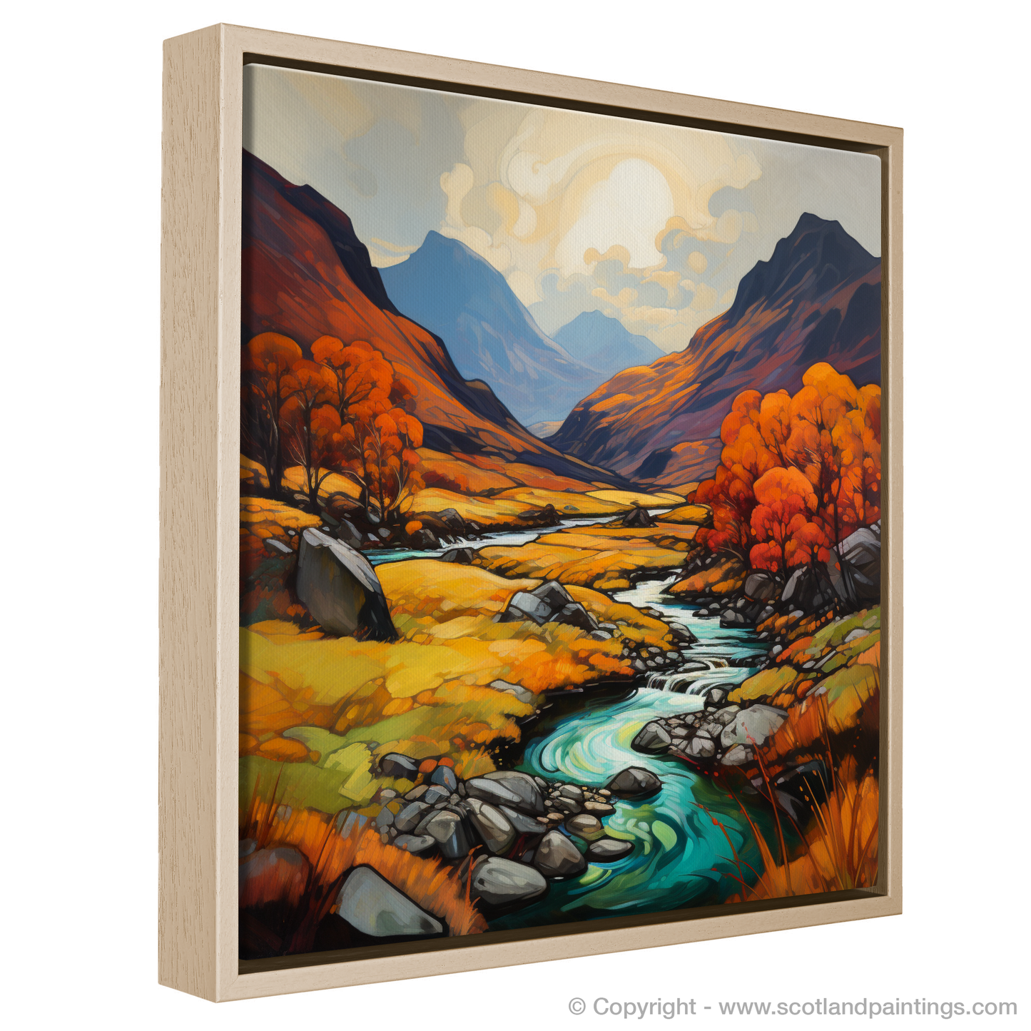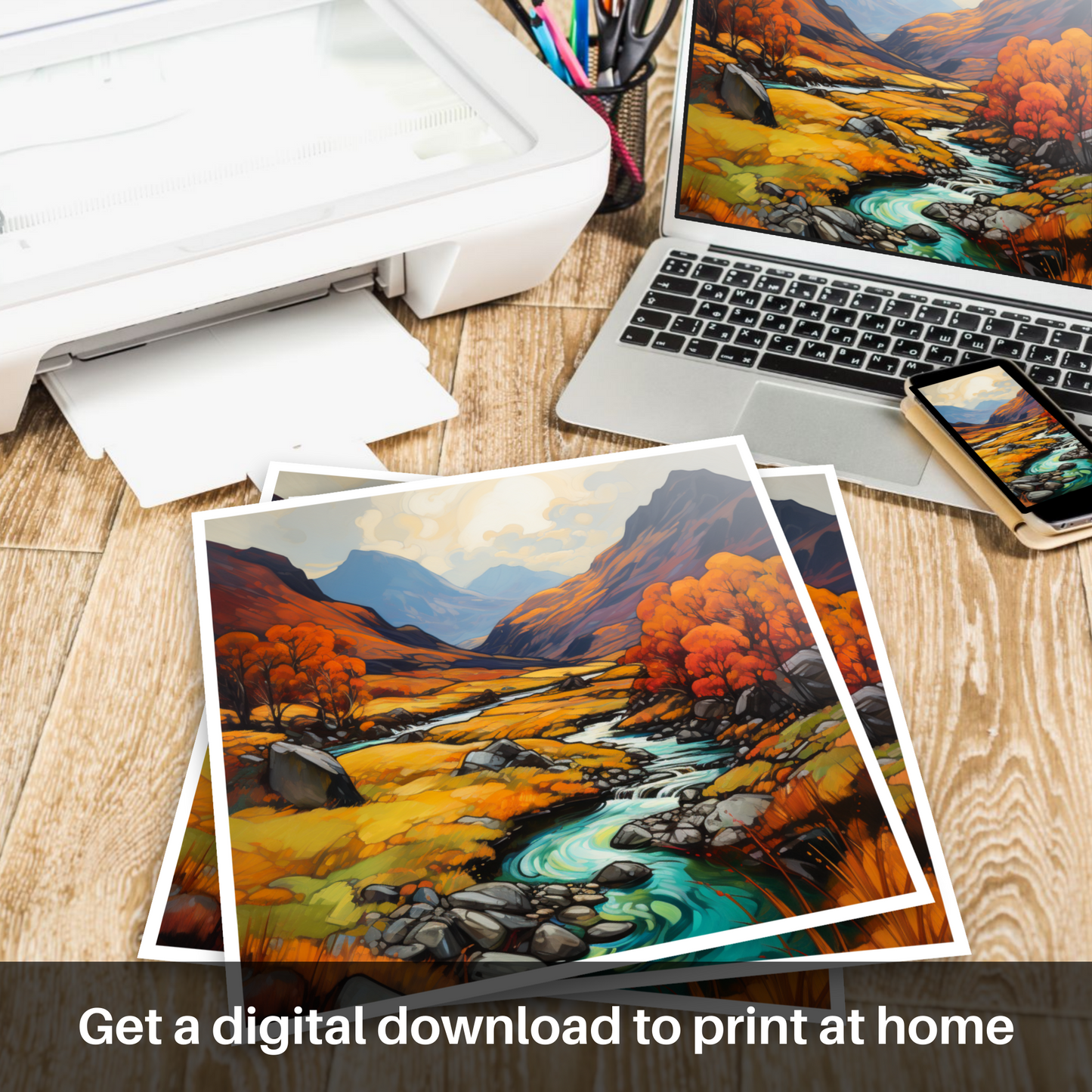Immerse yourself in the fiery embrace of Autumn with this captivating print, a medley of geometric splendour and natural beauty reminiscent of Glencoe's breathtaking scenery. Swirls of a vivid turquoise stream dance playfully through the heart of this piece, carving a serpentine path through the warm golden hues of the surrounding moorland. Majestic mountains rise in the background, their silhouettes softened by a hazy sky where the subtle gradation of golden light fades into a soft blue, encapsulating the tranquil essence of a late afternoon in the highlands.