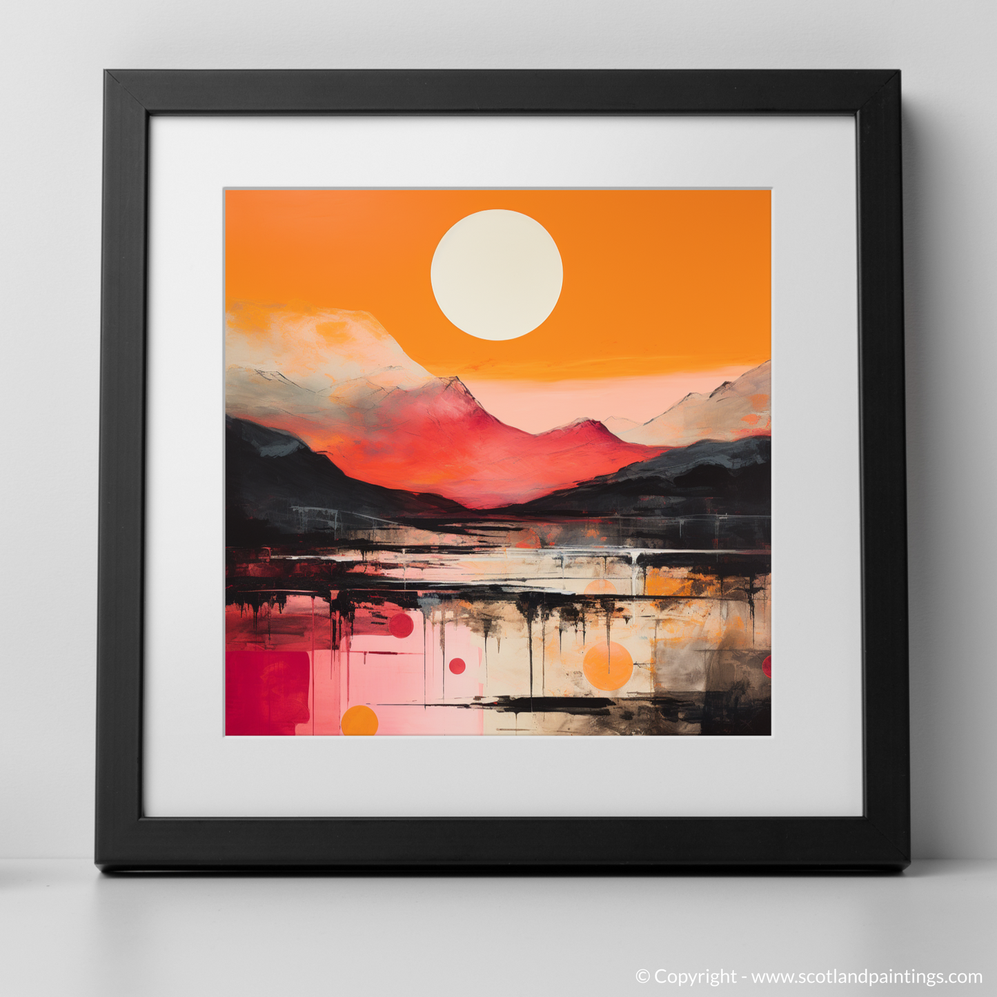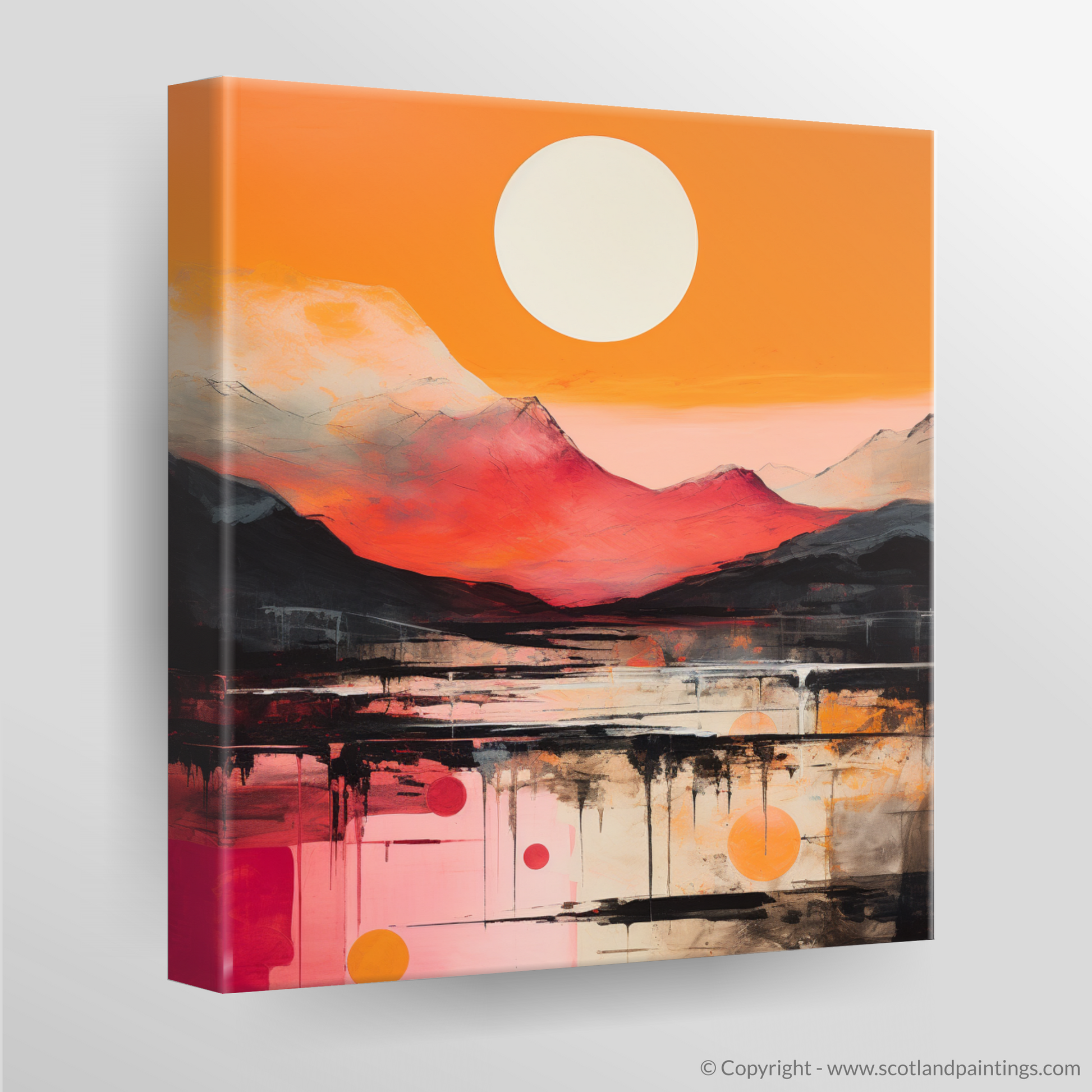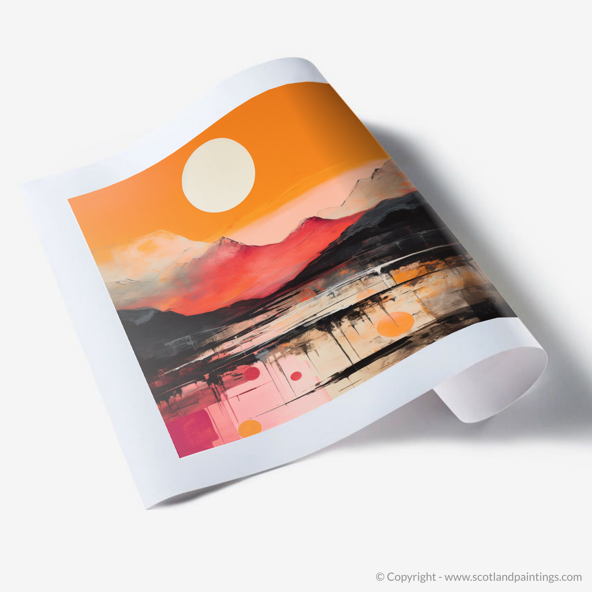 Emanating an aura of raw emotion and beauty, this exquisite print captures the essence of Glencoe’s sunset glow through the vibrant lens of Abstract Expressionism. Bold brushstrokes and an audaciously vivid palette of fiery oranges, deep reds, and gentle whites create a dynamic interplay of colour that dances across the canvas, reminiscent of the Scottish highlands bathed in the evening's amber light.