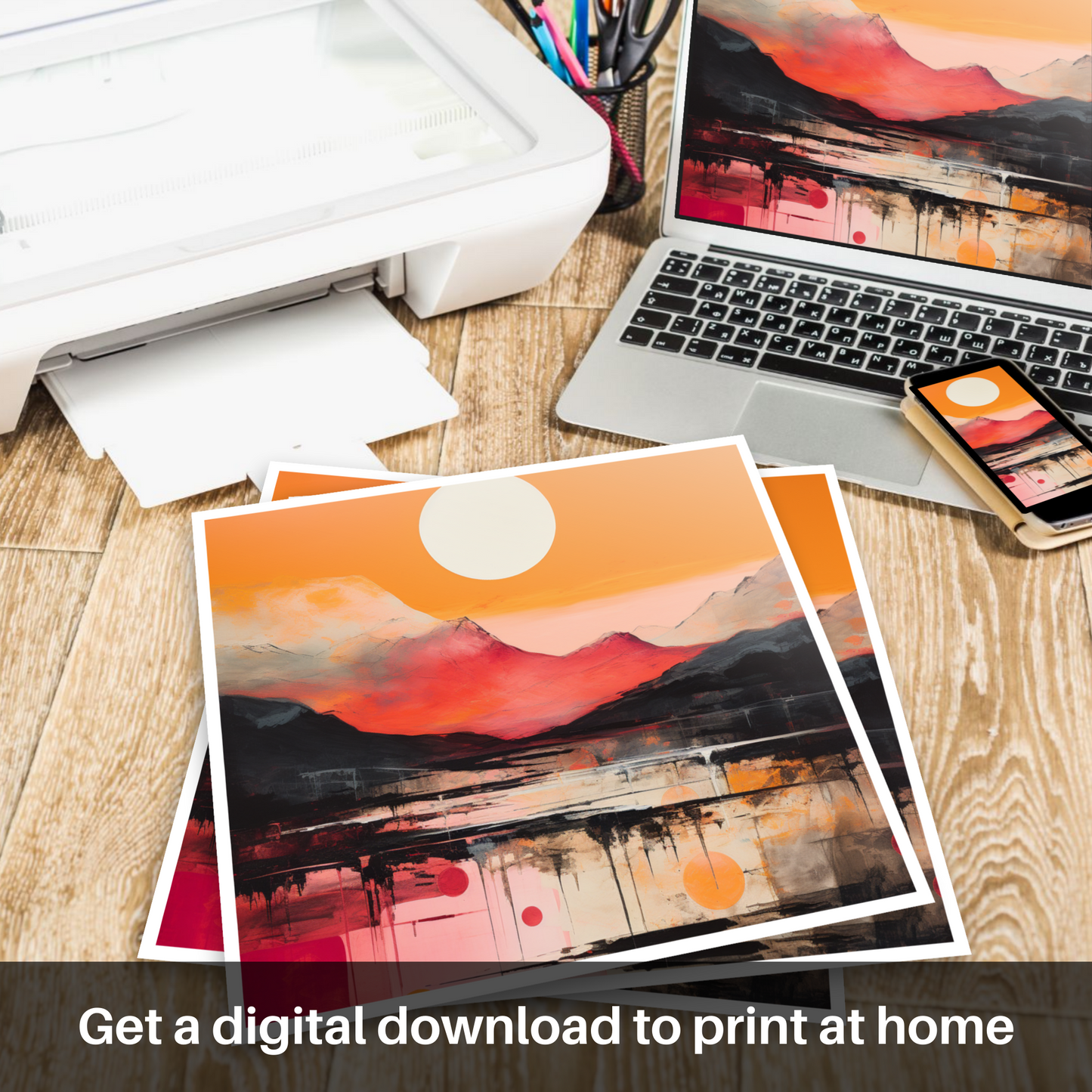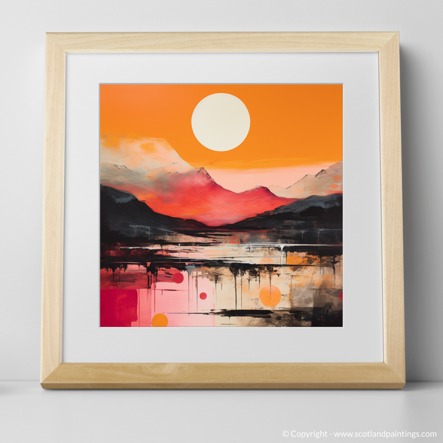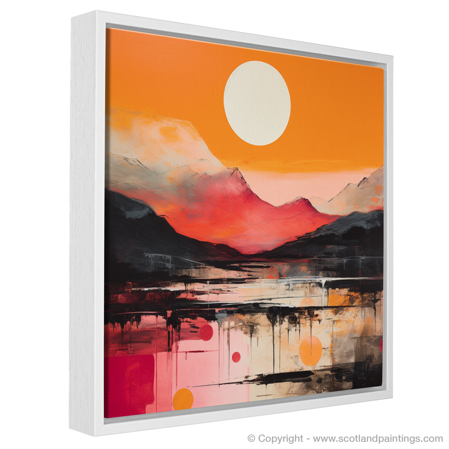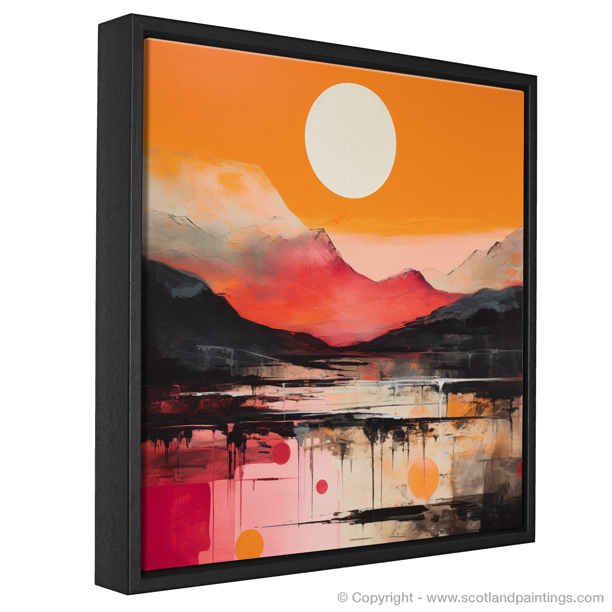 Emanating an aura of raw emotion and beauty, this exquisite print captures the essence of Glencoe’s sunset glow through the vibrant lens of Abstract Expressionism. Bold brushstrokes and an audaciously vivid palette of fiery oranges, deep reds, and gentle whites create a dynamic interplay of colour that dances across the canvas, reminiscent of the Scottish highlands bathed in the evening's amber light.
