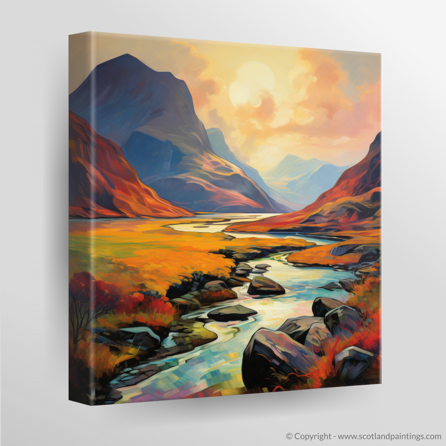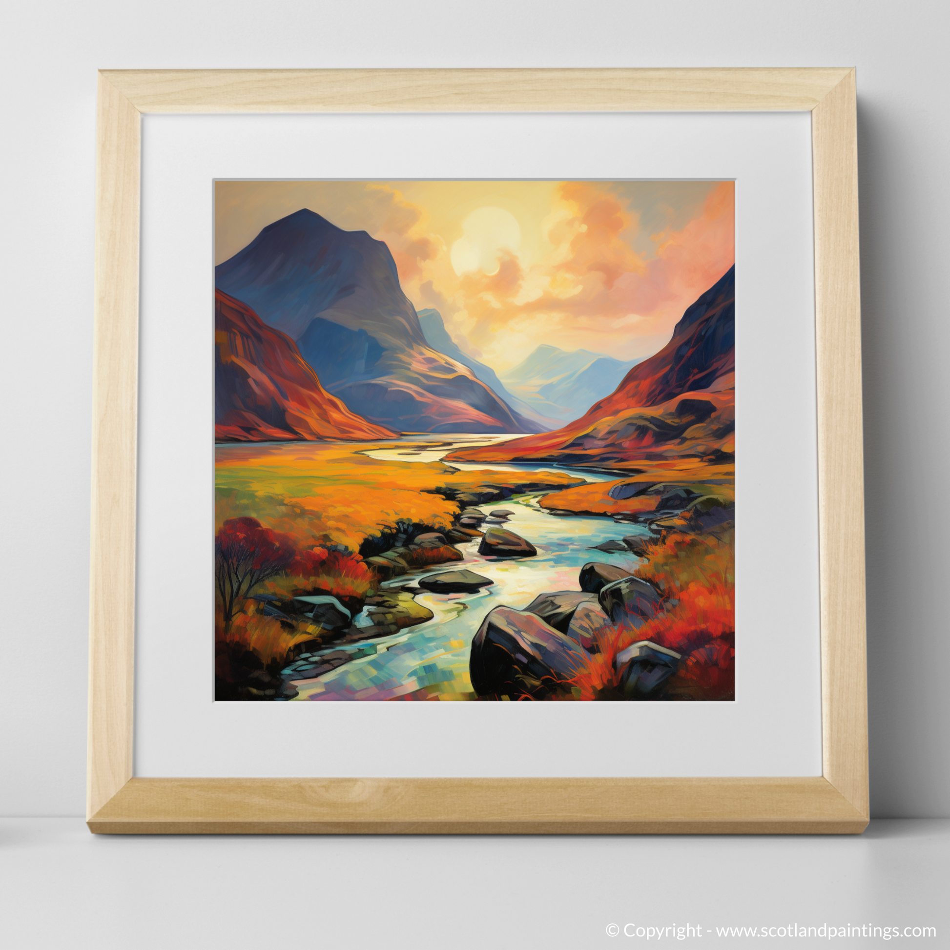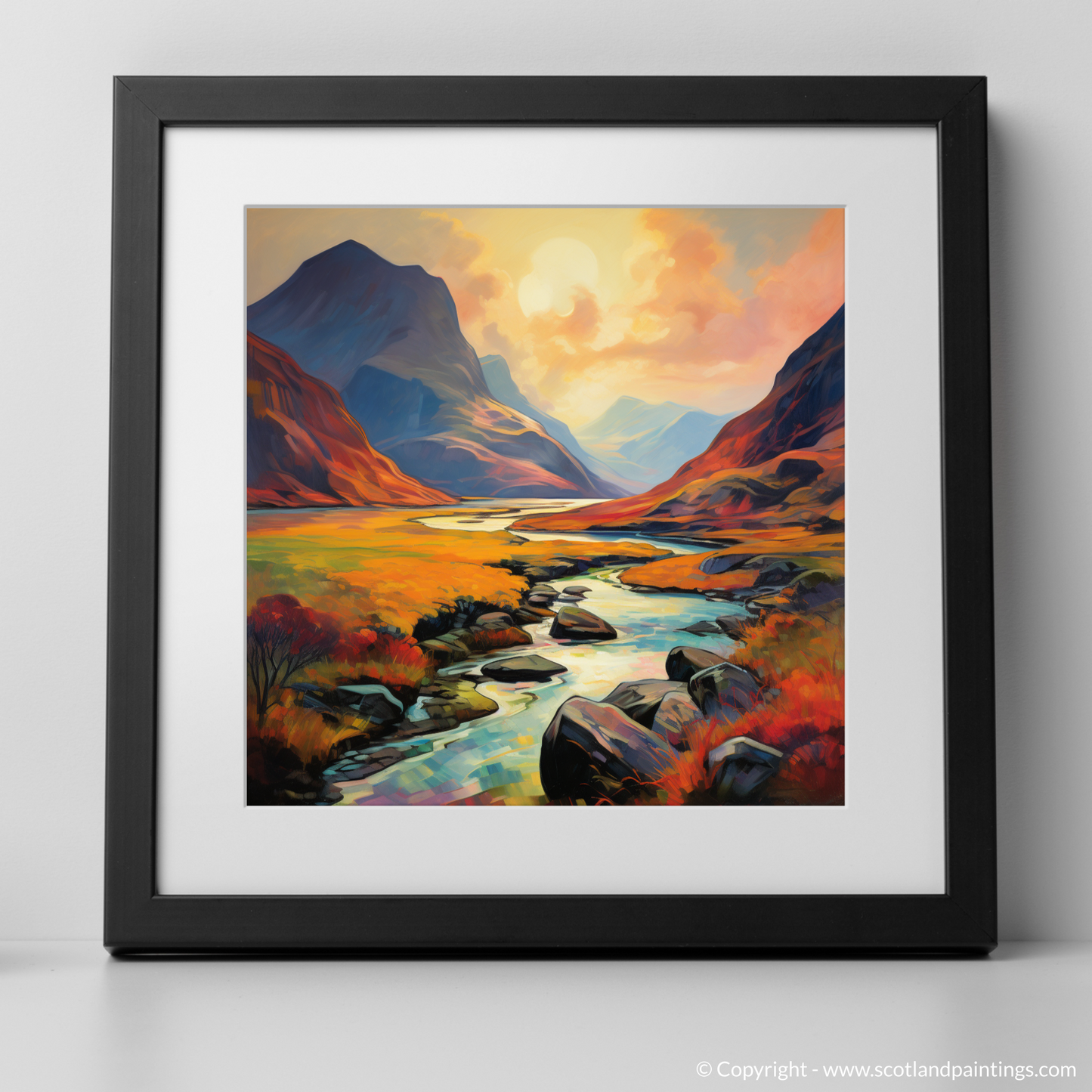 Heather and grass paint the valley floor in a carpet of burning yellows and fiery oranges, a testament to the untamed spirit of the Highlands. Through the Fauvist lens, this natural idyll transforms into a dreamlike tableau, where the senses are submerged in the sheer joy of colour and the raw, emotional resonance of the landscape itself.