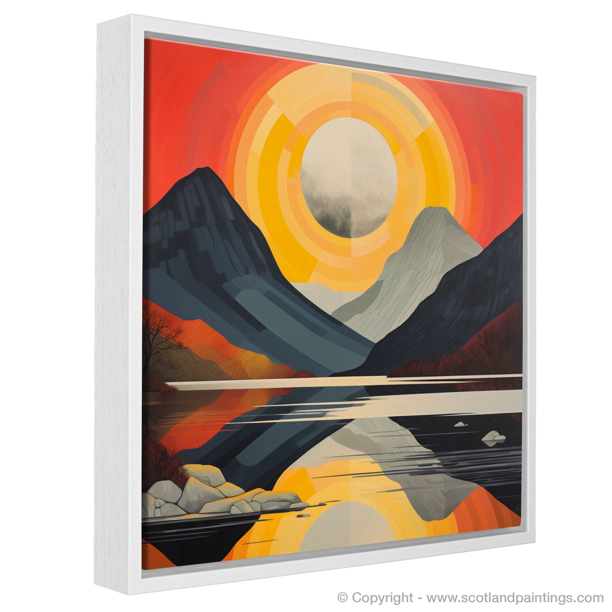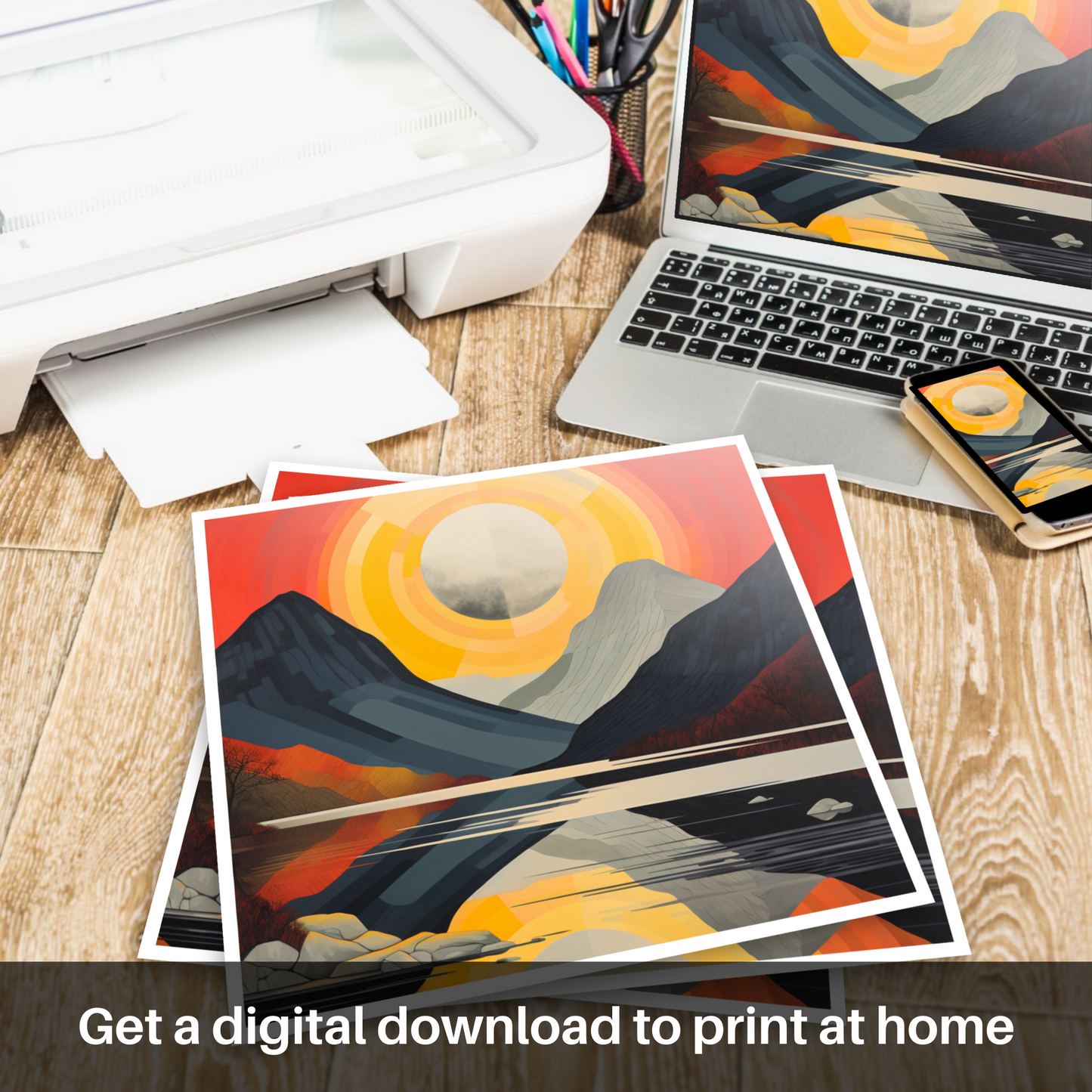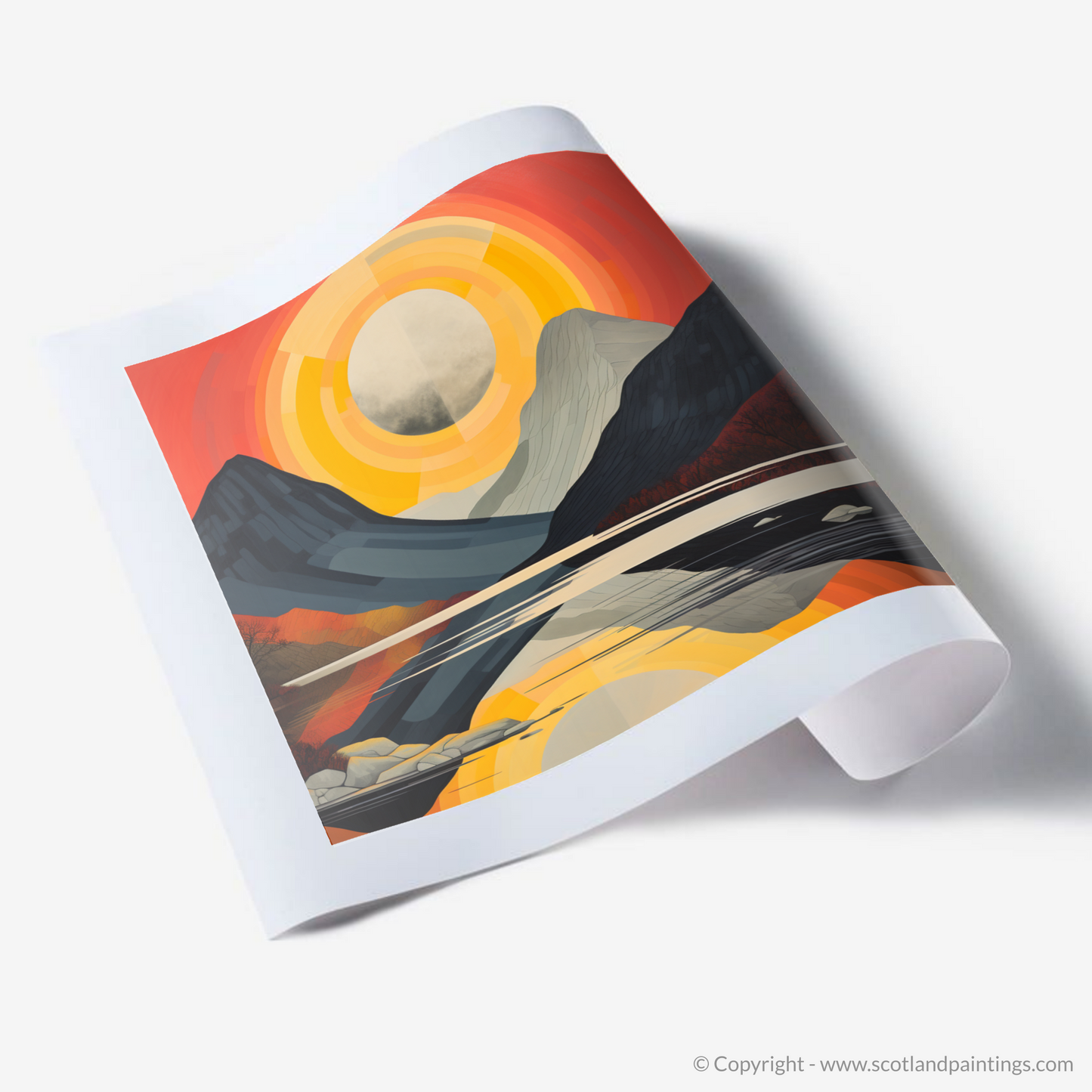 Awaken your senses and grace your space with the tranquil beauty of a Highland sunrise, distilled into the purest forms and colours by a masterstroke of minimalism. This mesmerising piece captures the serene essence of a Buachaille sunrise in Glencoe, encapsulated in a symphony of layered geometrical shapes and a harmonious palette.