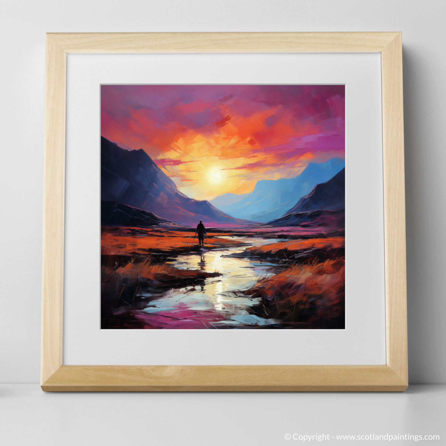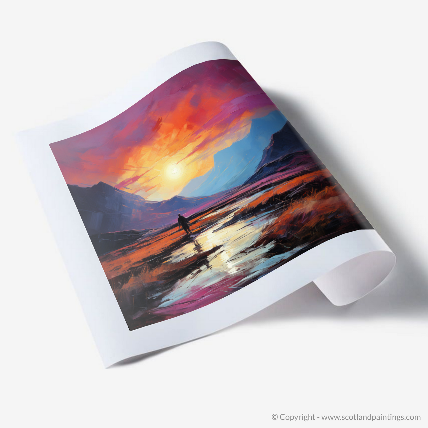 Immerse yourself in the vibrant splendour of the Scottish Highlands with this striking print that takes you to the heart of Glencoe at the approach of evening. In this expressive piece, bold, impassioned strokes of colour encapsulate the raw beauty of the landscape as the sky, a canvas itself, transitions through a spectrum of warm hues. Vivid oranges, fiery reds, and deep violets merge in an ephemeral dance, reminiscent of the spirited brushwork of the Fauvist masters.